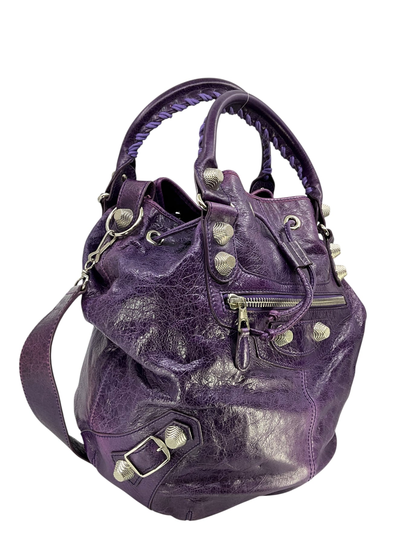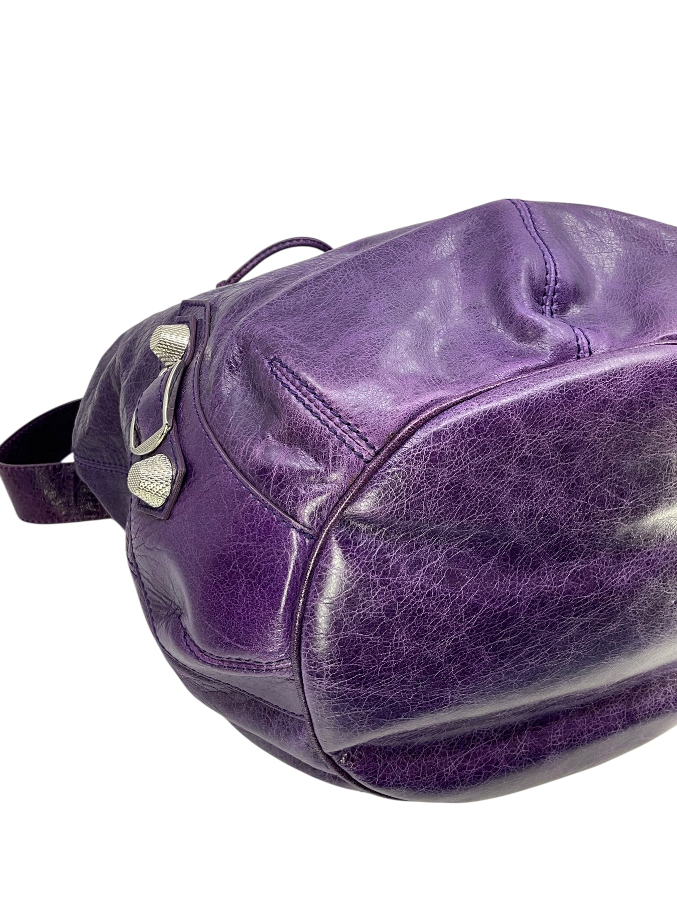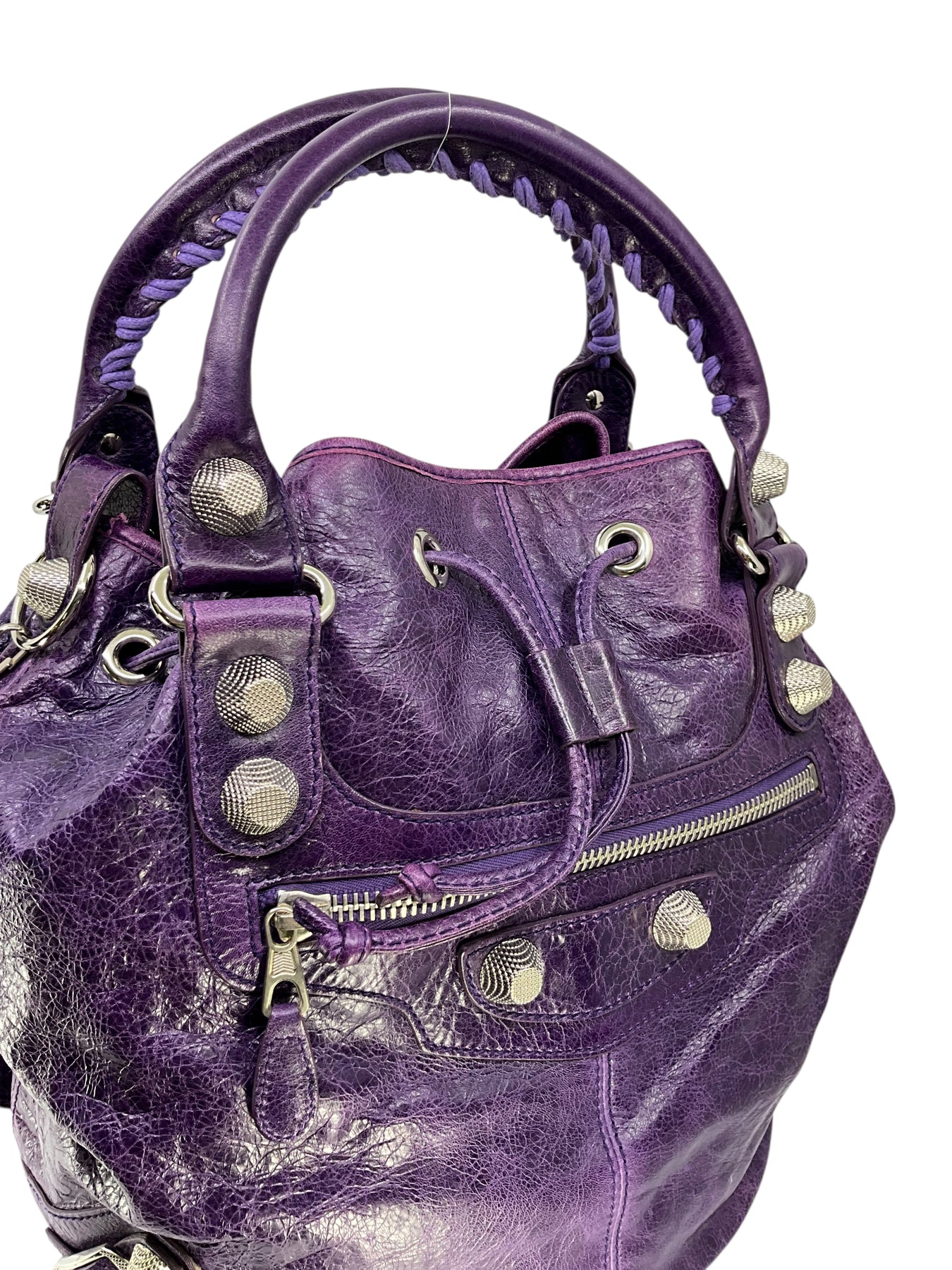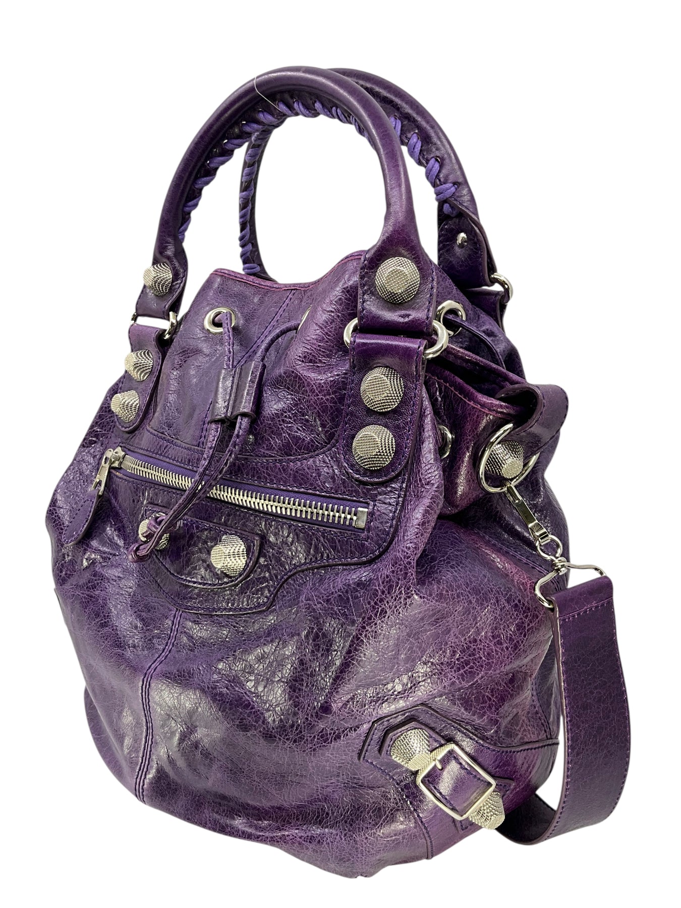 This is an authentic Balenciaga Lambskin Leather Giant 21 Silver PomPon Bag crafted from distressed purple lambskin and silver-tone hardware. Featuring whipstitched rolled leather handles, including a detachable strap with a flat shoulder pad, a front zip pocket and metal buckles and stud details.