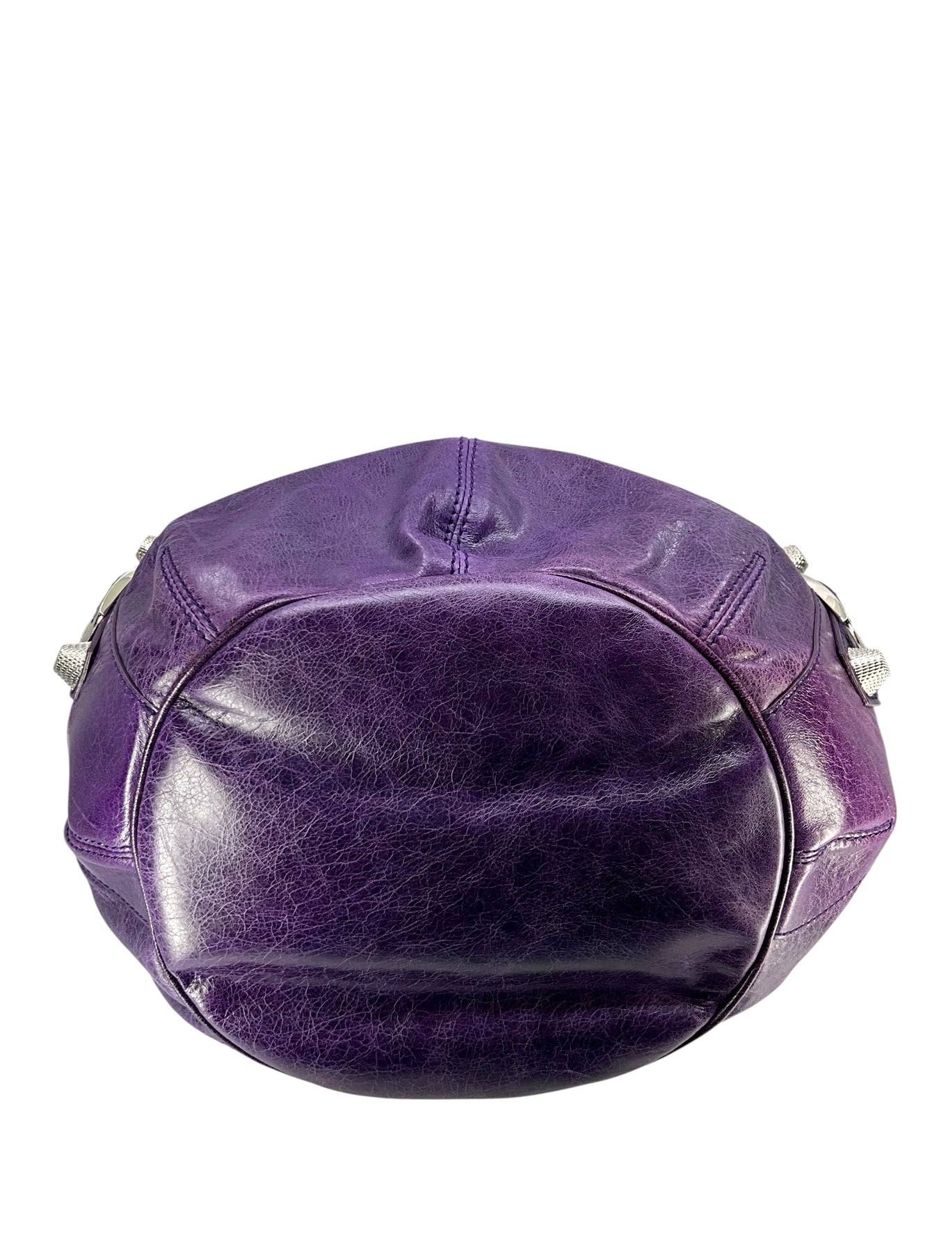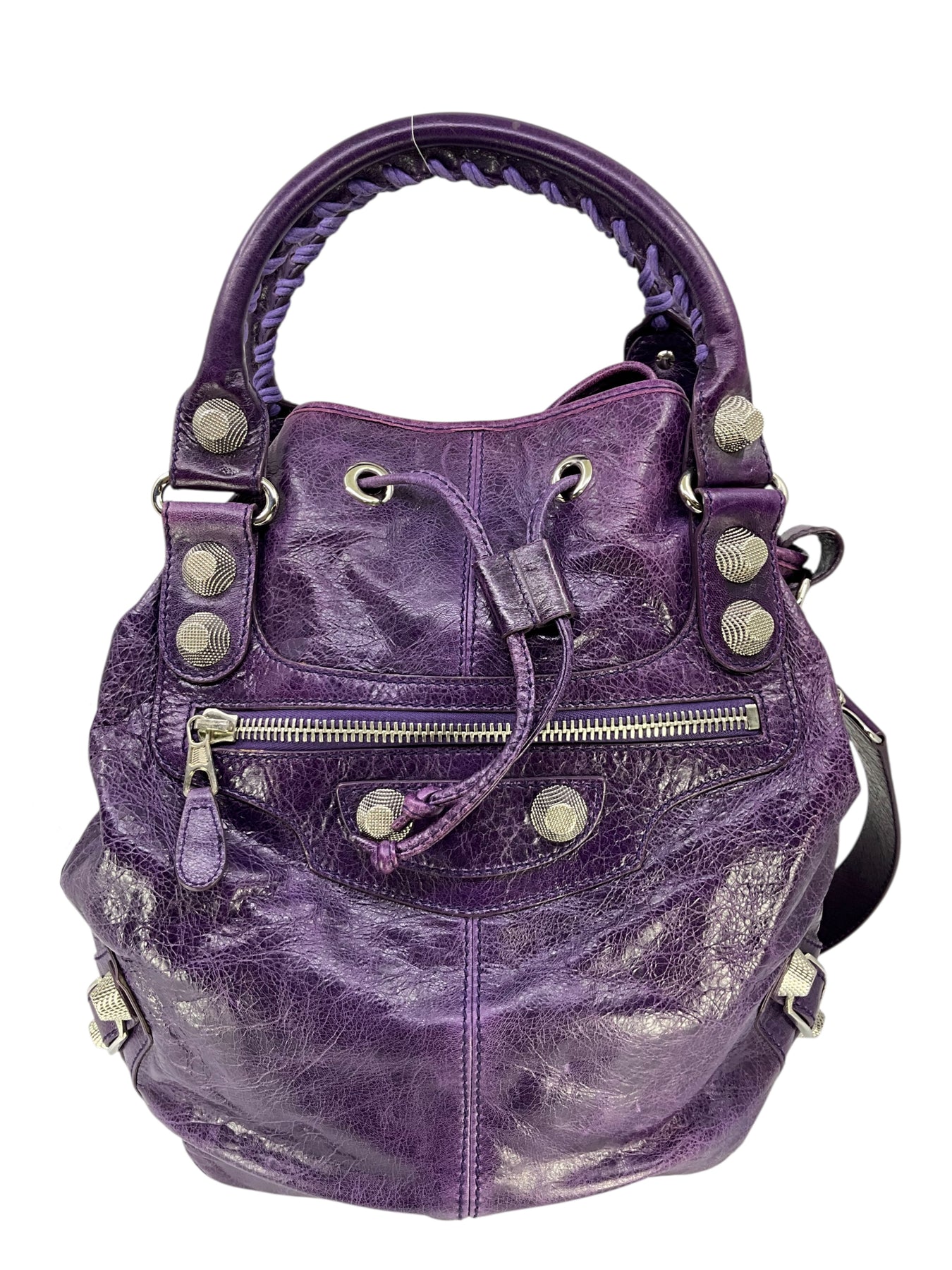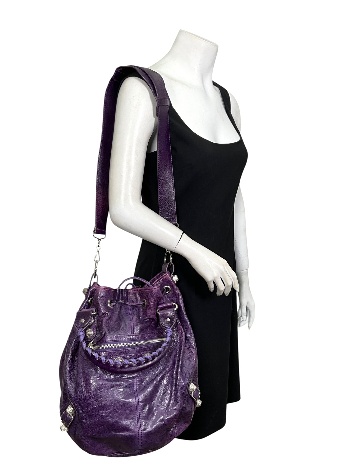 This is an authentic Balenciaga Lambskin Leather Giant 21 Silver PomPon Bag crafted from distressed purple lambskin and silver-tone hardware. Featuring whipstitched rolled leather handles, including a detachable strap with a flat shoulder pad, a front zip pocket and metal buckles and stud details.
