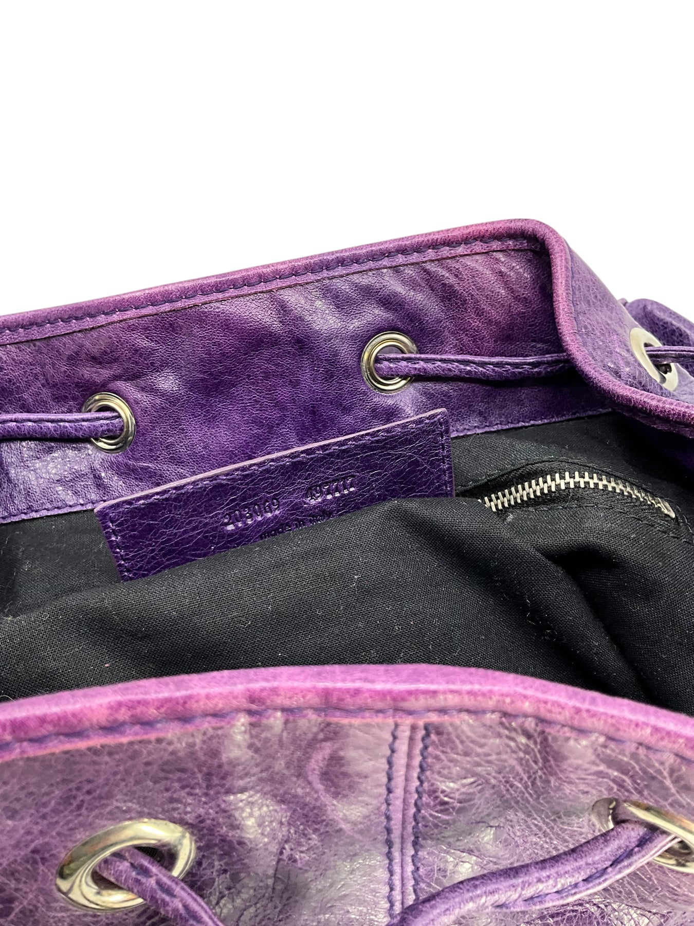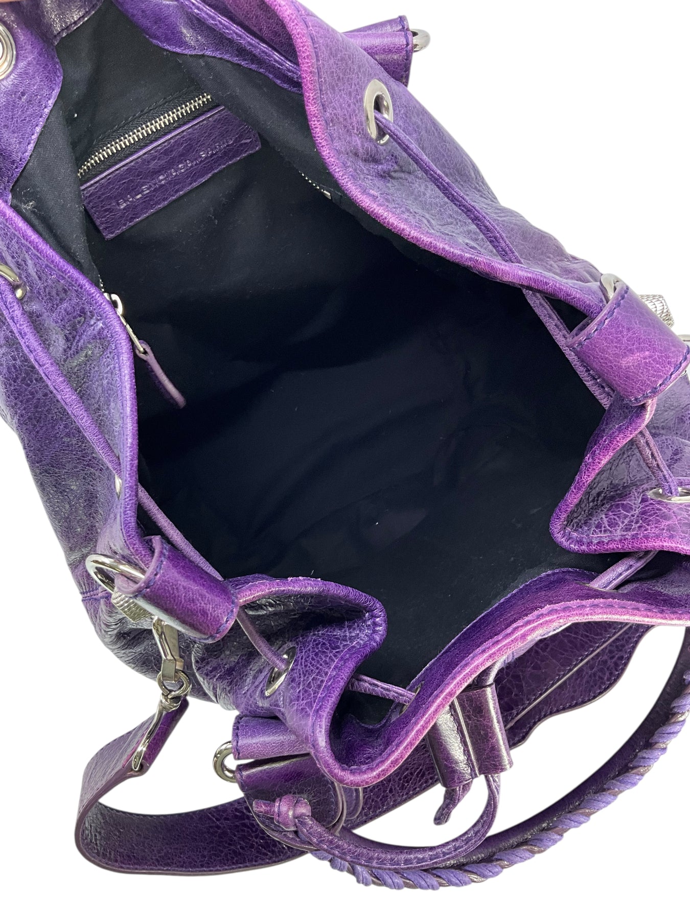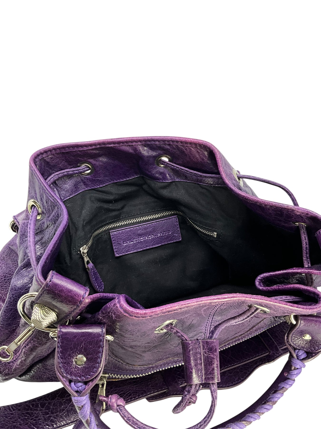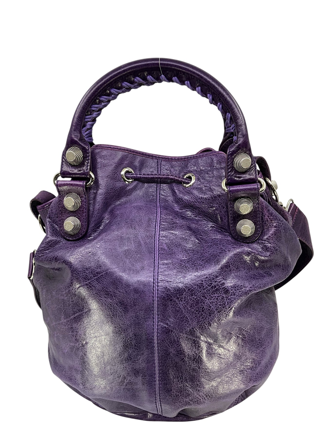 This is an authentic Balenciaga Lambskin Leather Giant 21 Silver PomPon Bag crafted from distressed purple lambskin and silver-tone hardware. Featuring whipstitched rolled leather handles, including a detachable strap with a flat shoulder pad, a front zip pocket and metal buckles and stud details.