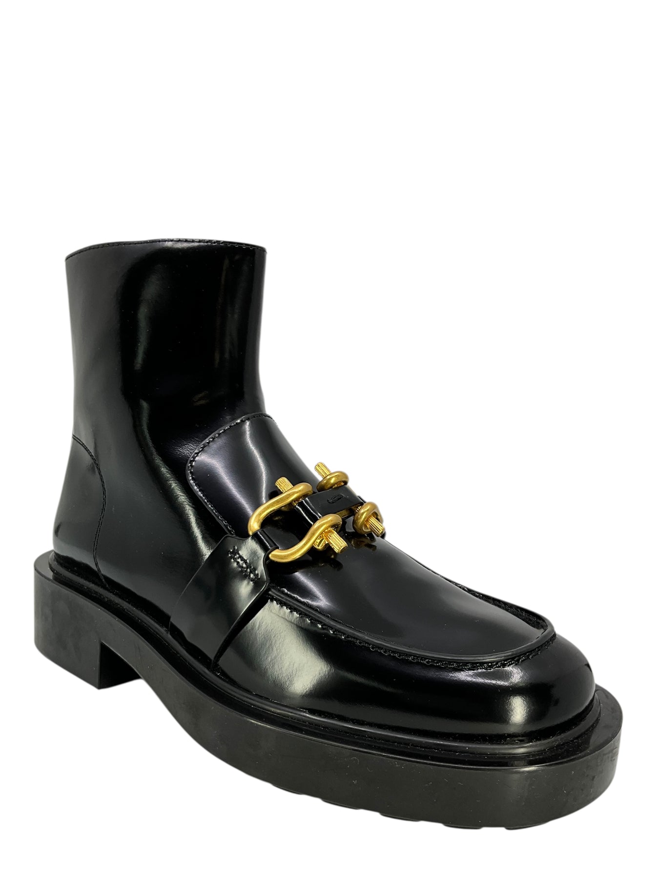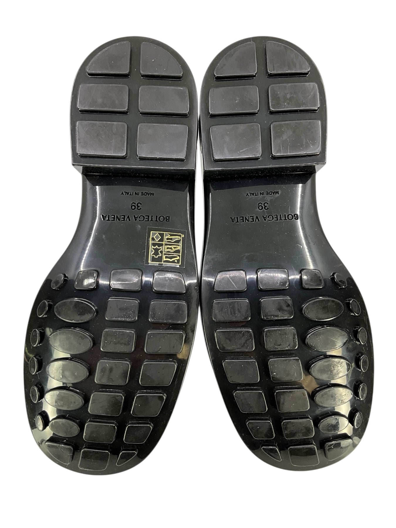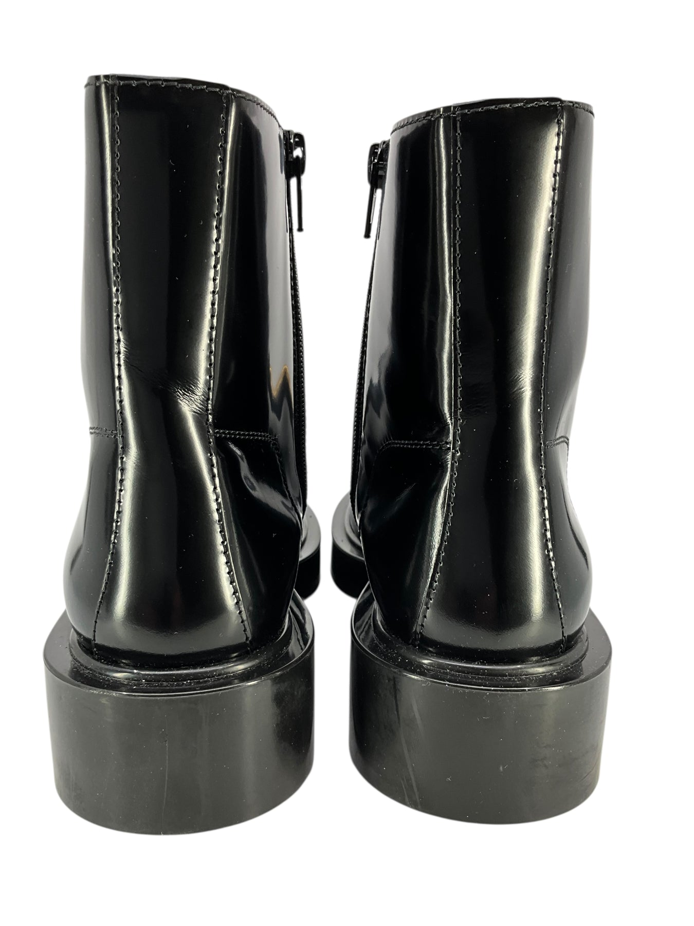 We guarantee authenticity of these Bottega Veneta Monsieur Ankle Boot Size 9 crafted from glossy black calf leather with a round toe. These boots feature a round toe, side zip closures, glossy finish, and a chunky lugged rubber outsole.
