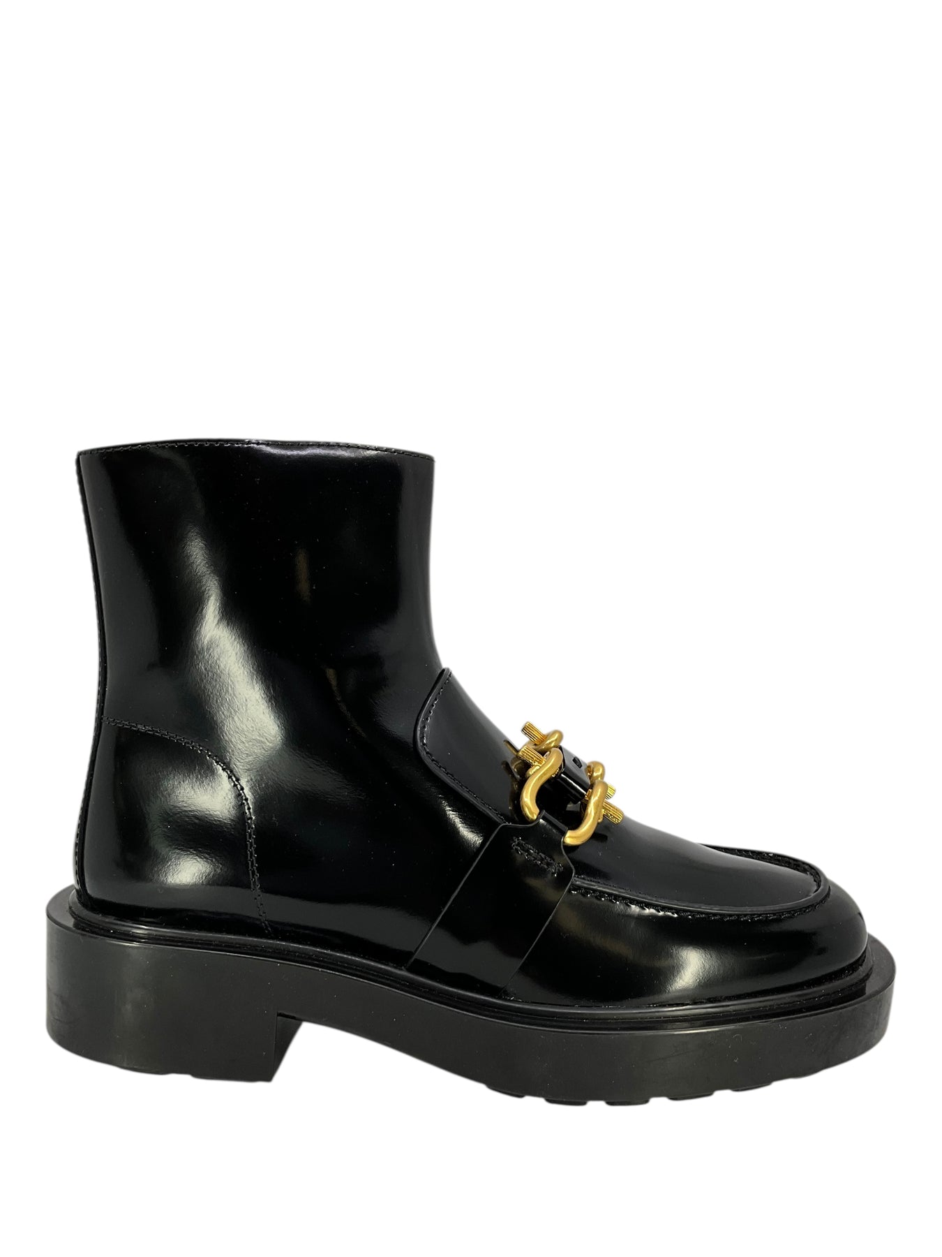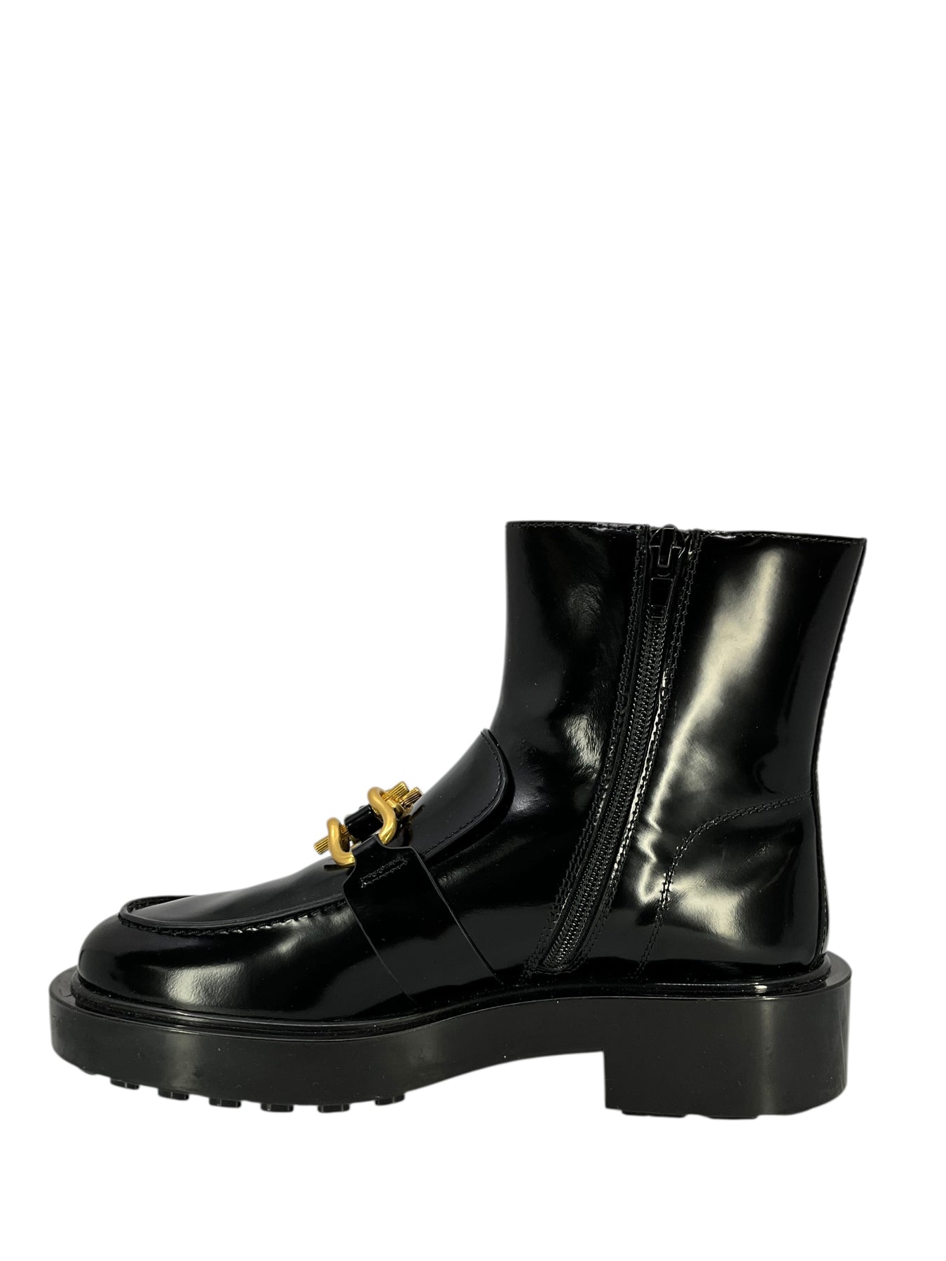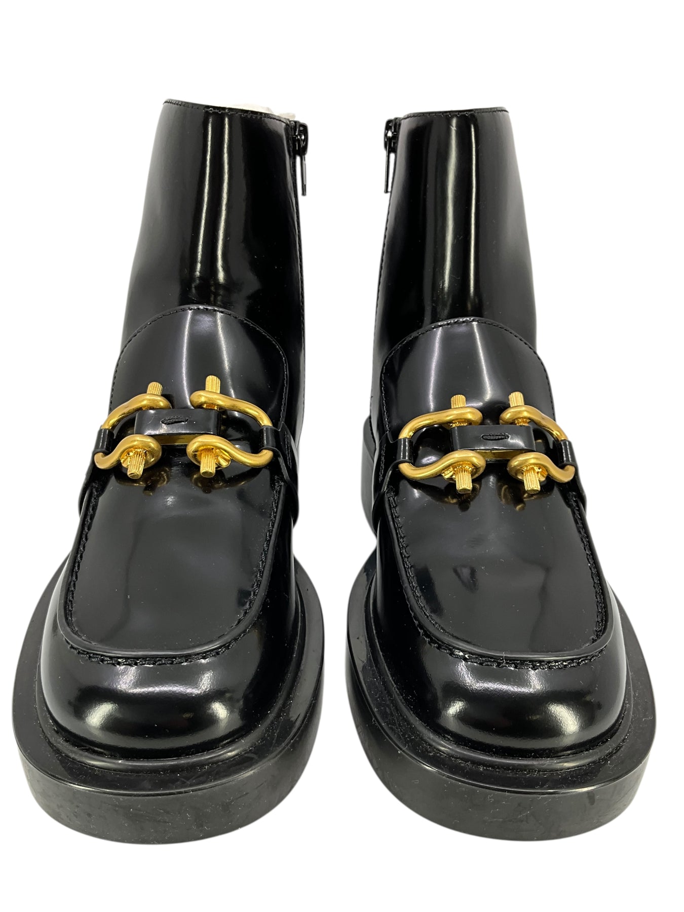 We guarantee authenticity of these Bottega Veneta Monsieur Ankle Boot Size 9 crafted from glossy black calf leather with a round toe. These boots feature a round toe, side zip closures, glossy finish, and a chunky lugged rubber outsole.