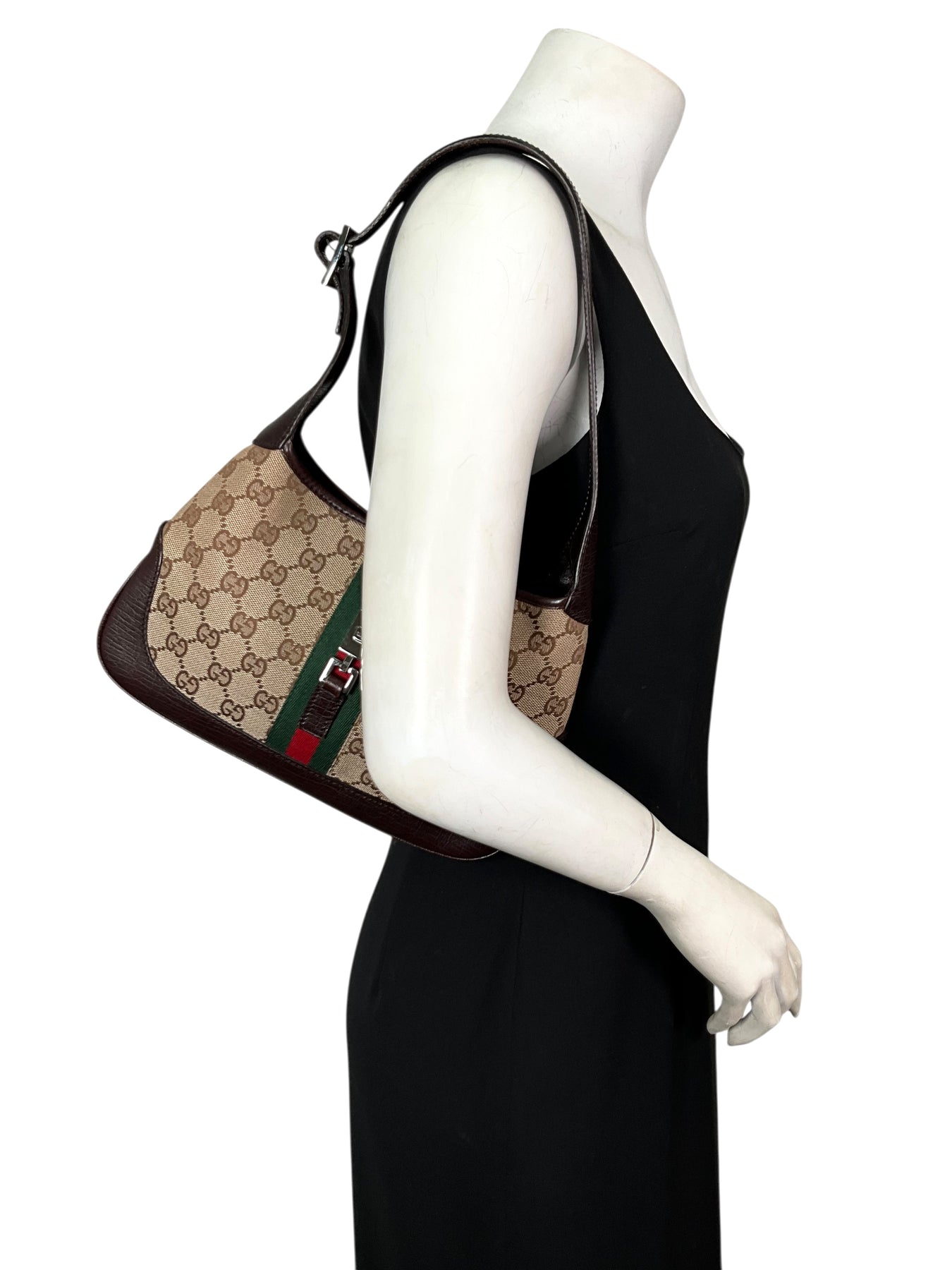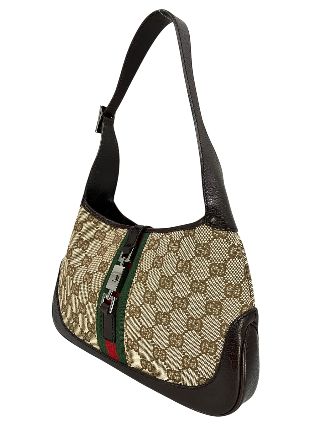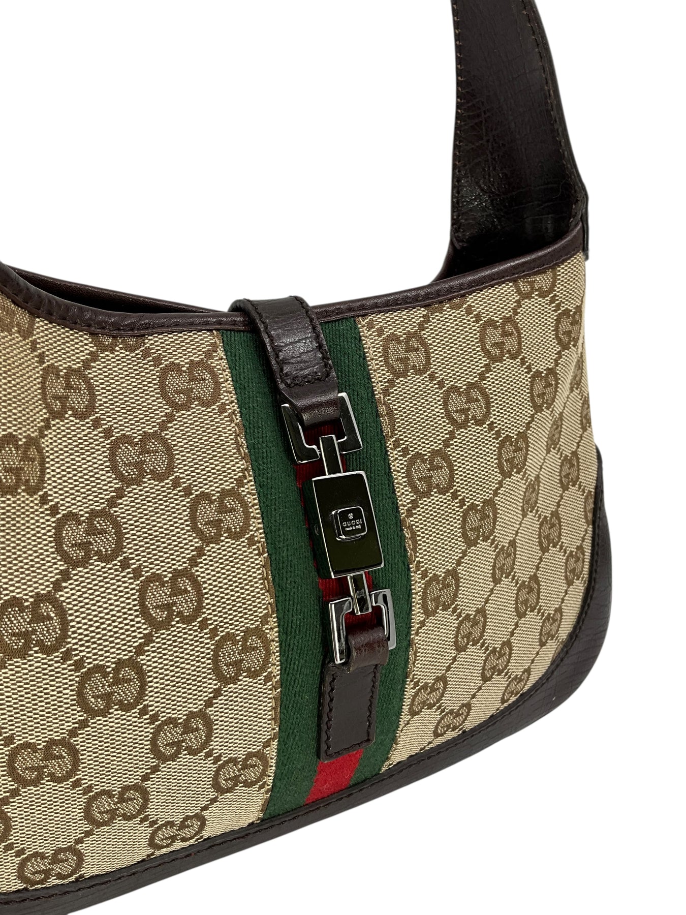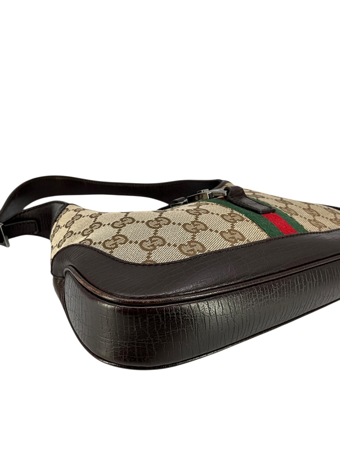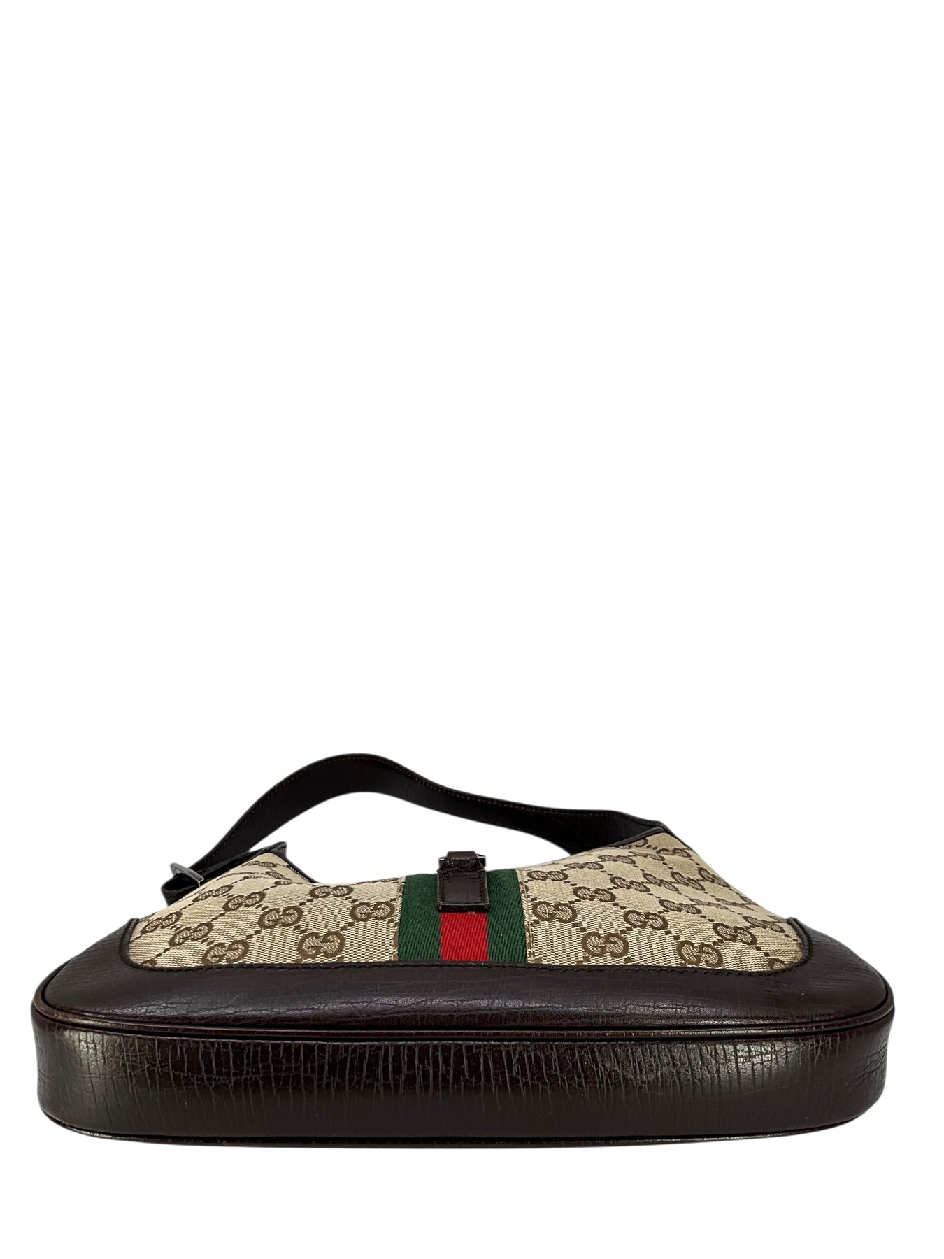 Guaranteed authentic Gucci Monogram Canvas Jackie Hobo Bag crafted in brown monogram canvas with a luxurious brown leather trim. This classic bag features a flat leather shoulder strap and is accented with a signature logo-engraved piston-lock closure.