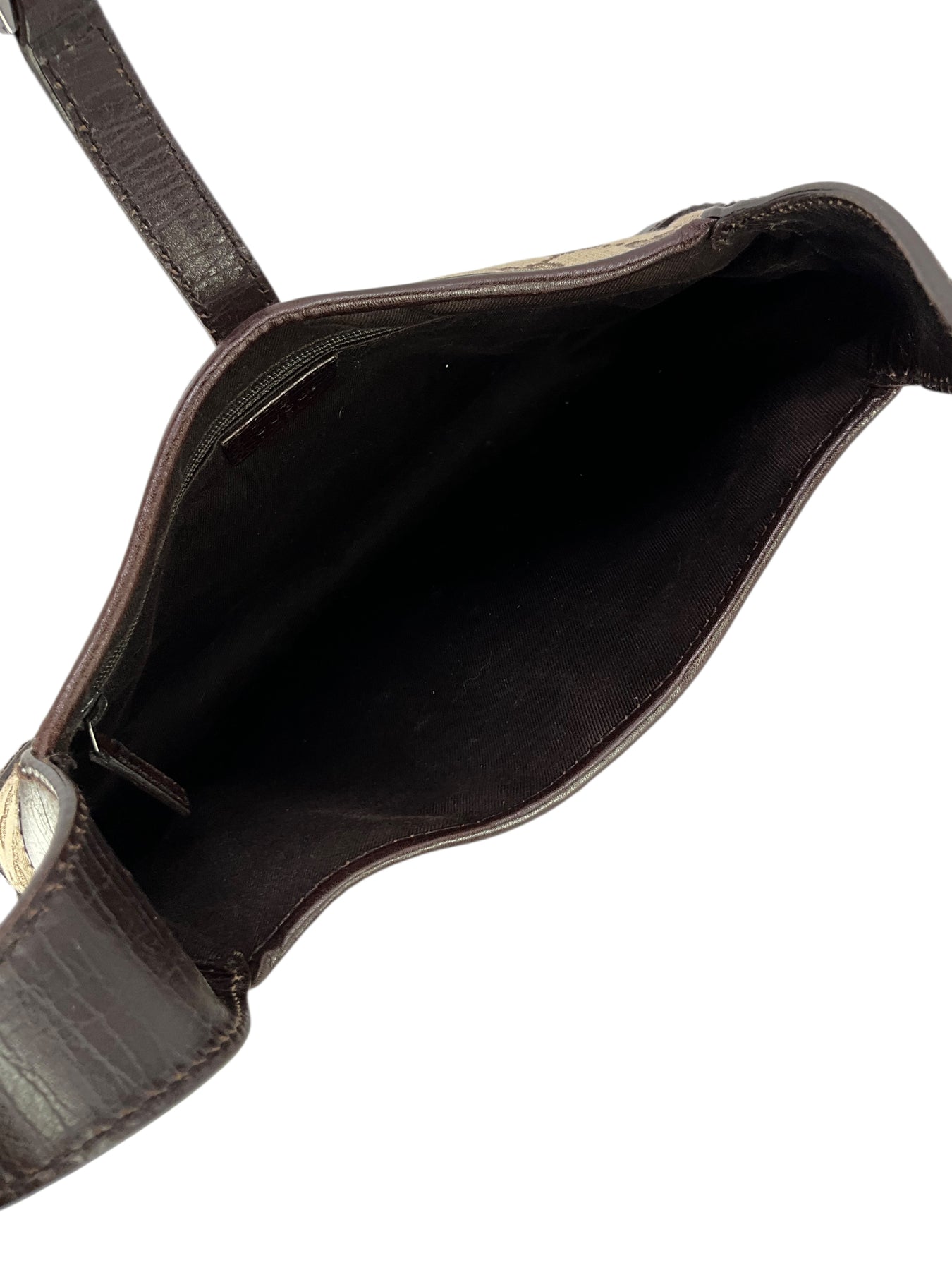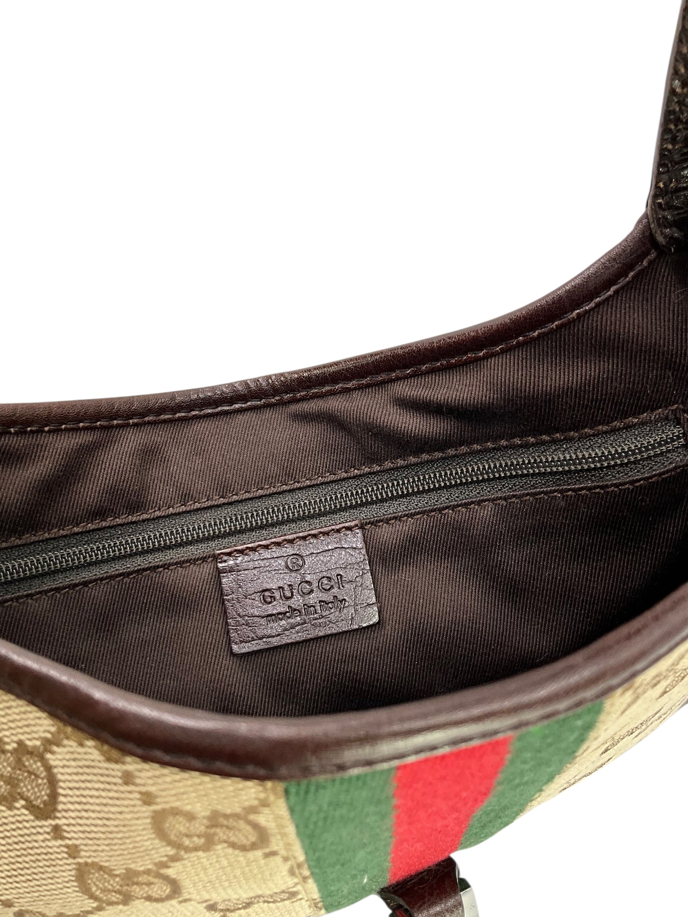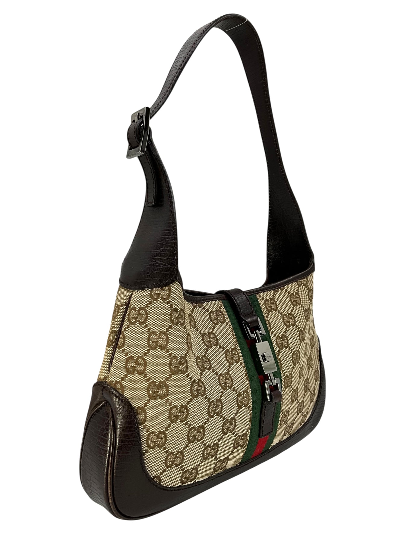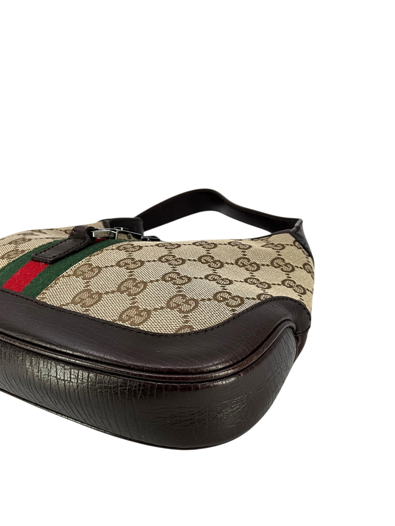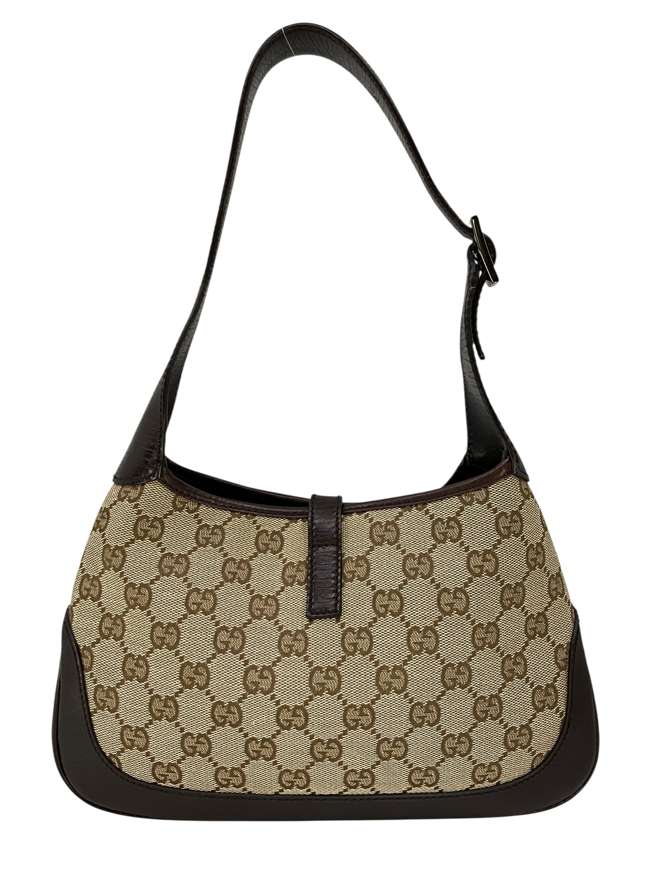 Guaranteed authentic Gucci Monogram Canvas Jackie Hobo Bag crafted in brown monogram canvas with a luxurious brown leather trim. This classic bag features a flat leather shoulder strap and is accented with a signature logo-engraved piston-lock closure.