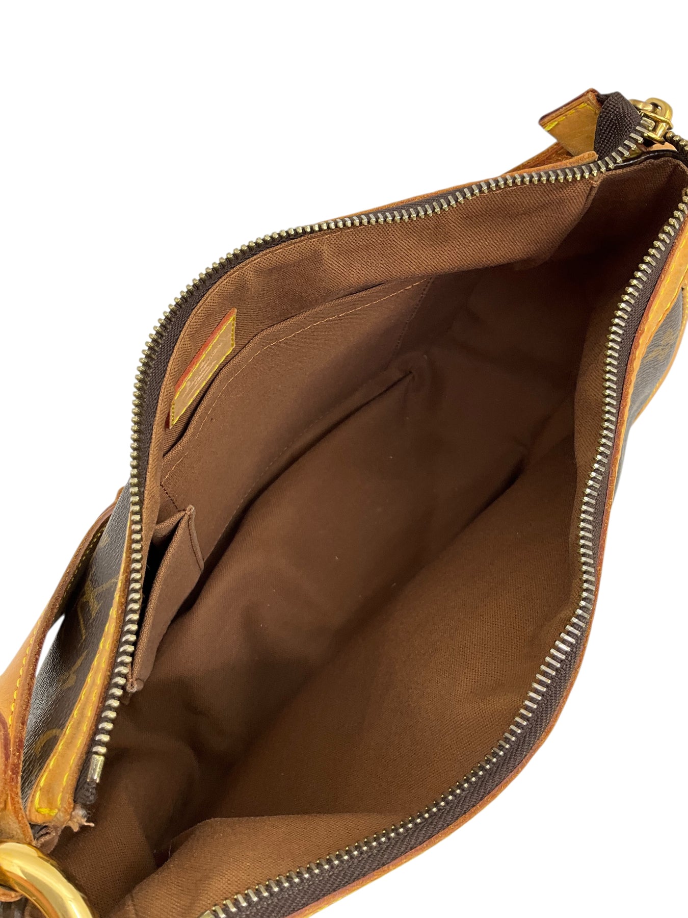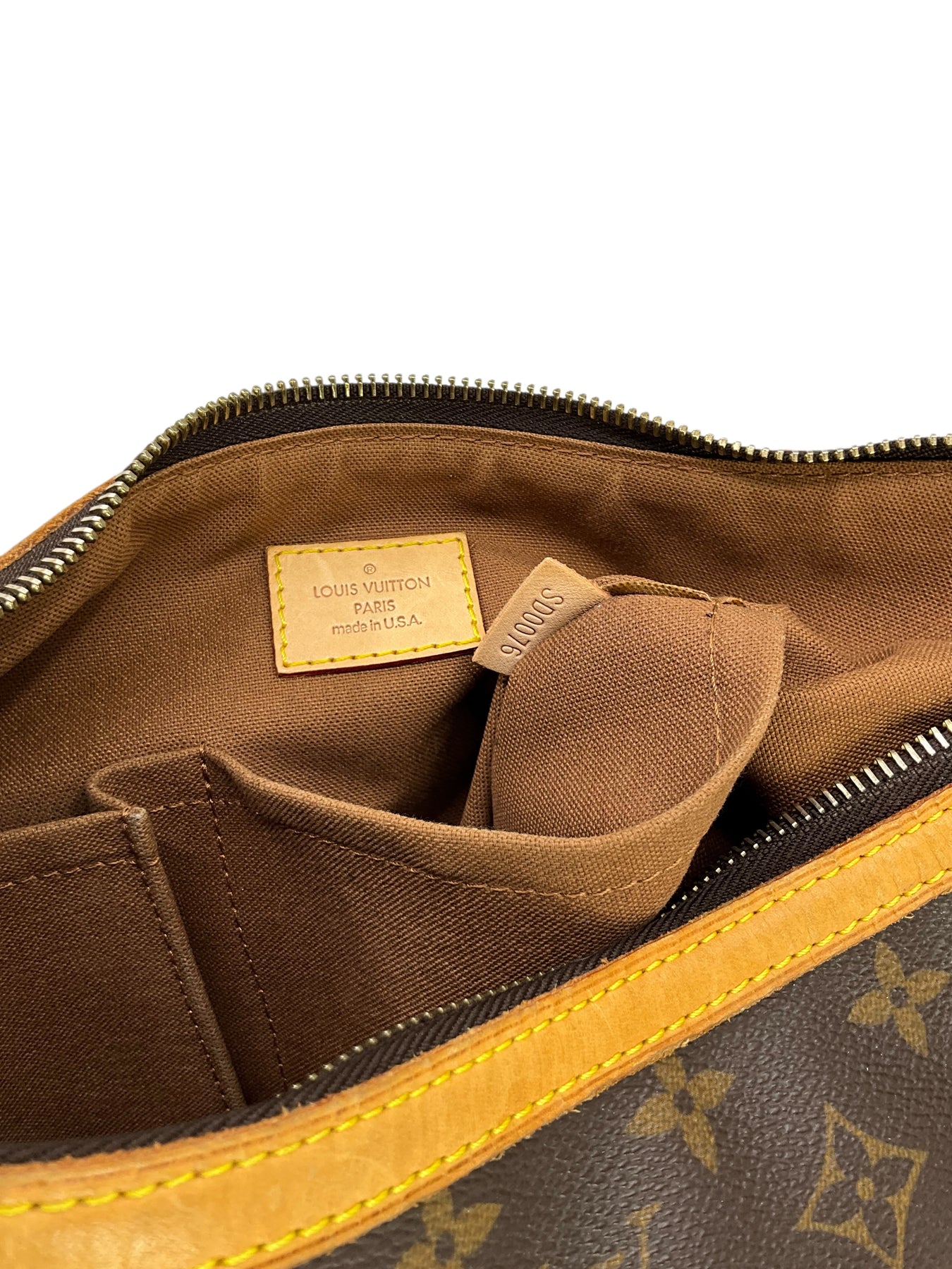 Condition: Very Good. The exterior canvas feels like-new. Its soft and buttery. Mild patina on the leather trim. The shoulder strap has creasing on the under-sides. The gold-tone hardware shines bright with some thin surface scratches. The interior is like-new.