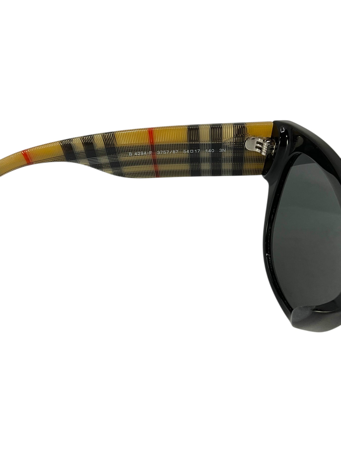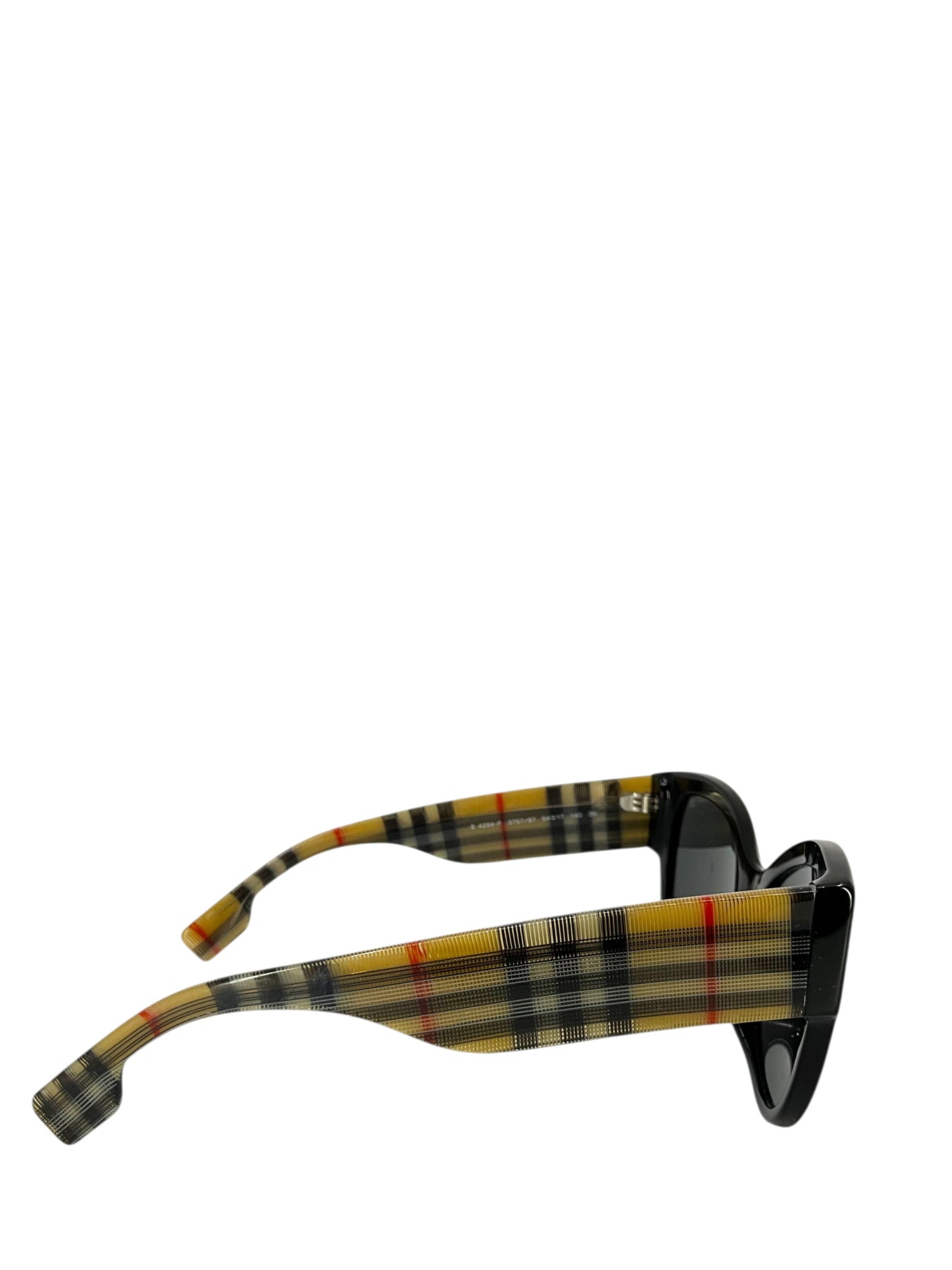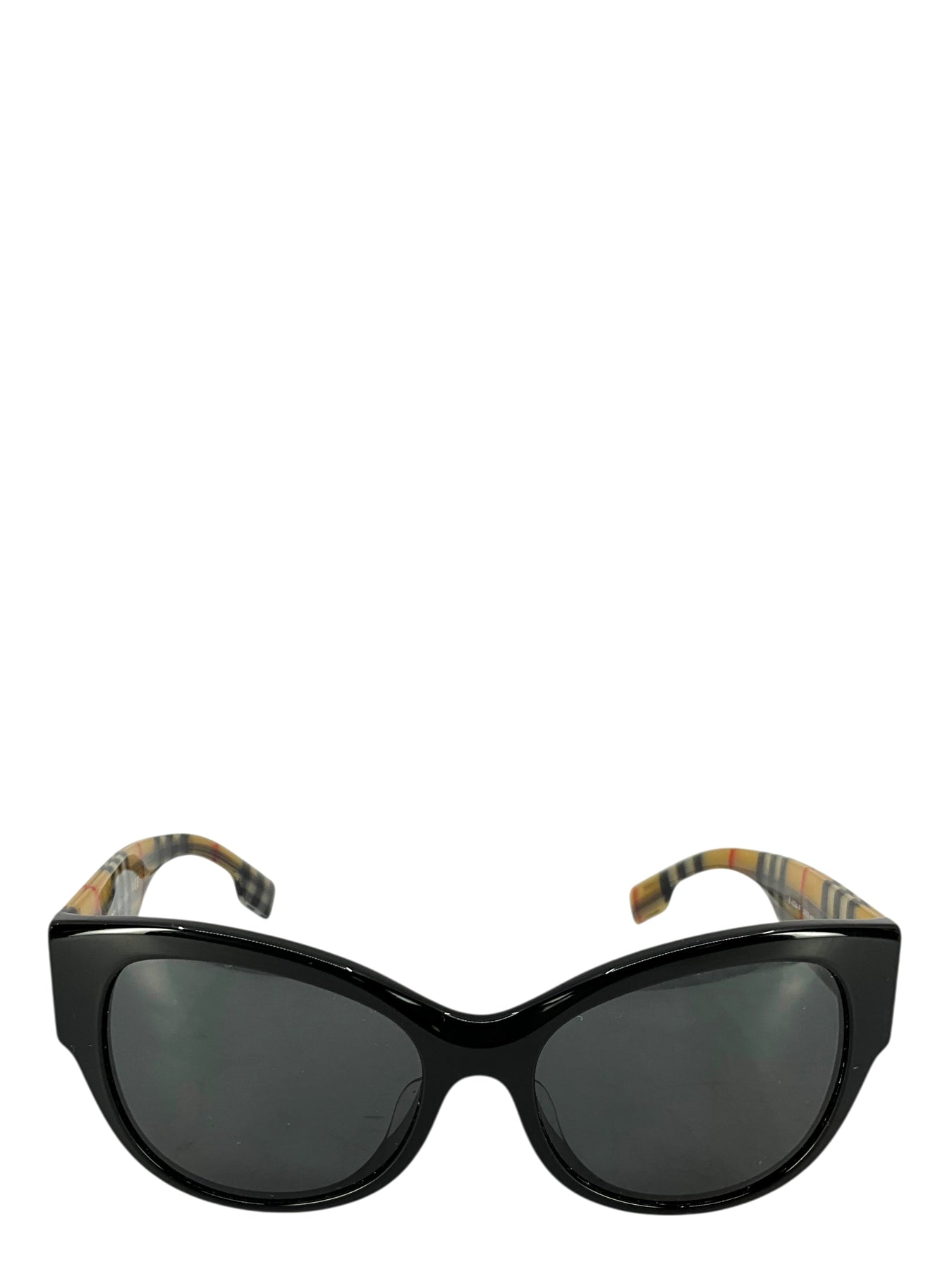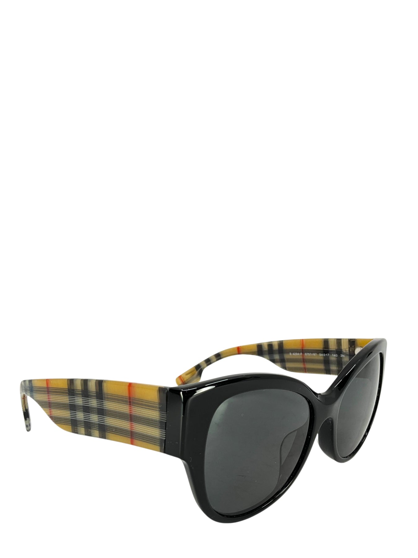 We guarantee authenticity of these BURBERRY Check BE4261F Sunglasses featuring cat eye black frames with signature plaid checkered arms.