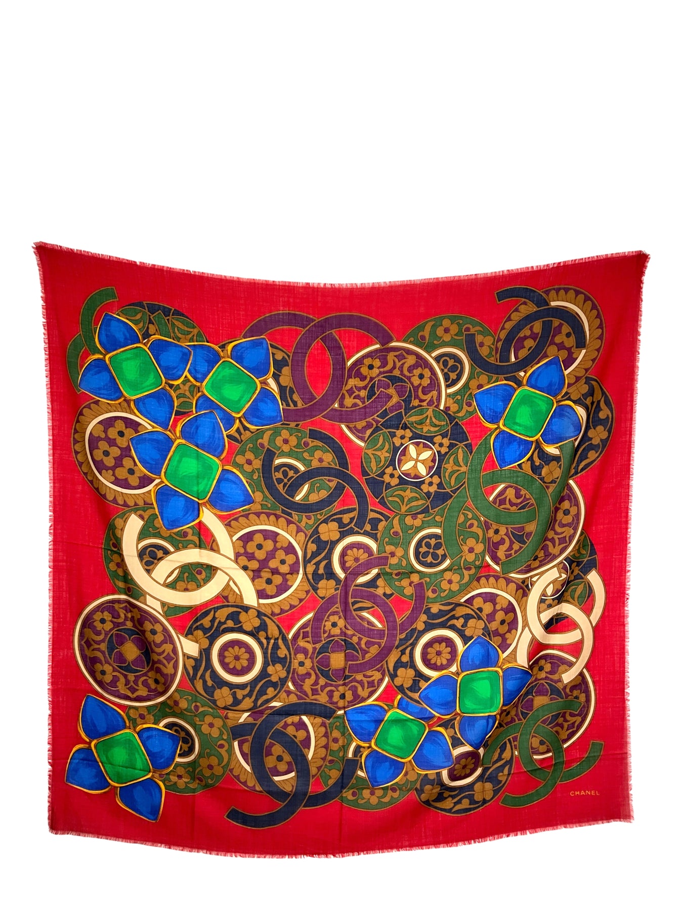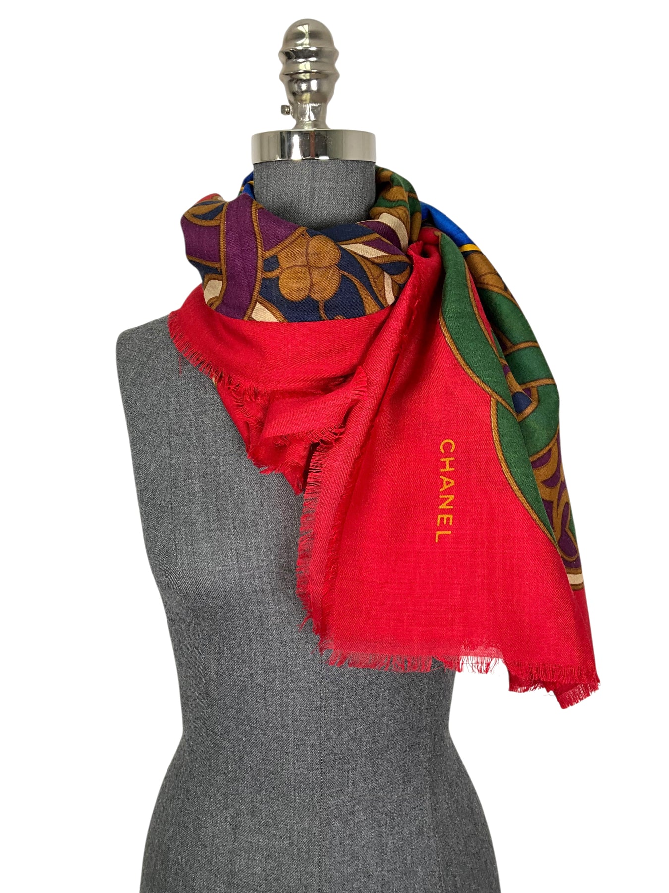 We guarantee the authenticity of this extremely rare Chanel CC Logo Print Wool Scarf Shawl in beautiful red and multicolor hues.