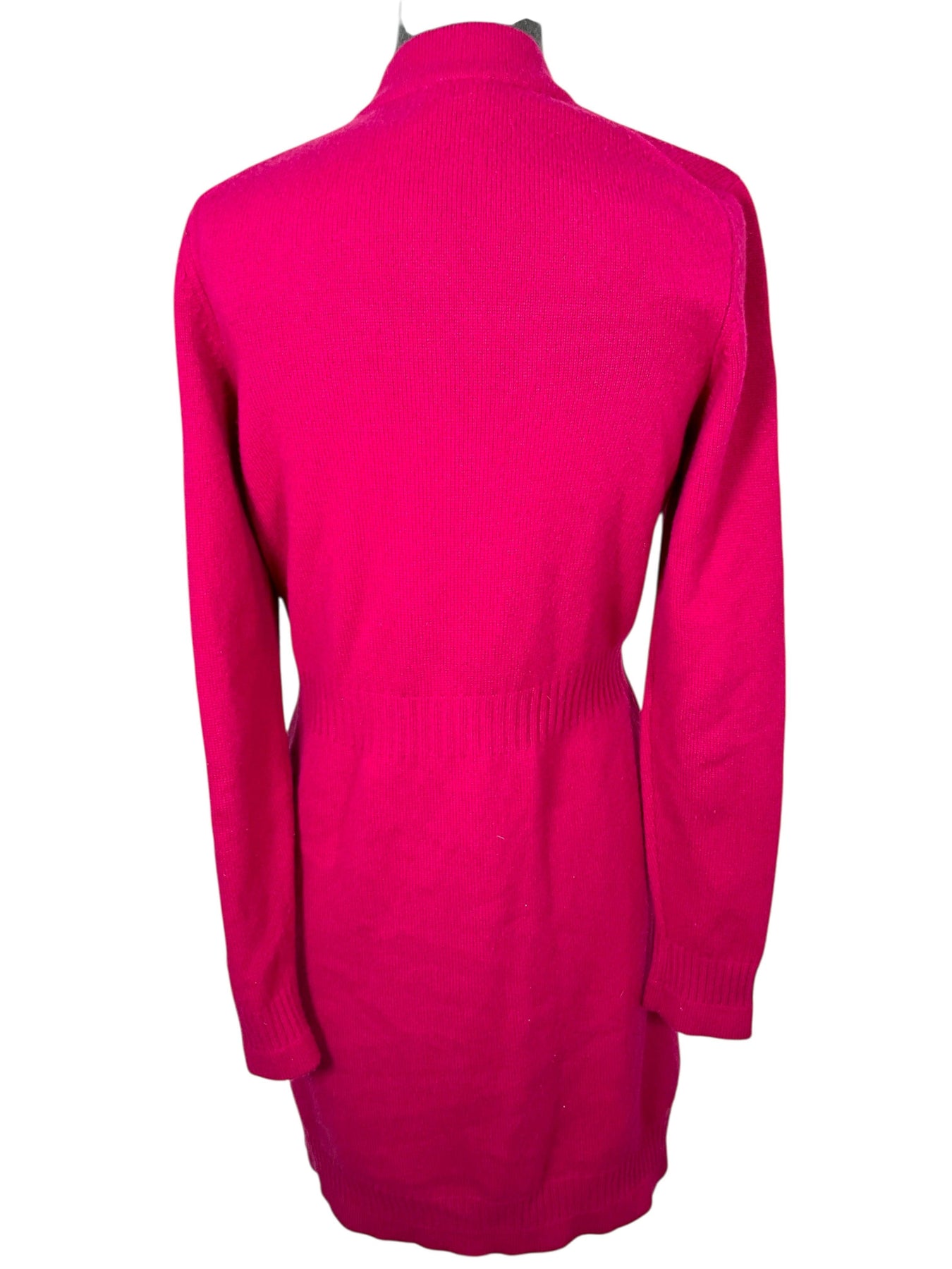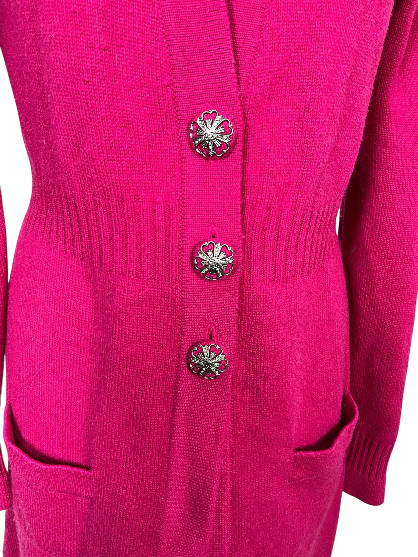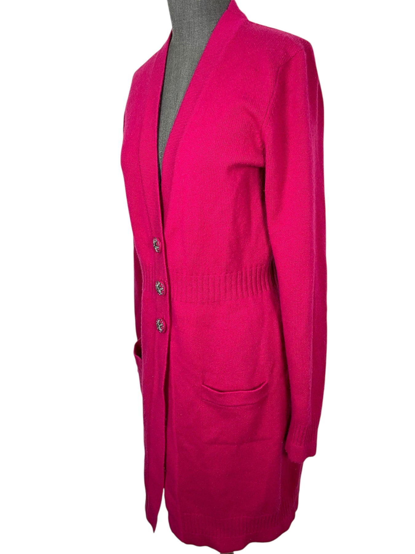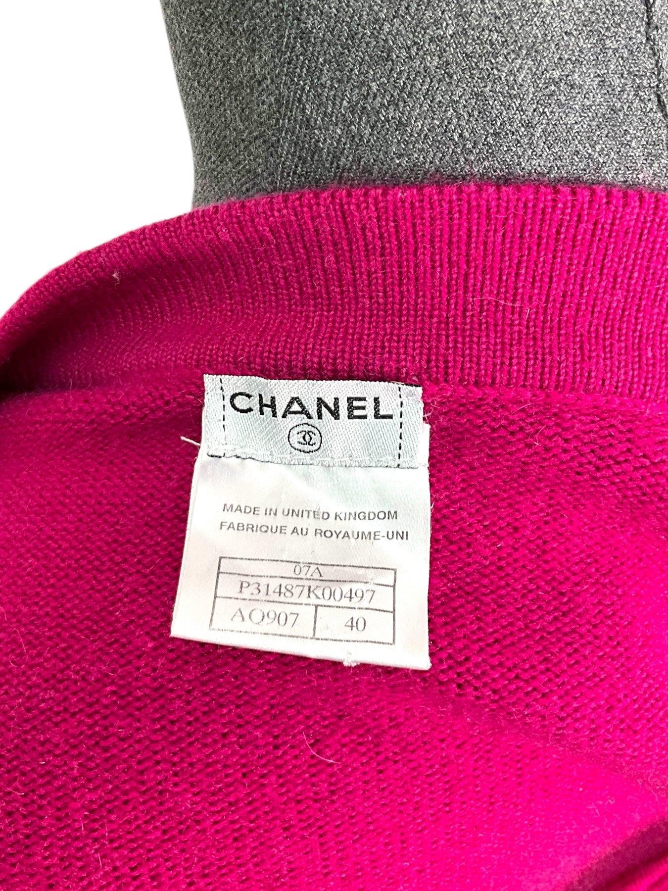 We guarantee the authenticity of this CHANEL 07A Cashmere CC Logo Button Long Cardigan Size M (FR 40) expertly crafted from a beautiful fuchsia cashmere with two lower-front patch pockets and signature CC button closures.