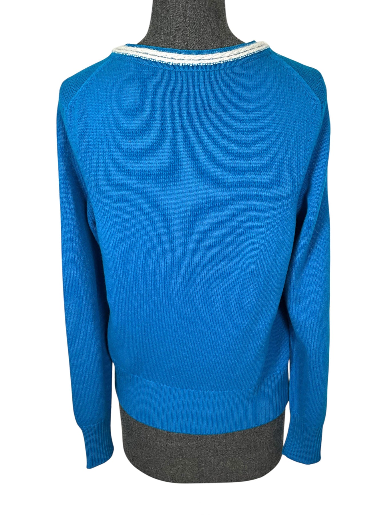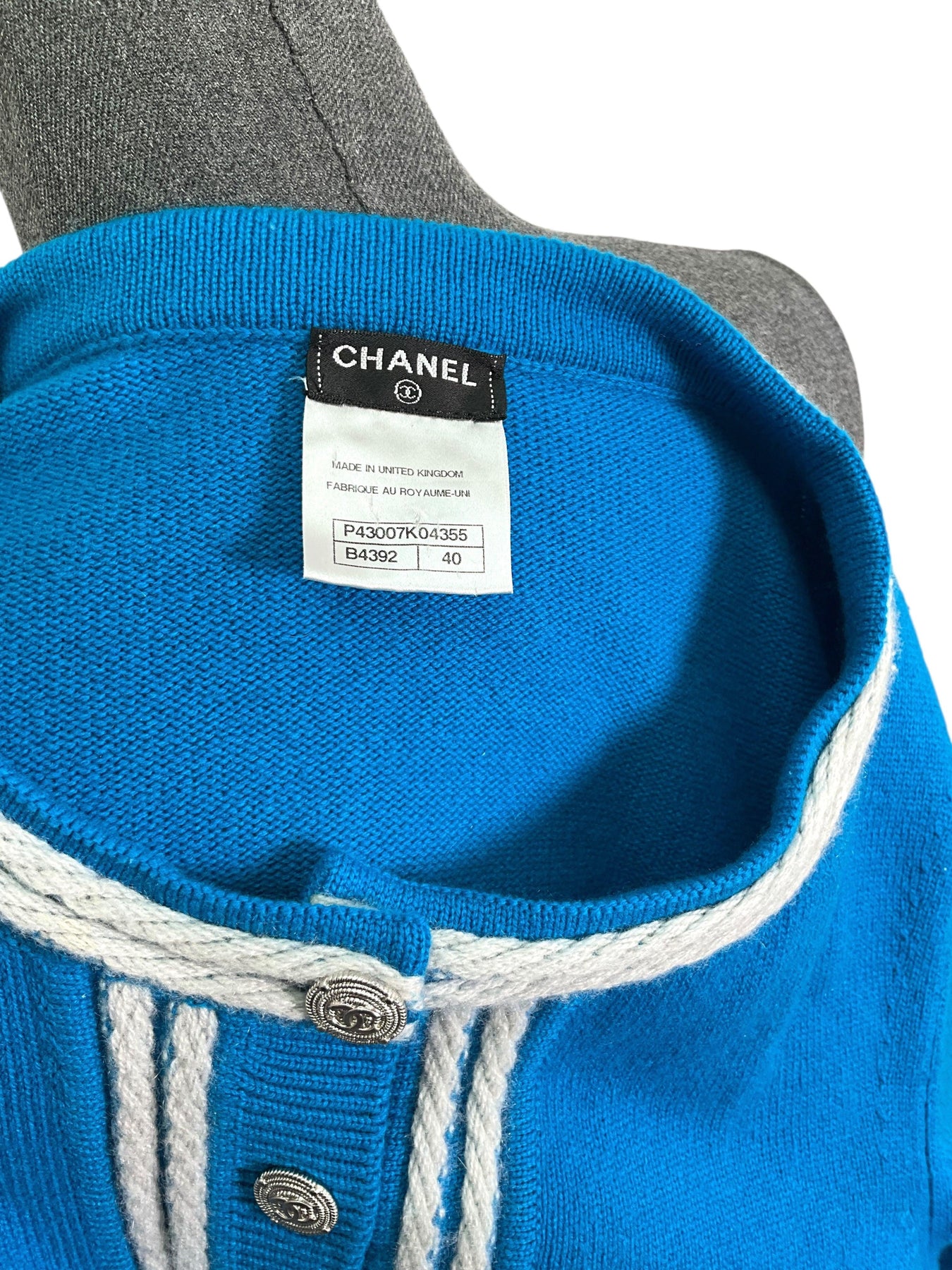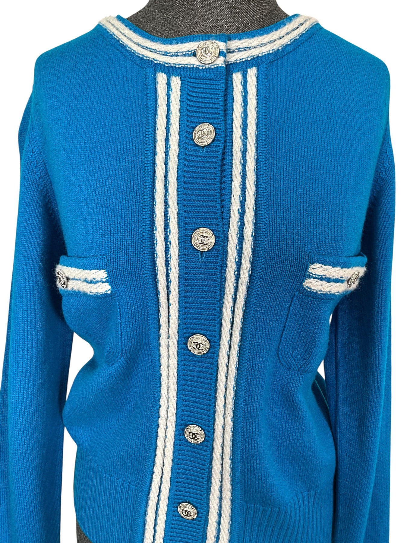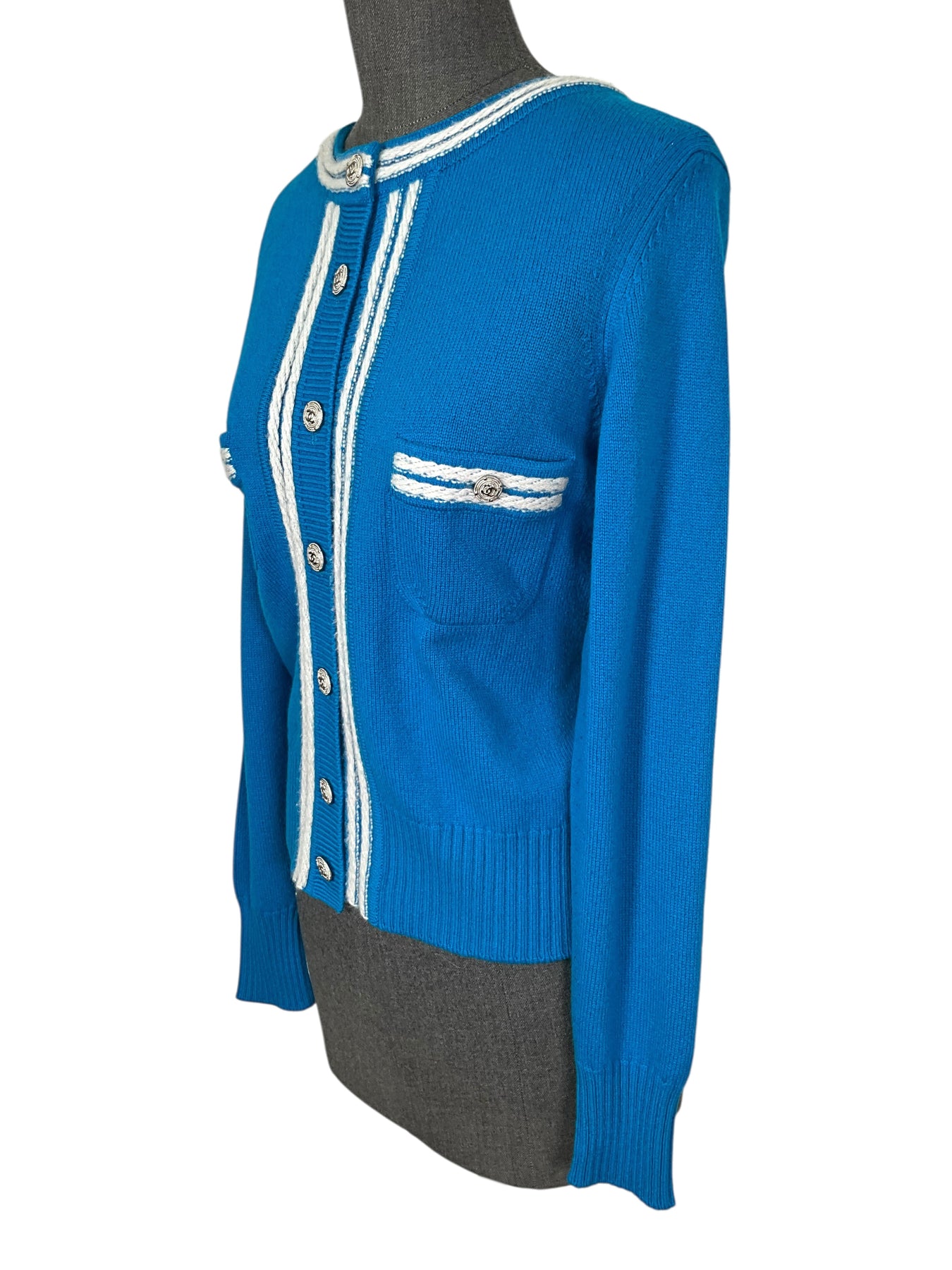 We guarantee the authenticity of this CHANEL Cashmere CC Logo Button Cardigan Size M (FR 40) expertly crafted from a beautiful blue cashmere with a white braided trim, two chest pockets and silver-tone signature CC button closures.