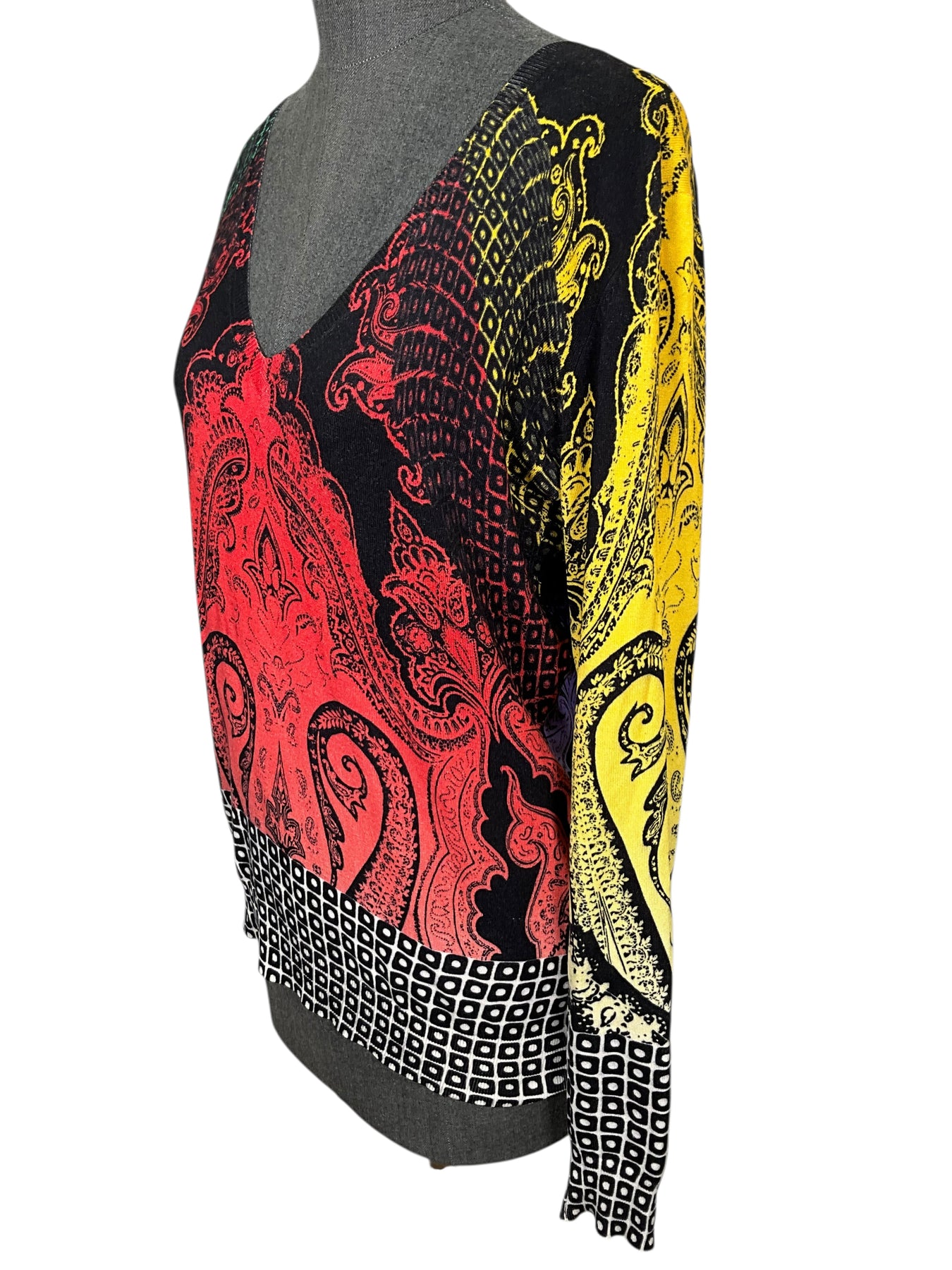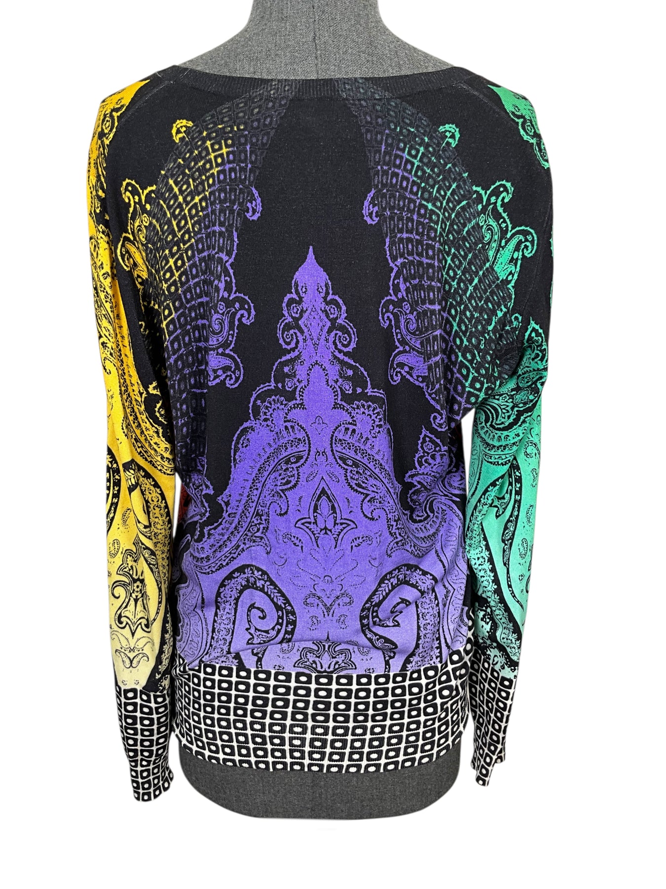 We guarantee the authenticity of this beautiful ETRO Paisley Printed Silk Sweater Size XL (IT 48) crafted in black and multicolored hues with a v-neckline.