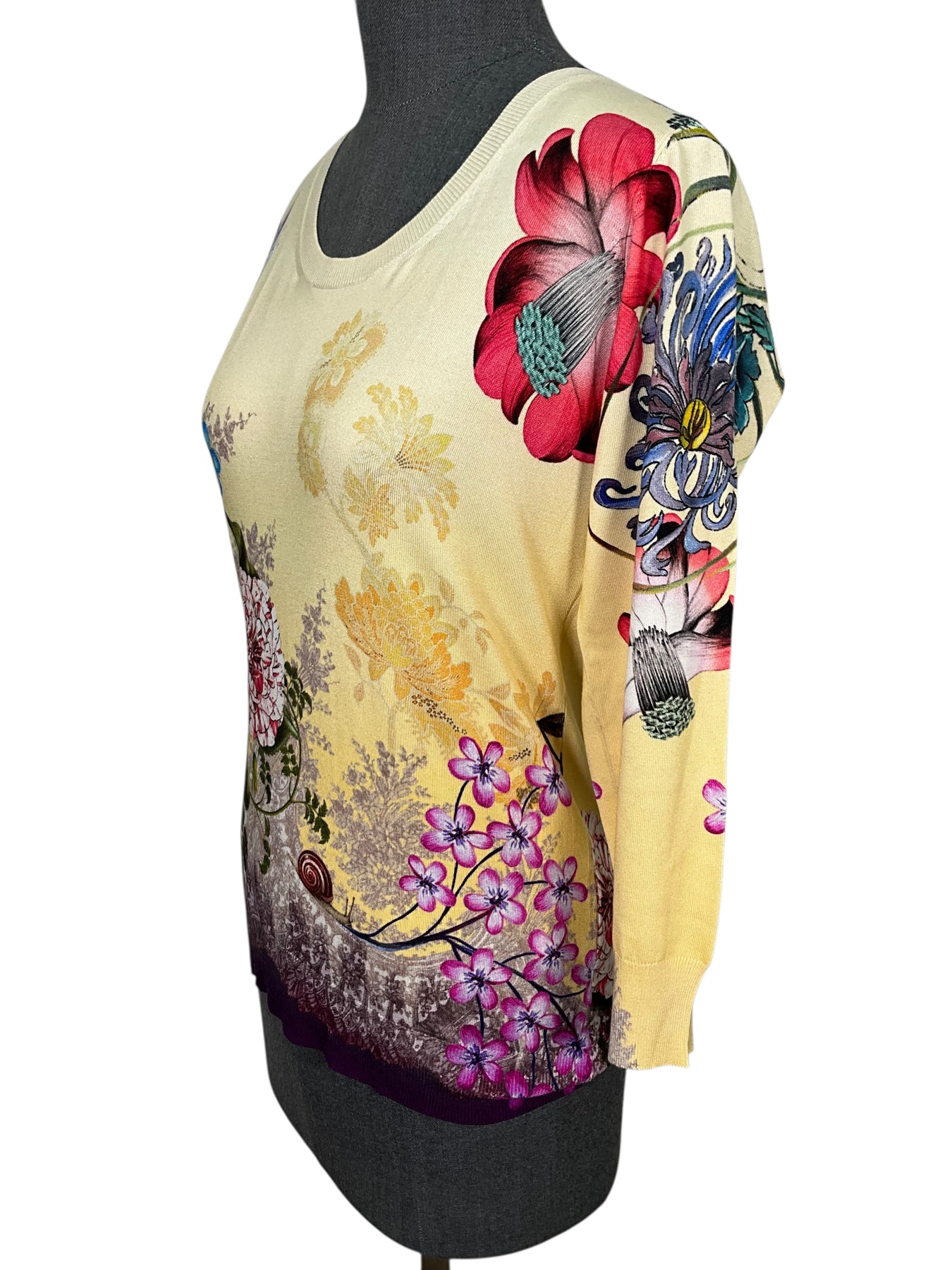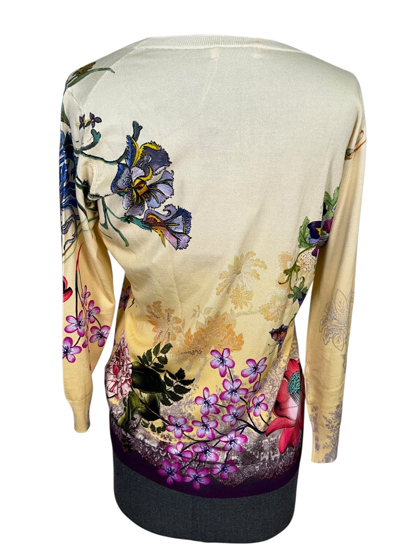 We guarantee the authenticity of this never before used beautiful ETRO Silk Floral Printed Sweater Size L (IT 46) crafted in yellow and multicolored hues with a round neckline.