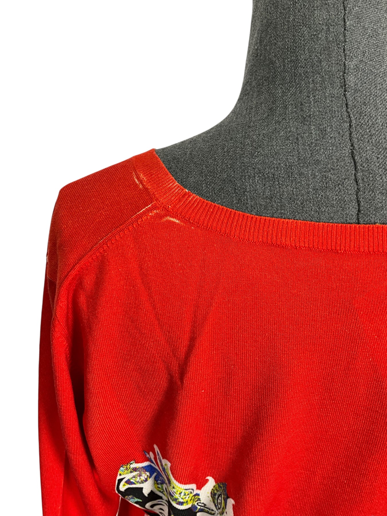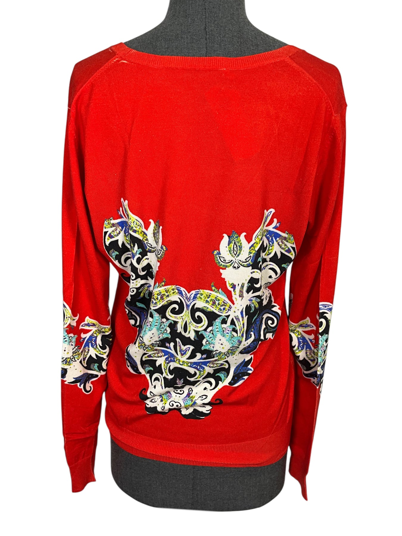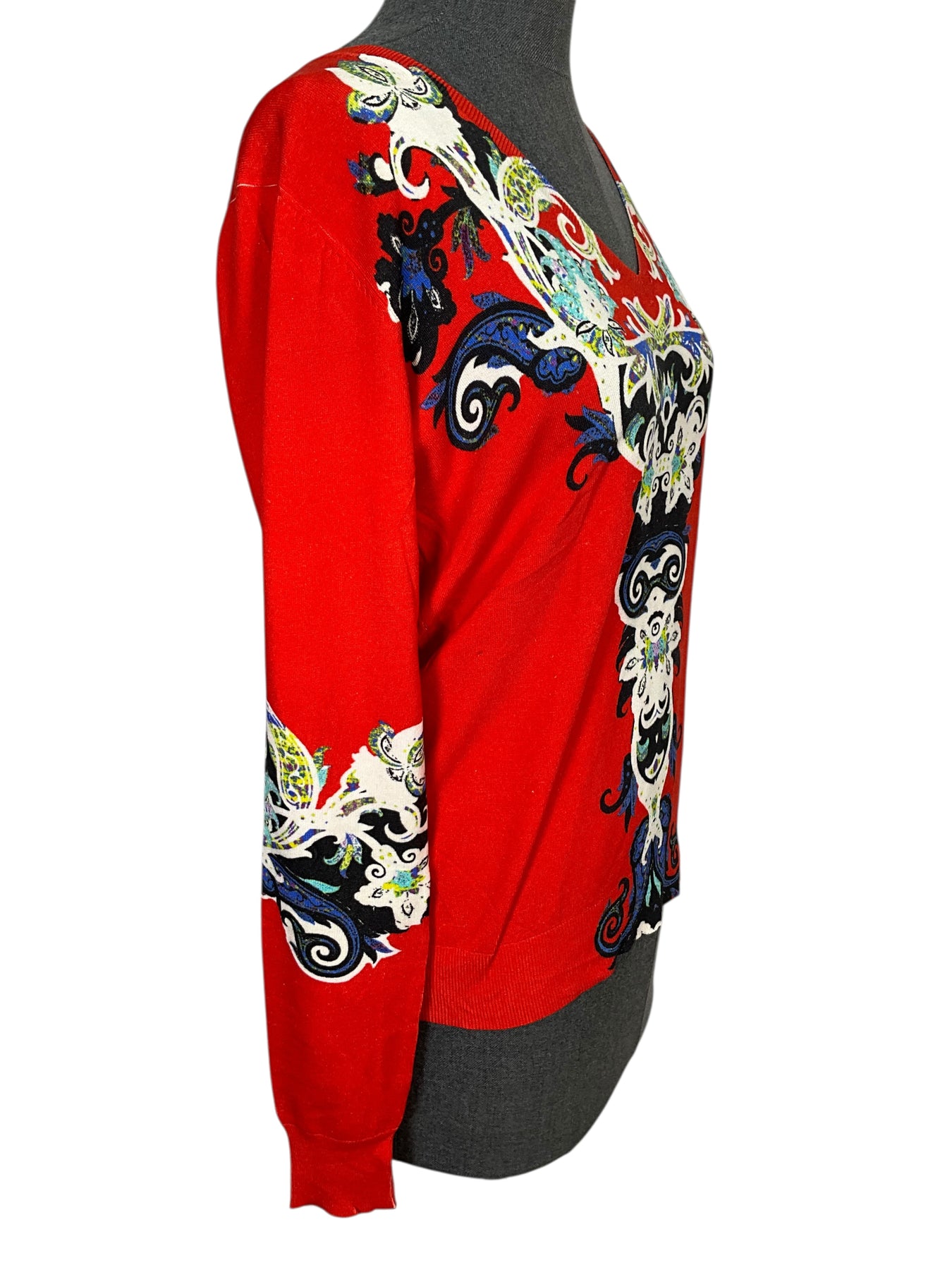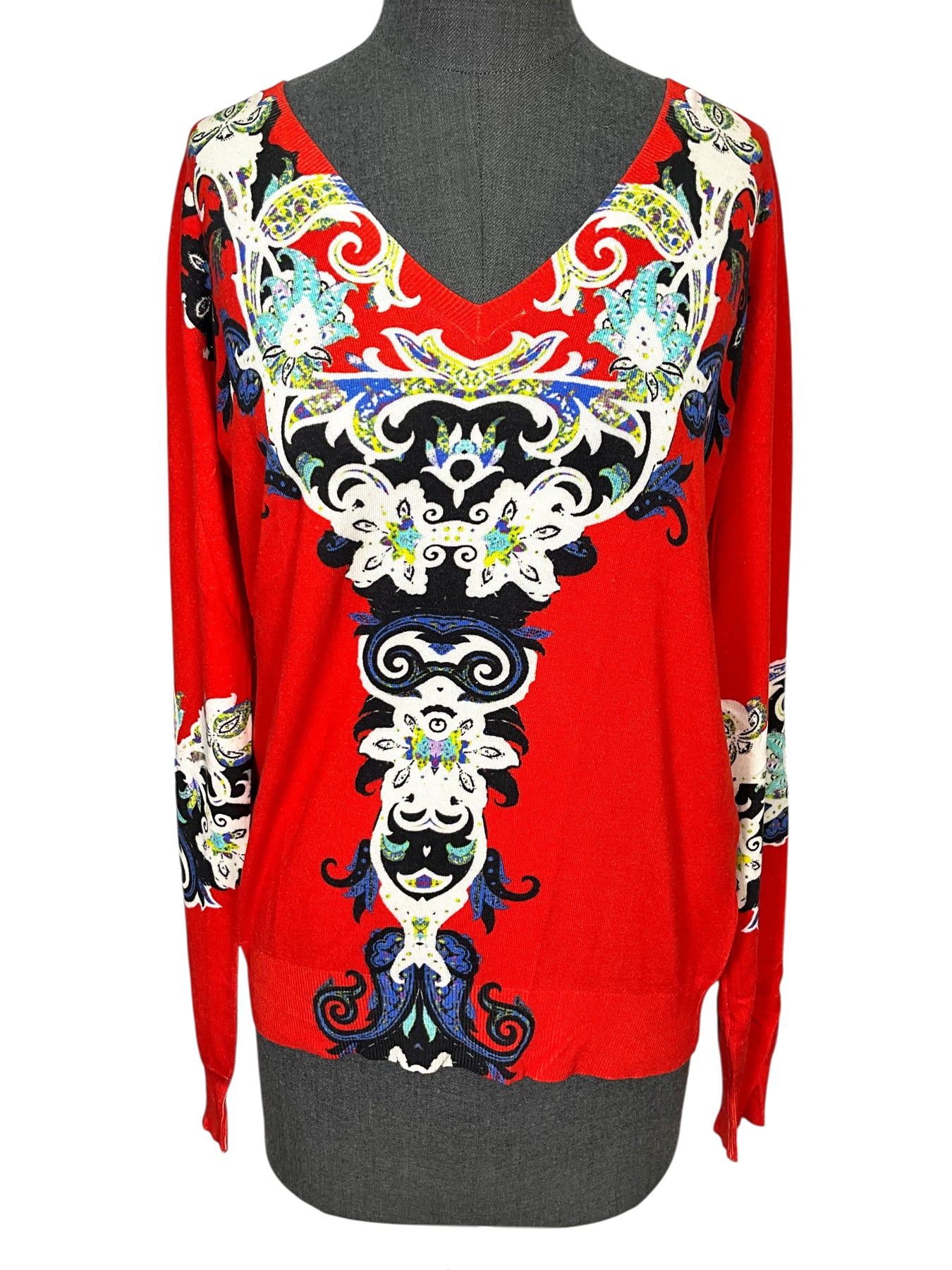 We guarantee the authenticity of this beautiful ETRO Silk Printed Sweater Size XL (IT 48) crafted in red and multicolored hues with a v-neckline.