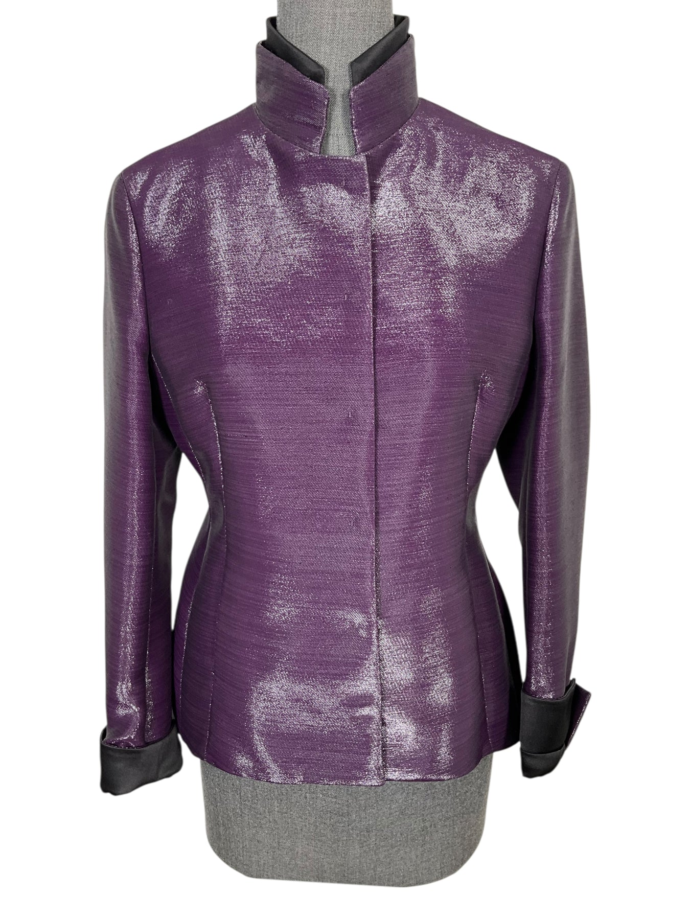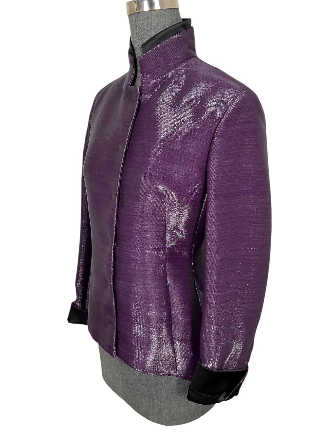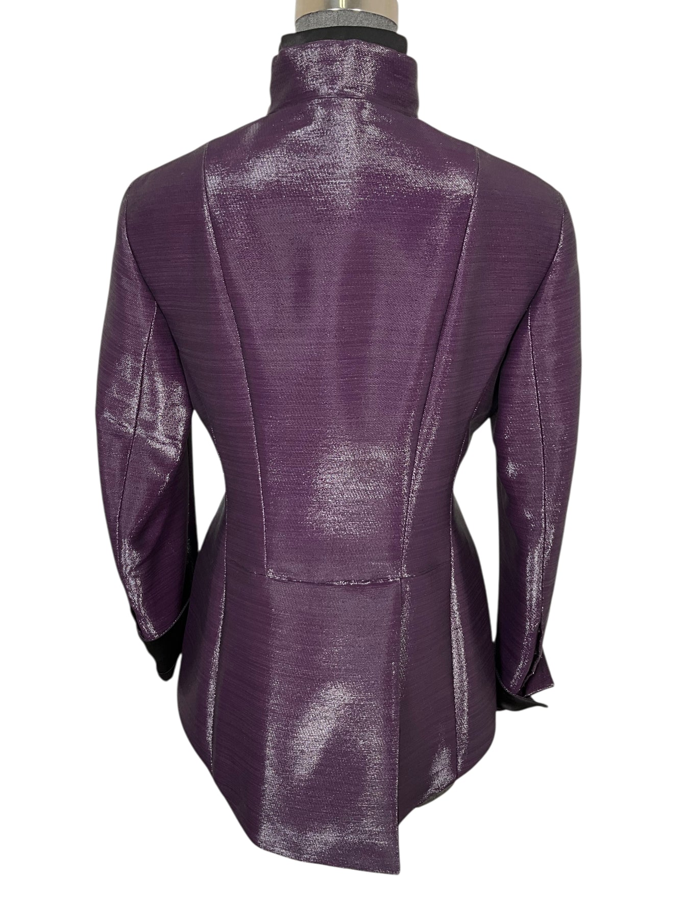 We guarantee the authenticity of this AKRIS Cotton Blend Snap Front Jacket Size M (US 8) crafted in beautiful metallic purple. Featuring a stand collar with two on-seam pockets and front snap closures.