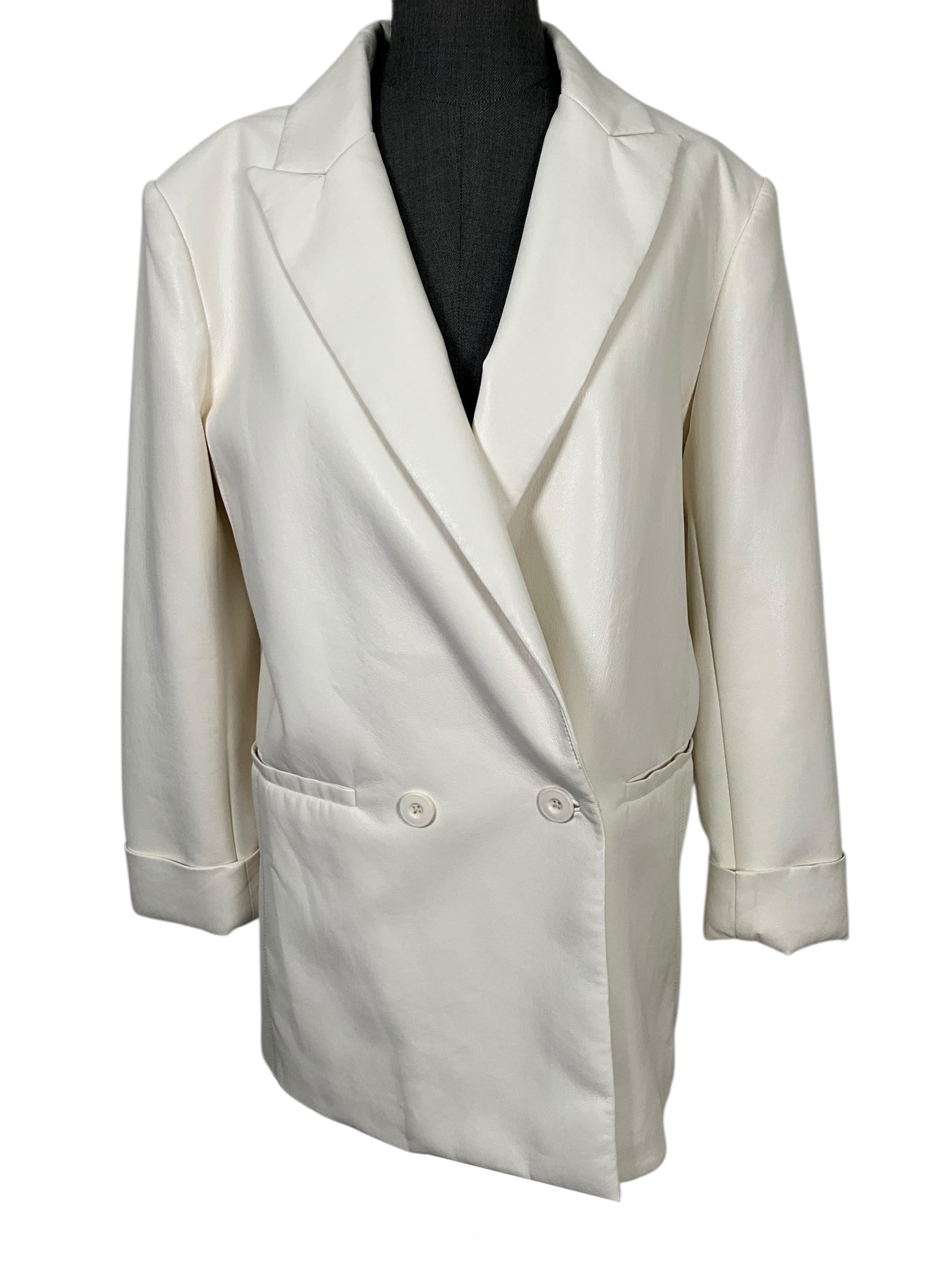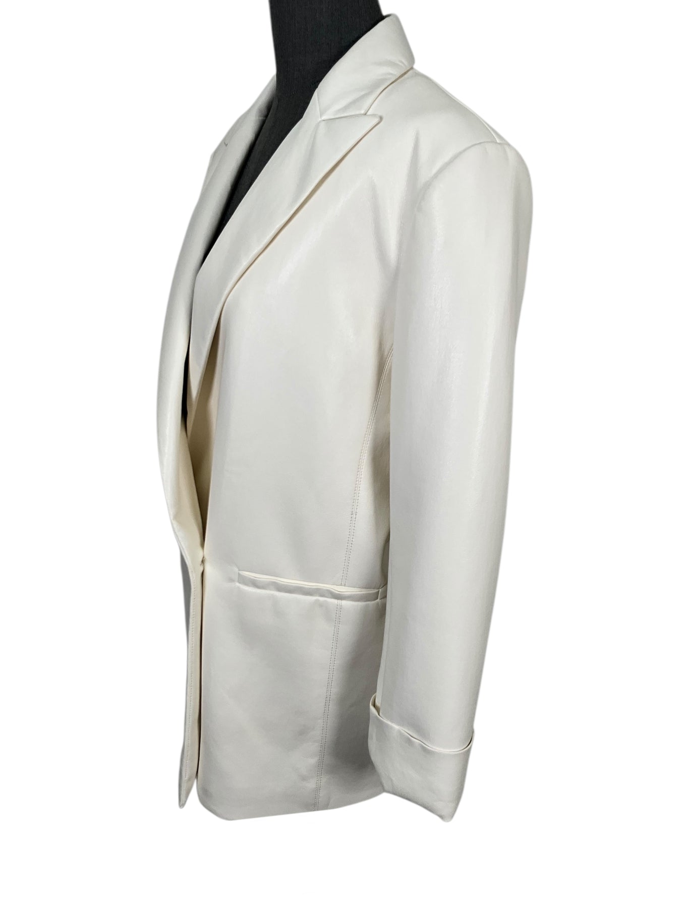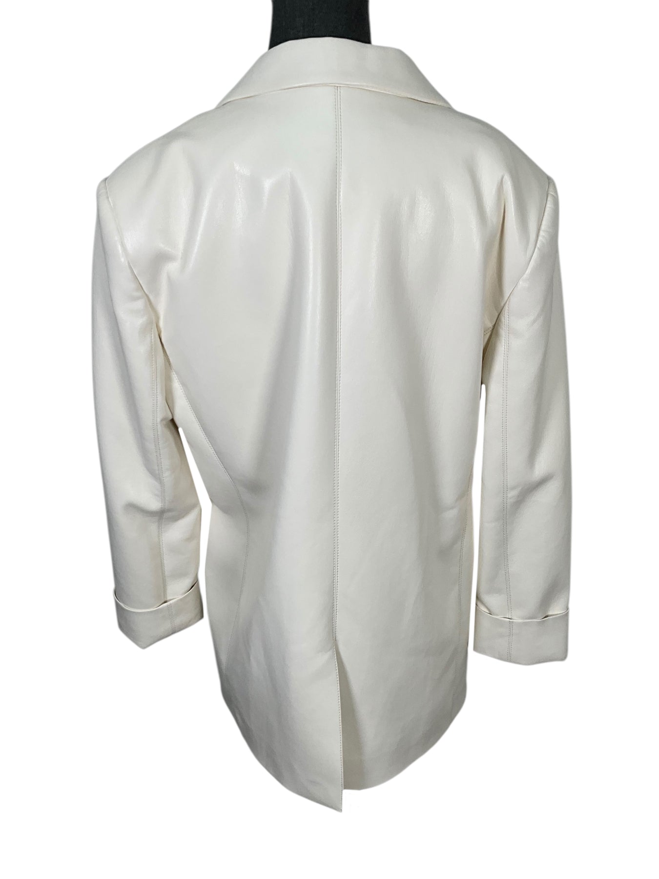 This is an authentic Alice + Olivia Vegan Leather Blazer Size M in ivory. Featuring a peaked notched lapel collar, front welt pockets and double breasted front button closures.