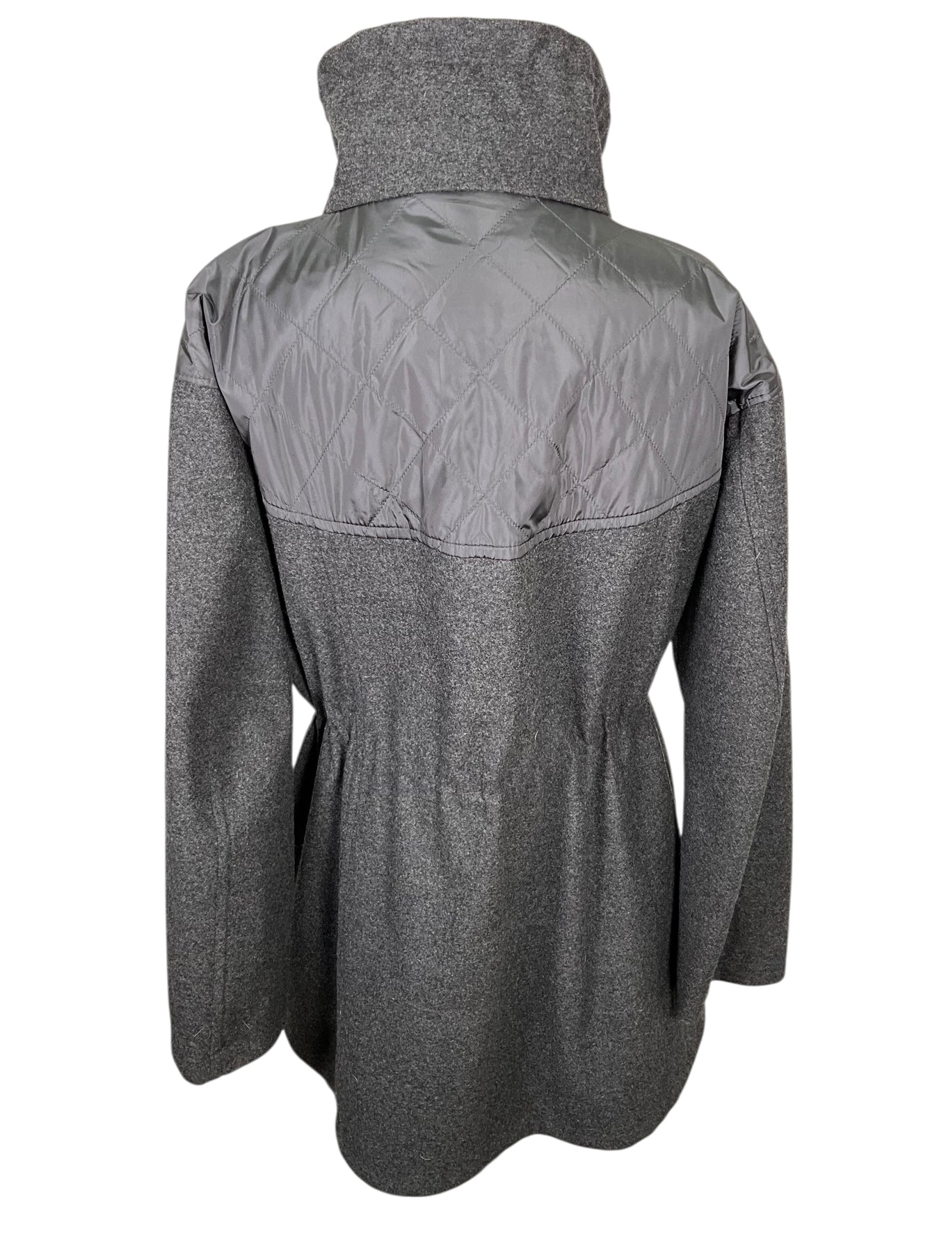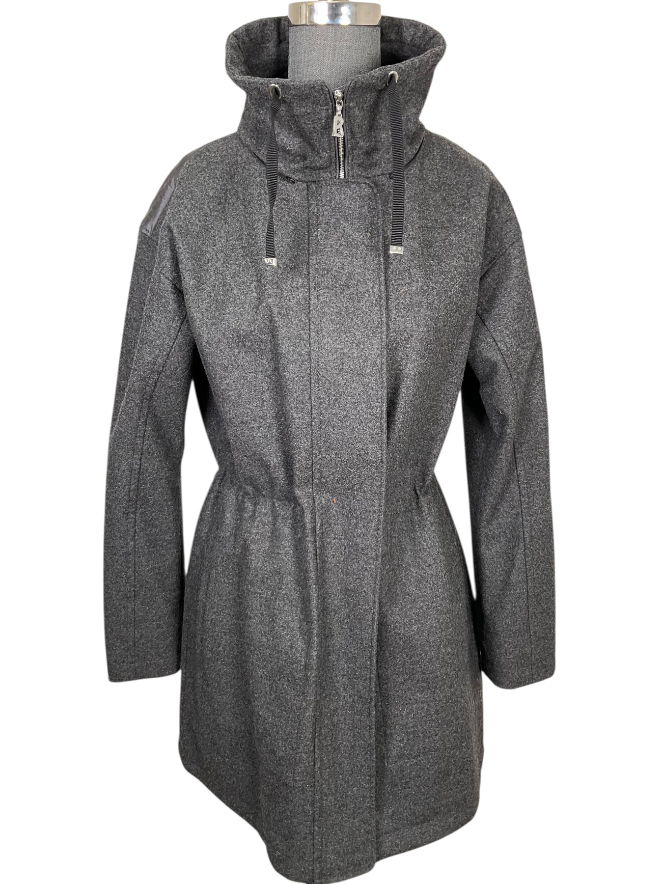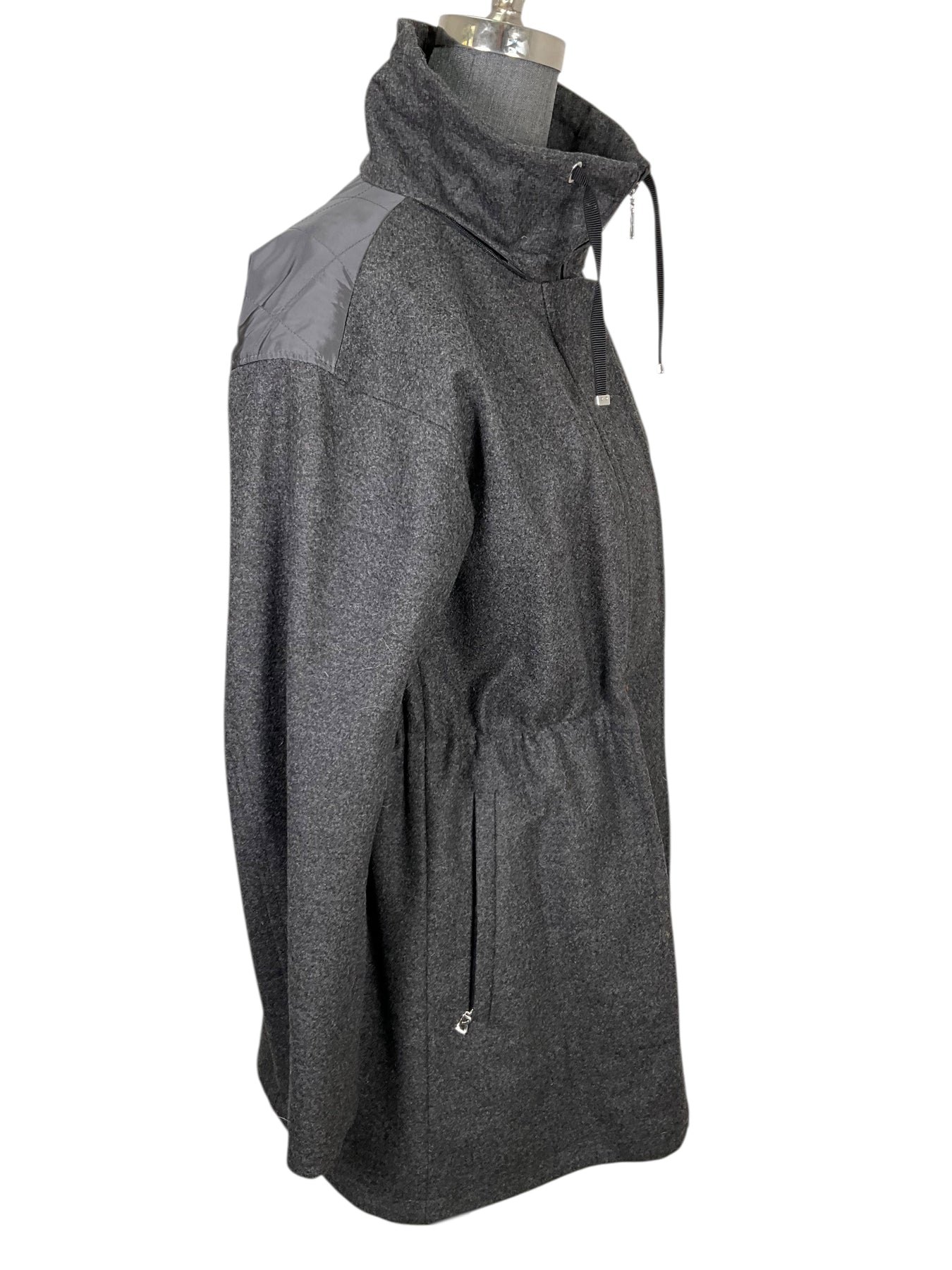 This is an authentic BOGNER Wool Parka Coat Size S in charcoal. This mid length wool coat features a quilted back yoke and a stand collar.