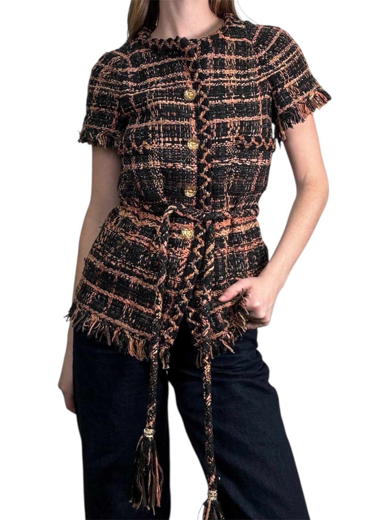 We guarantee the authenticity of this Chanel Cotton Tweed Short Sleeve Skirt Suit Size M crafted from a stunning orange, brown and black colorway with tweed boucle. Featuring fringe detail, a matching tweed cord belt and signature Camellia CC buttons. Includes matching pencil skirt.