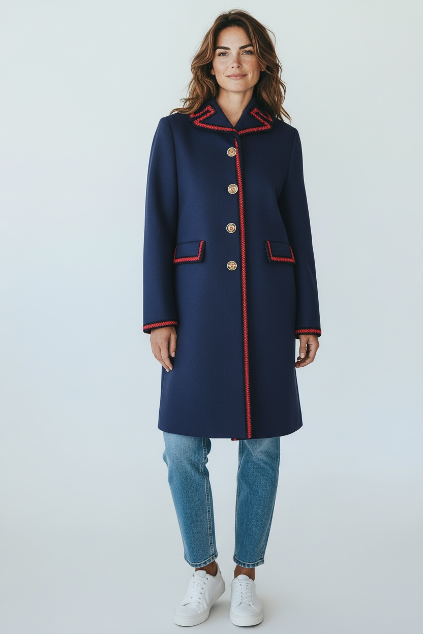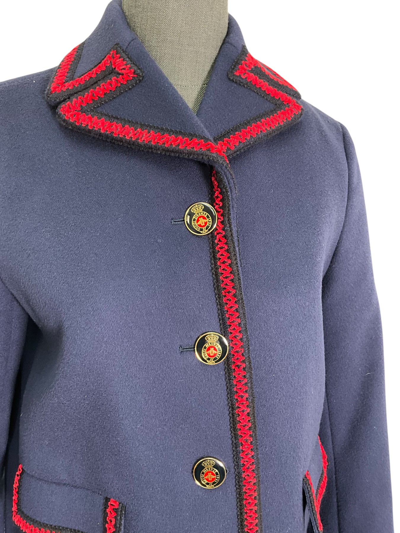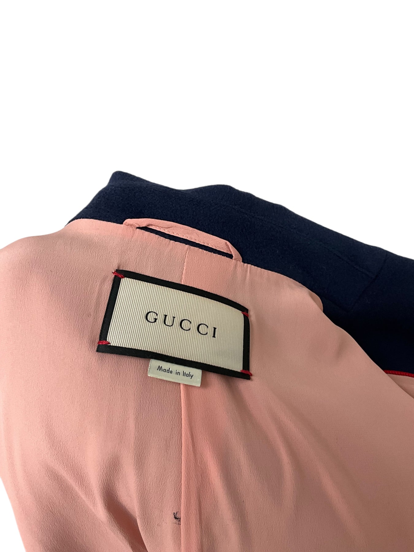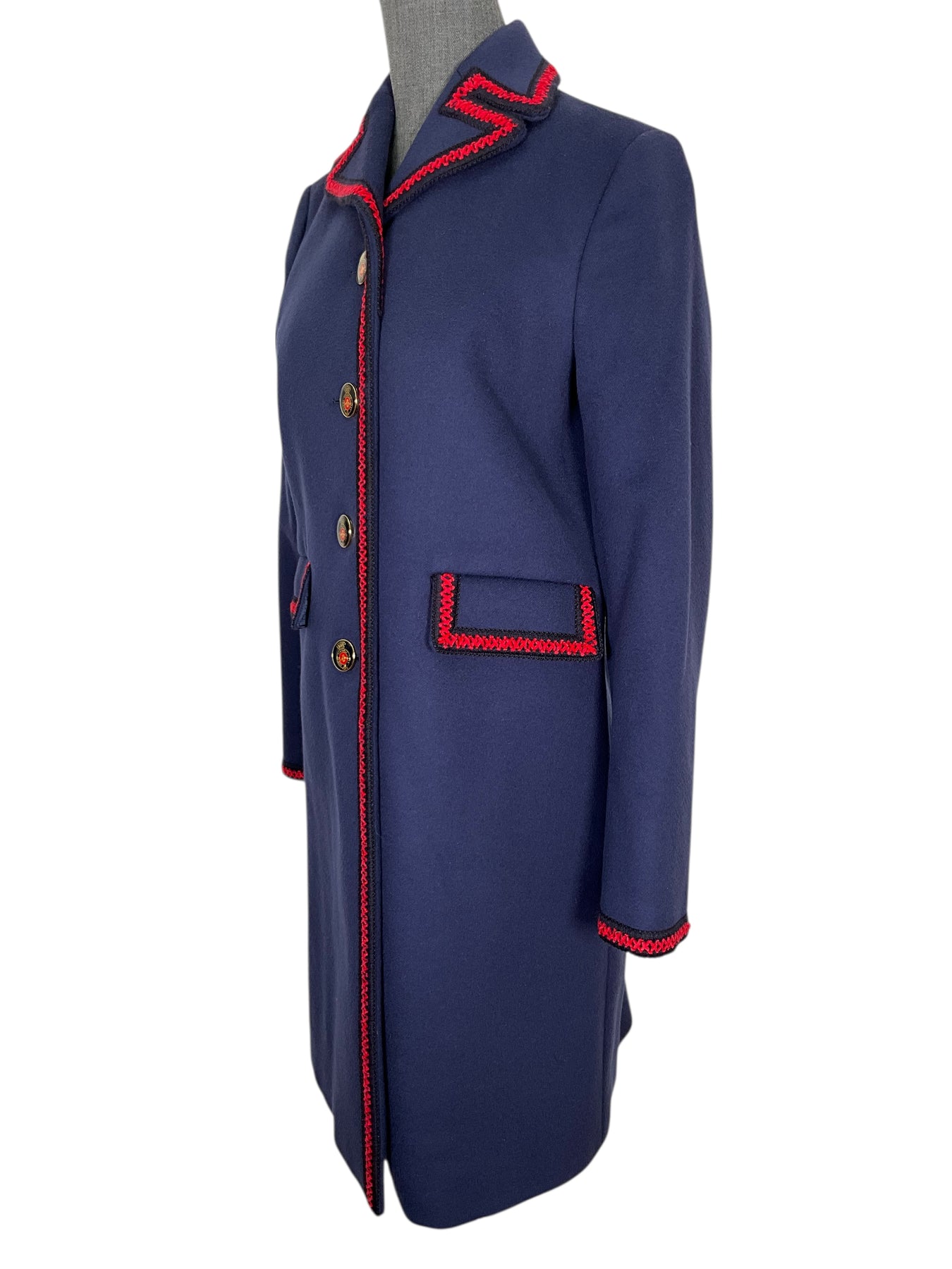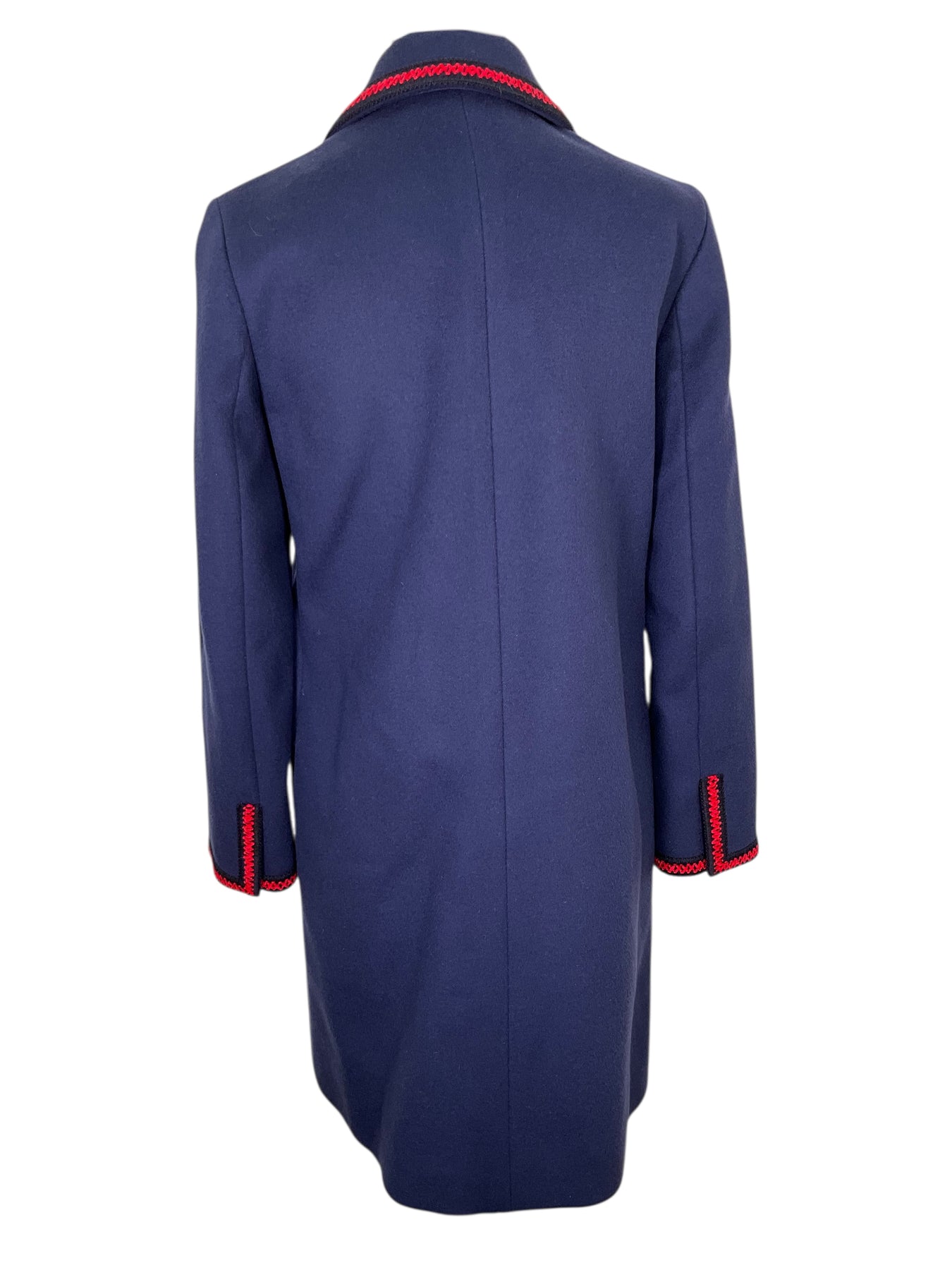 We guarantee the authenticity of this Gucci Embroidered Wool Coat Size S | 40 crafted in Italy from smooth blue wool with a red embroidered trim. Featuring a notched lapel collar, two front flap pockets and logo-engraved shank button closures.