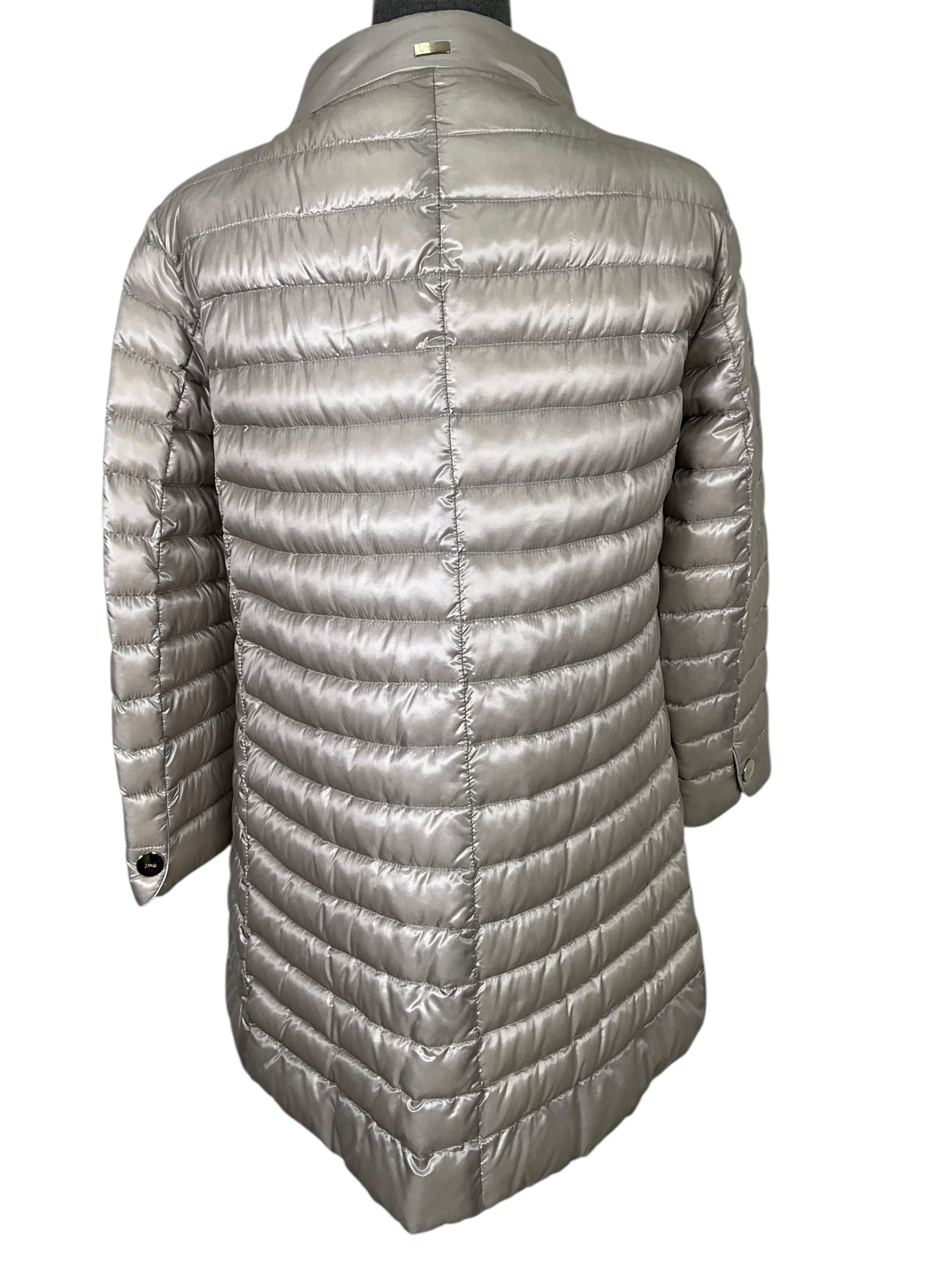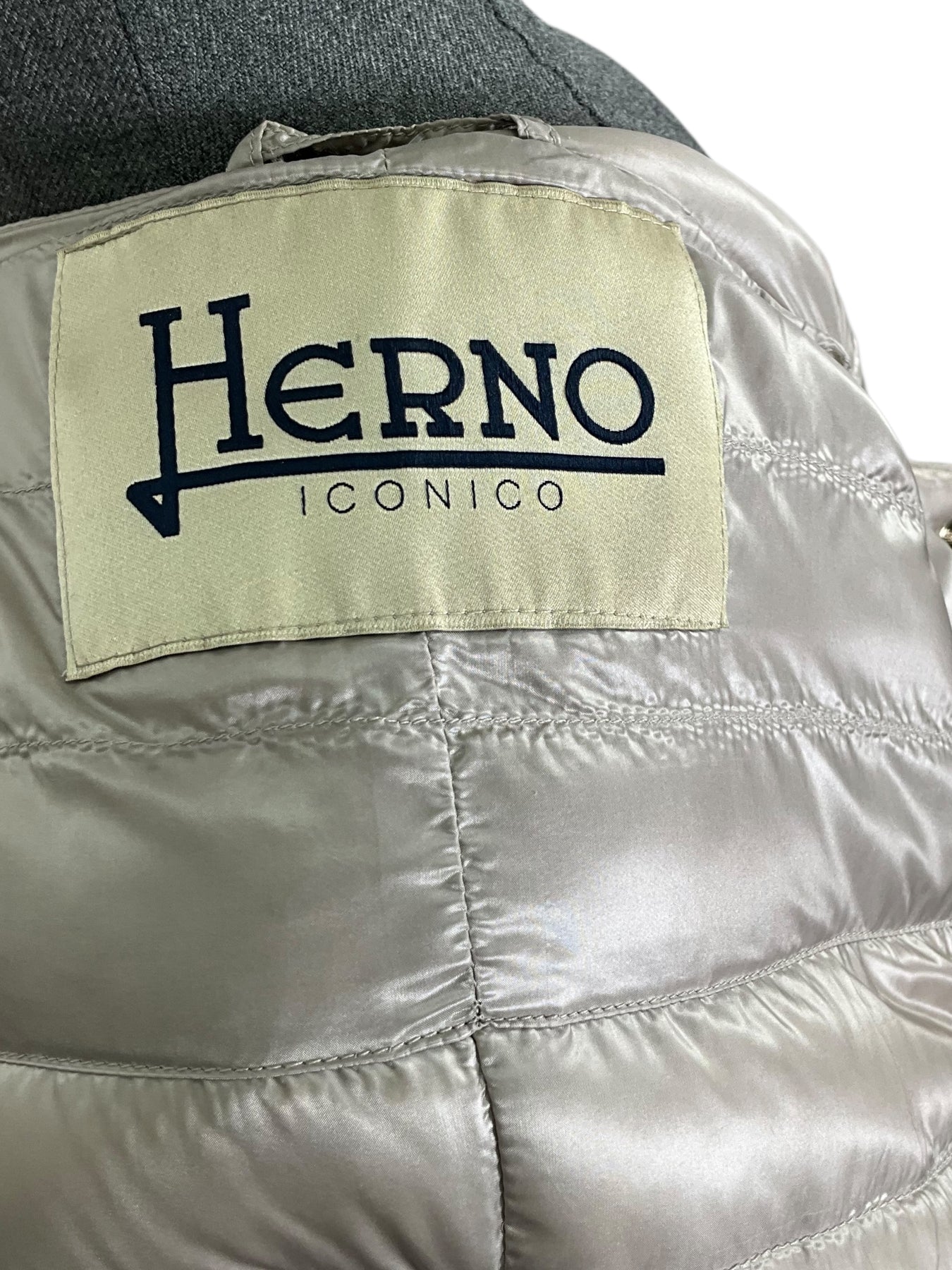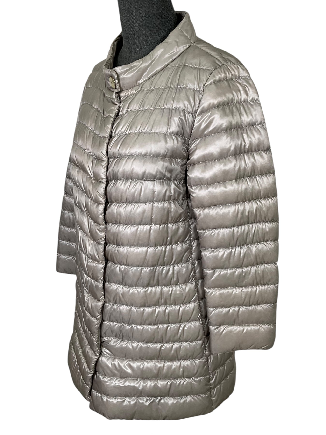Guaranteed Authentic! Timeless classic Herno Quilted Down Puffer Jacket Size S crafted in beautiful puffy quilted lightweight pewter nylon and goose down. Featuring two side pockets and front snap closures.
