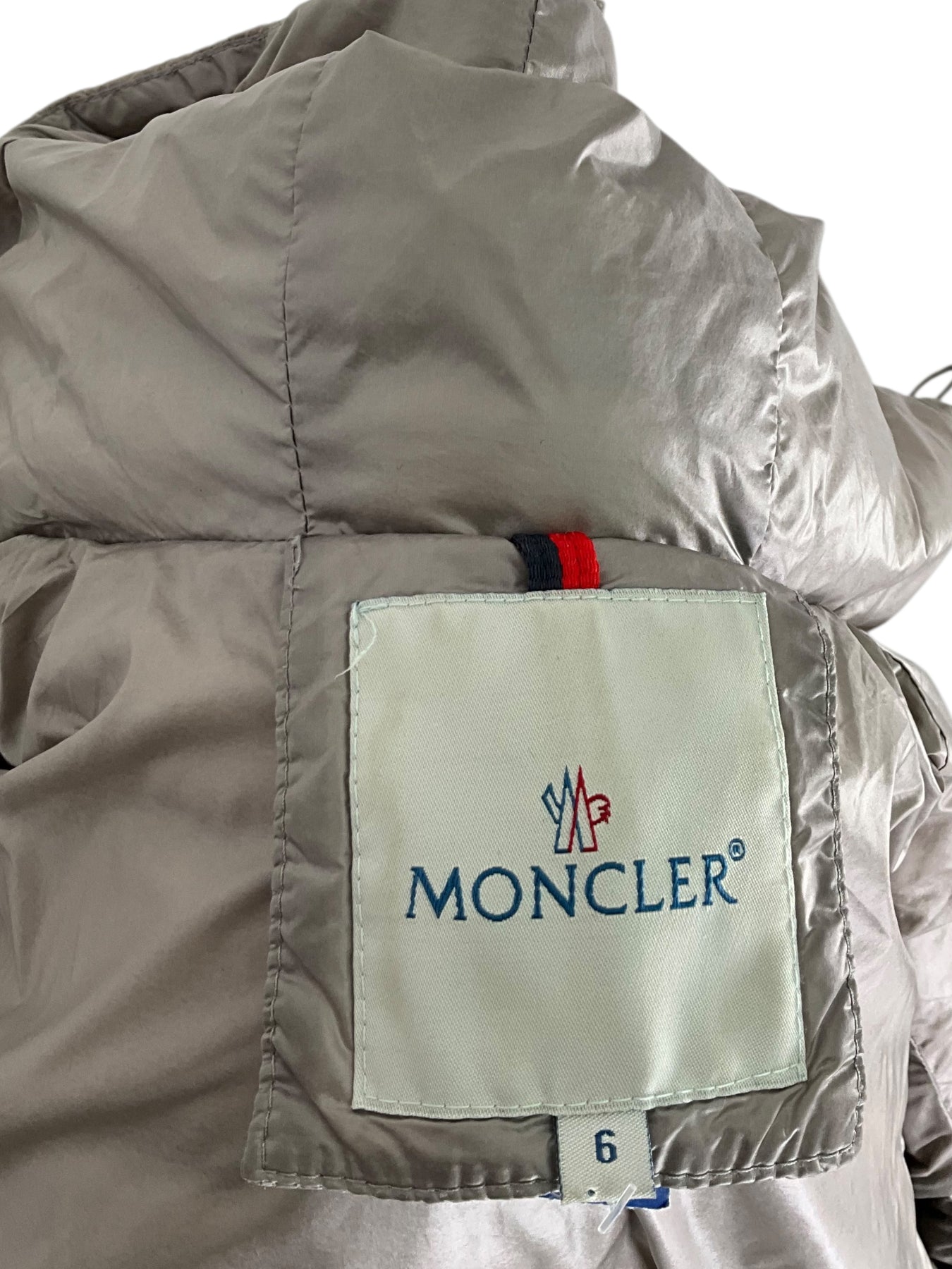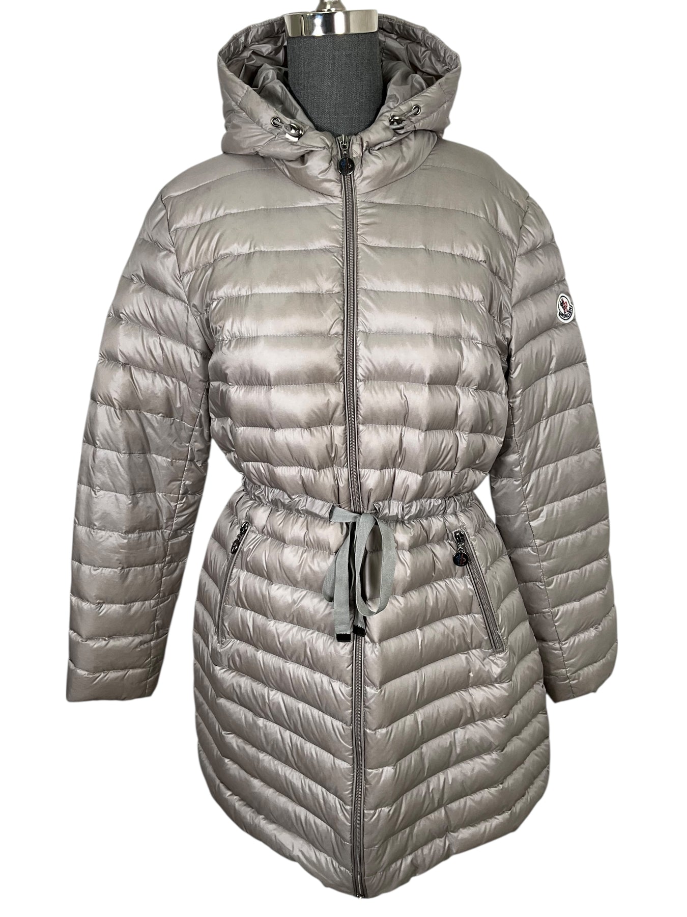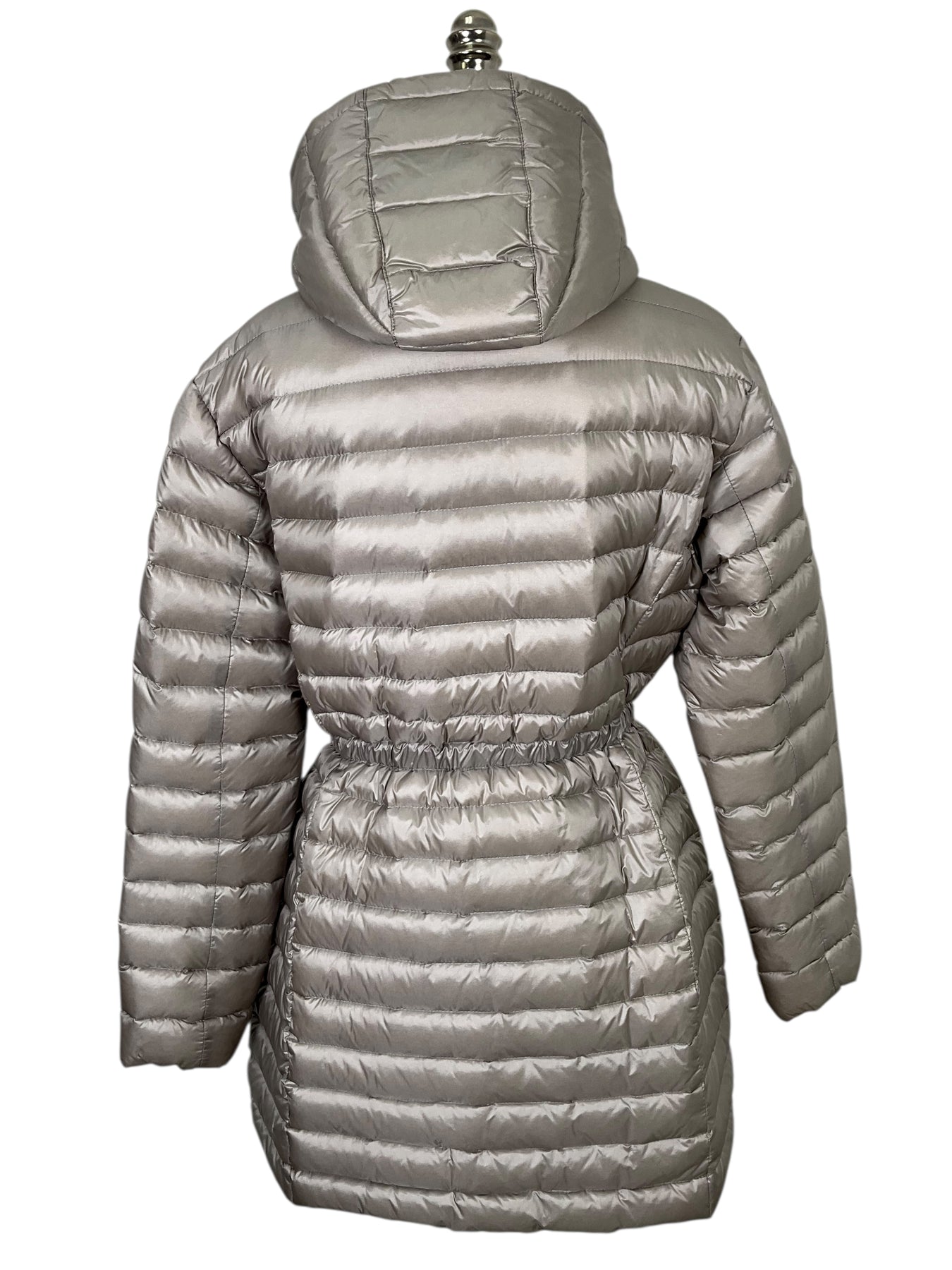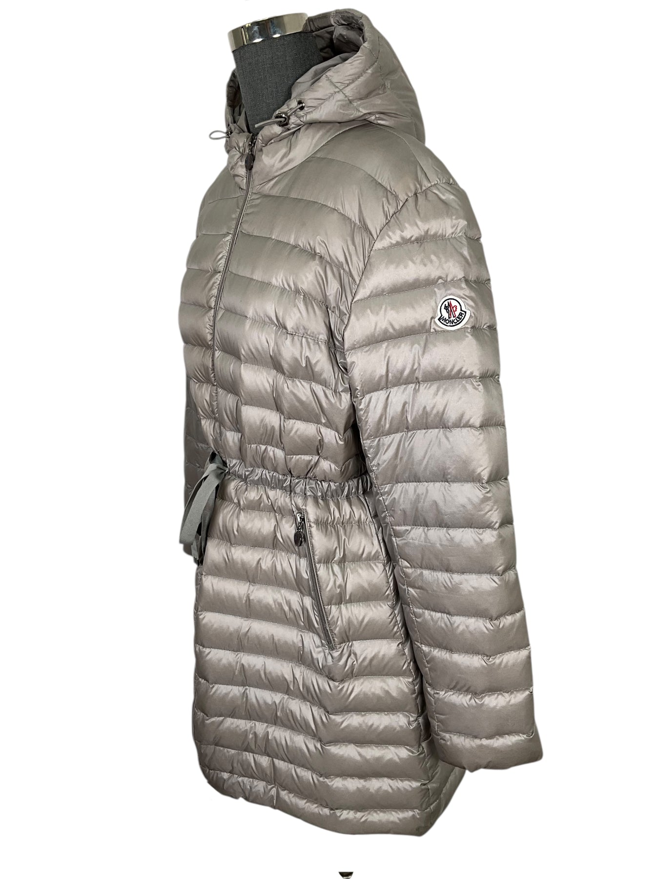 Turn heads in this gorgeous authentic Moncler Barbel Hooded Fit & Flare Long Down Jacket Size 6 crafted from a pewter down-filled padded nylon shell with a self-tie grosgrain belt.