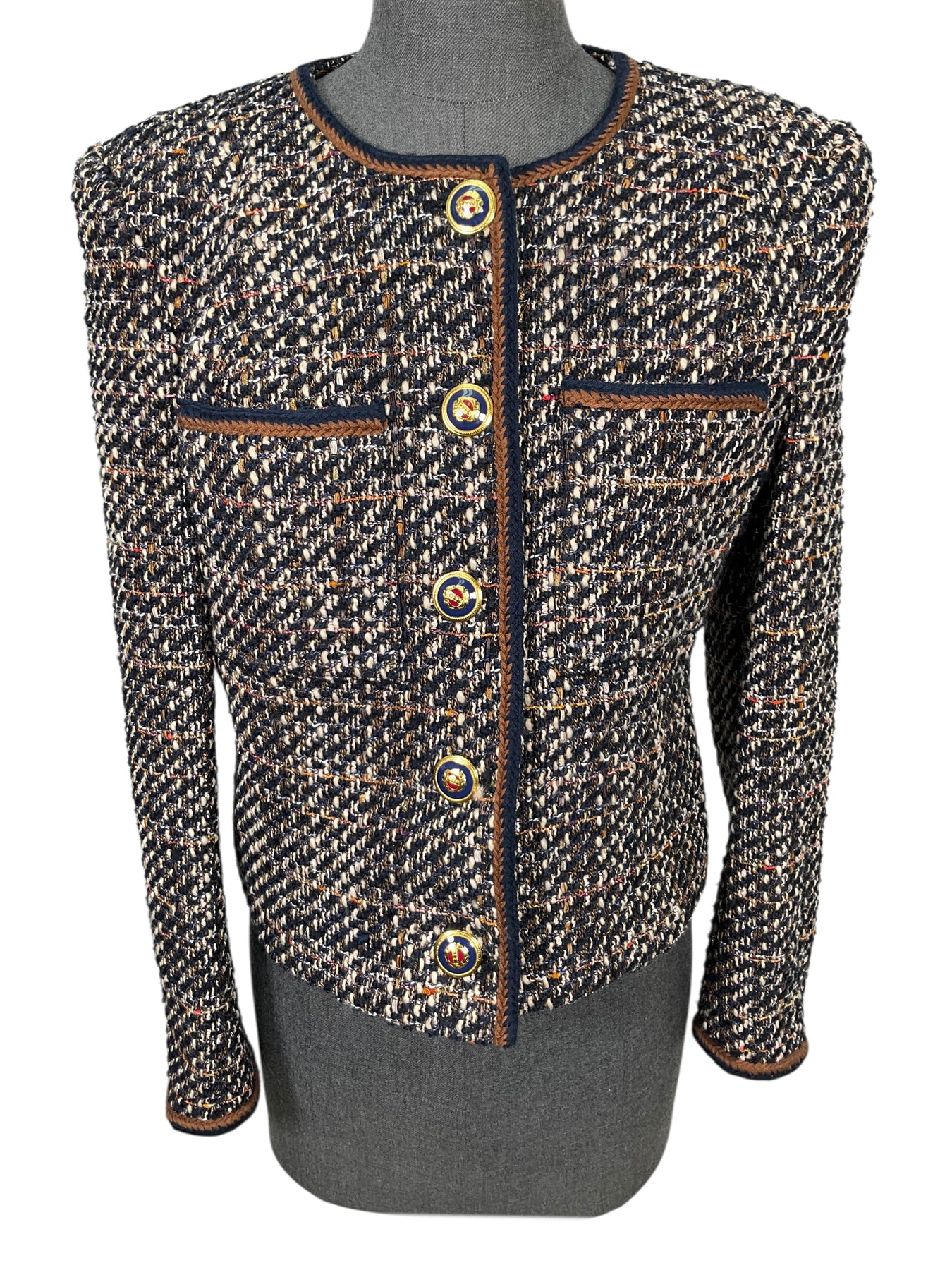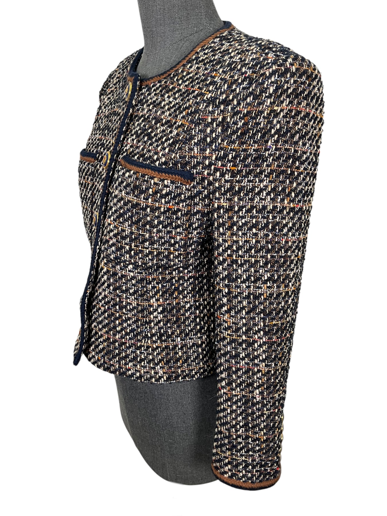 Guaranteed Authentic Veronica Beard Lars Tweed Jacket Size M crafted in navy plaid tweed with a navy and brown braided trim. Featuring a jewel neckline, chest pockets and gold-tone metal shank button closures.
