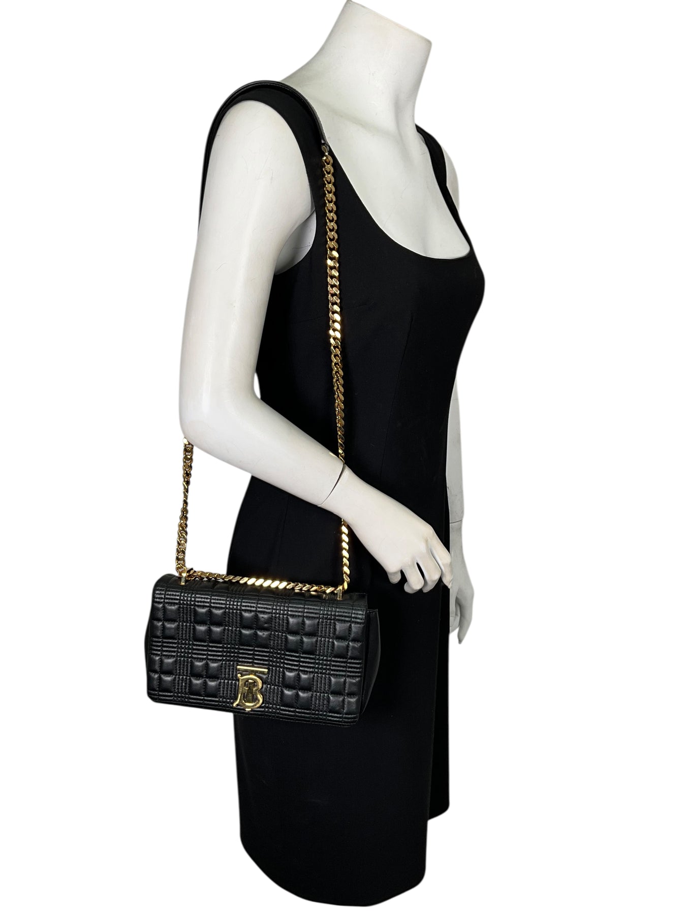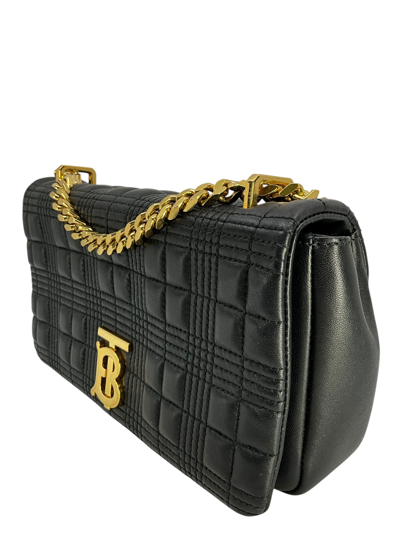 We guarantee the authenticity of this Burberry Lambskin Quilted Small Lola Bag Black crafted from beautiful quilted black leather and gold-tone metal hardware. Featuring a chain link strap with a comfortable leather shoulder pad that can easily be worn long or doubled.