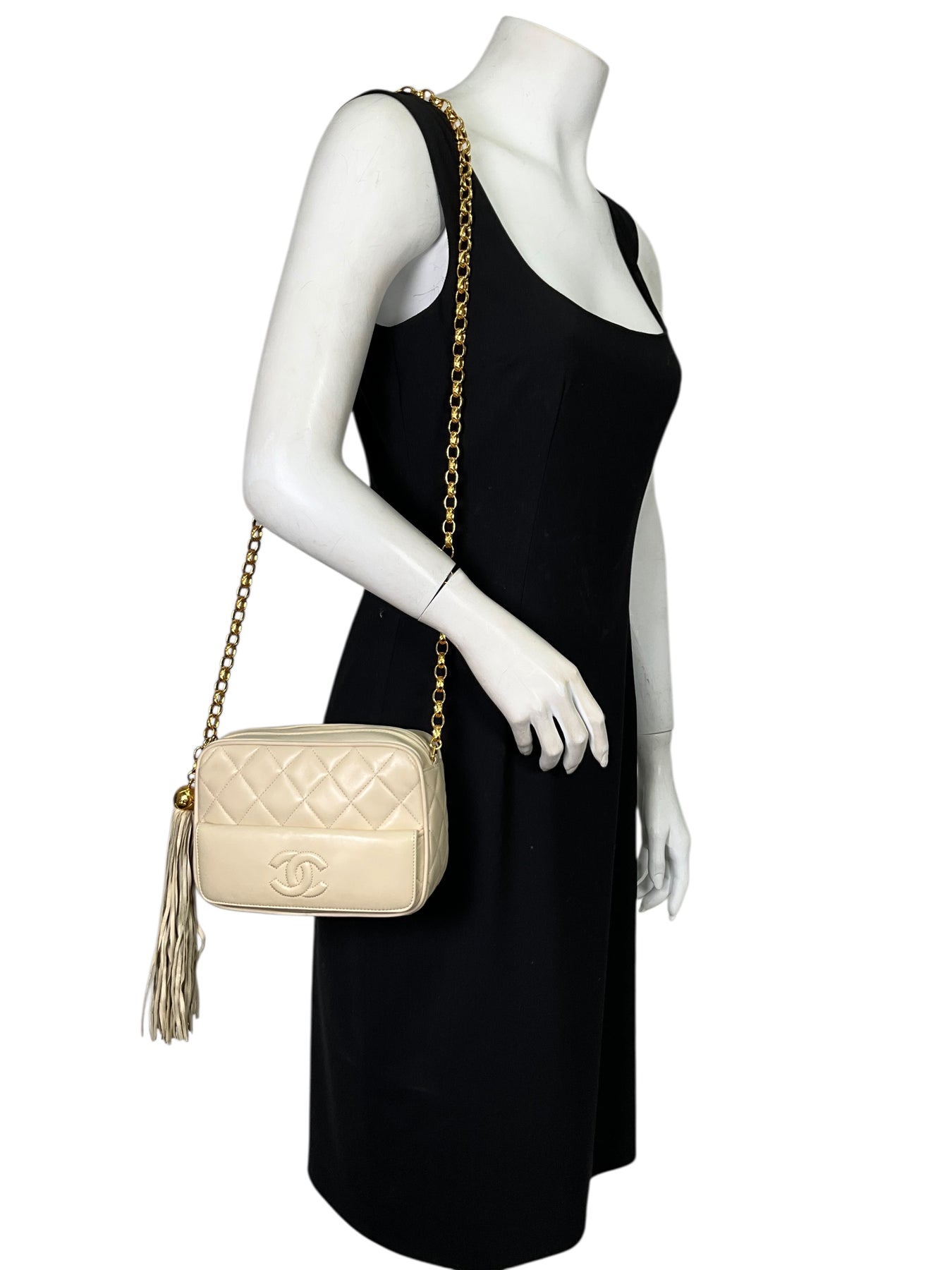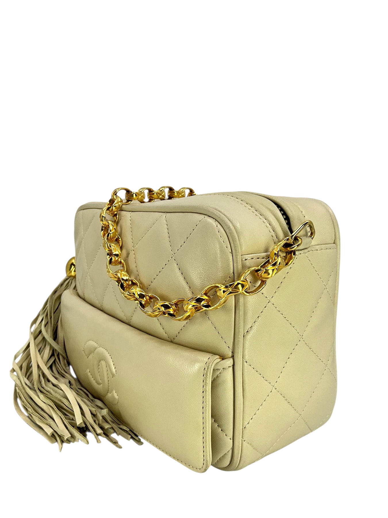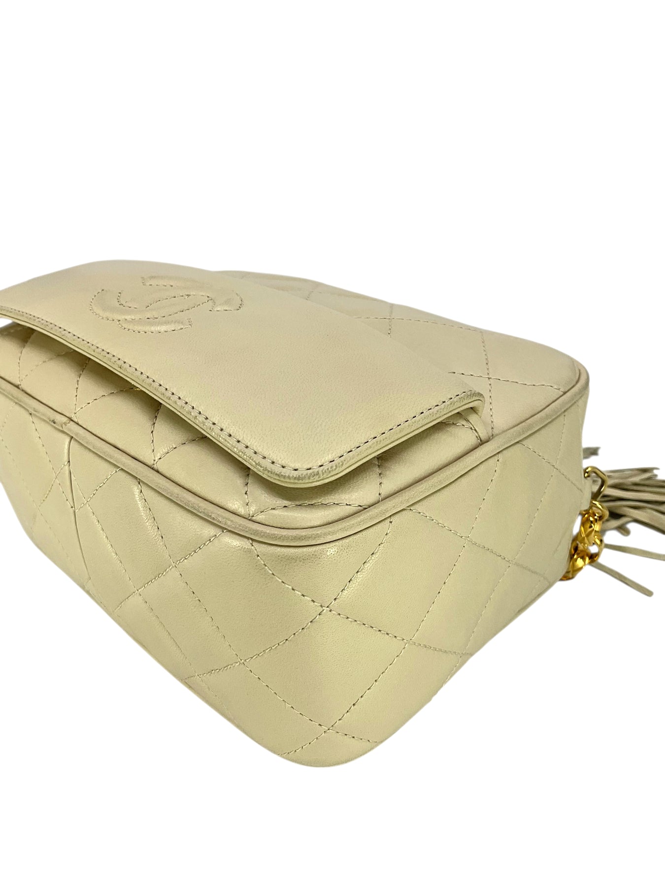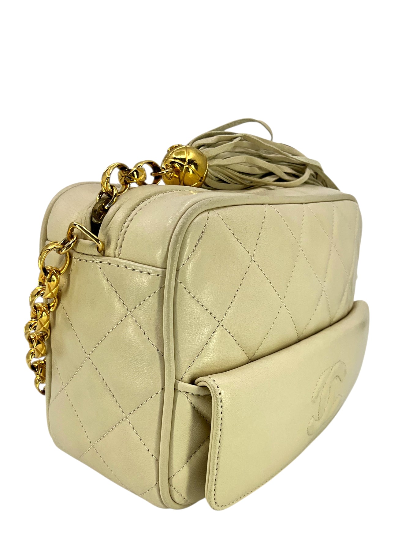 Add to your collection this authentic Chanel Vintage Lambskin Tassel Camera Bag crafted from buttery-soft diamond quilted cream leather and gold-tone hardware. Featuring a bijoux chain link shoulder strap, a signature 'CC' logo engraved tassel zip closure and a functional front magnetic snap compartment.
