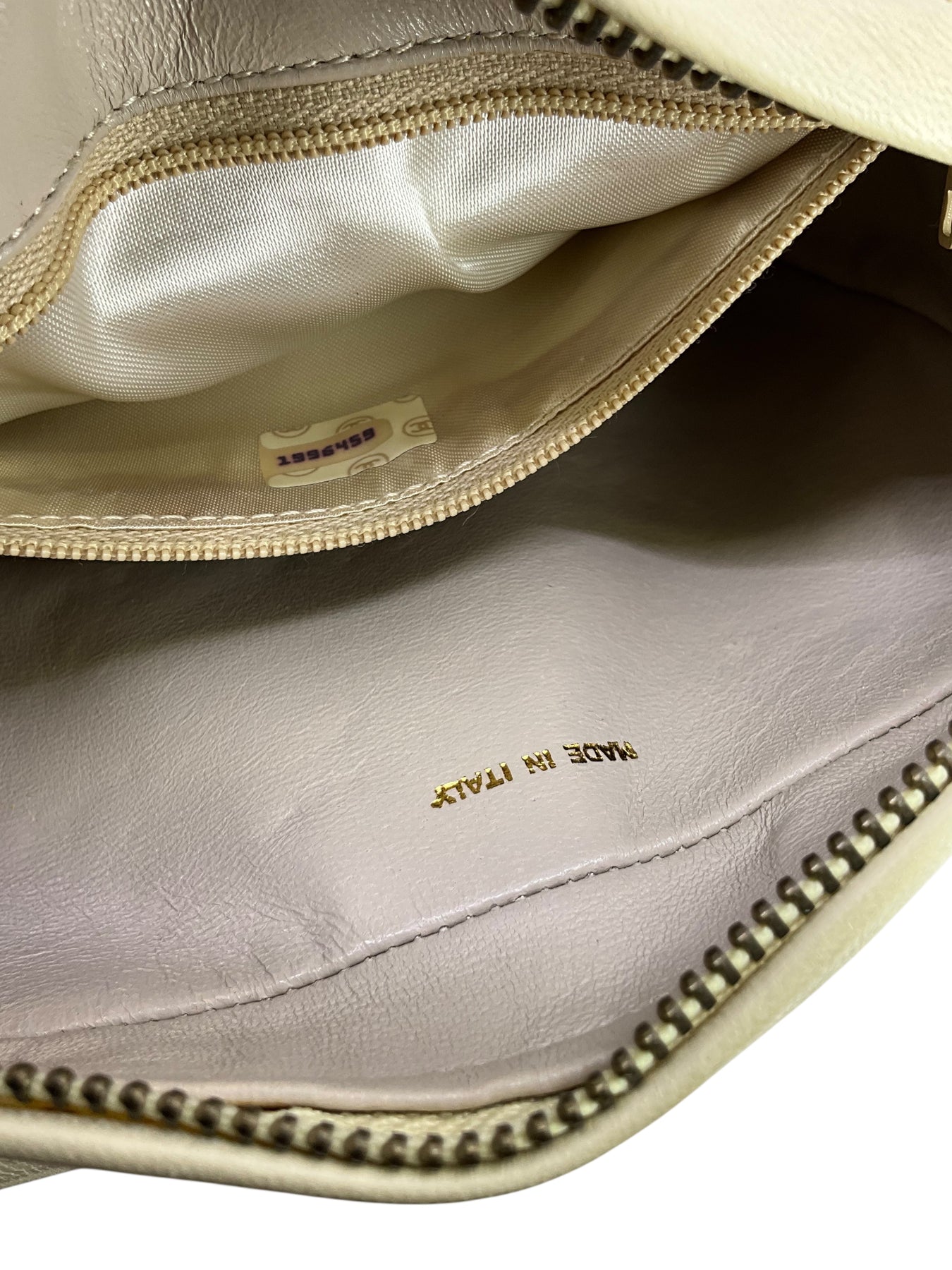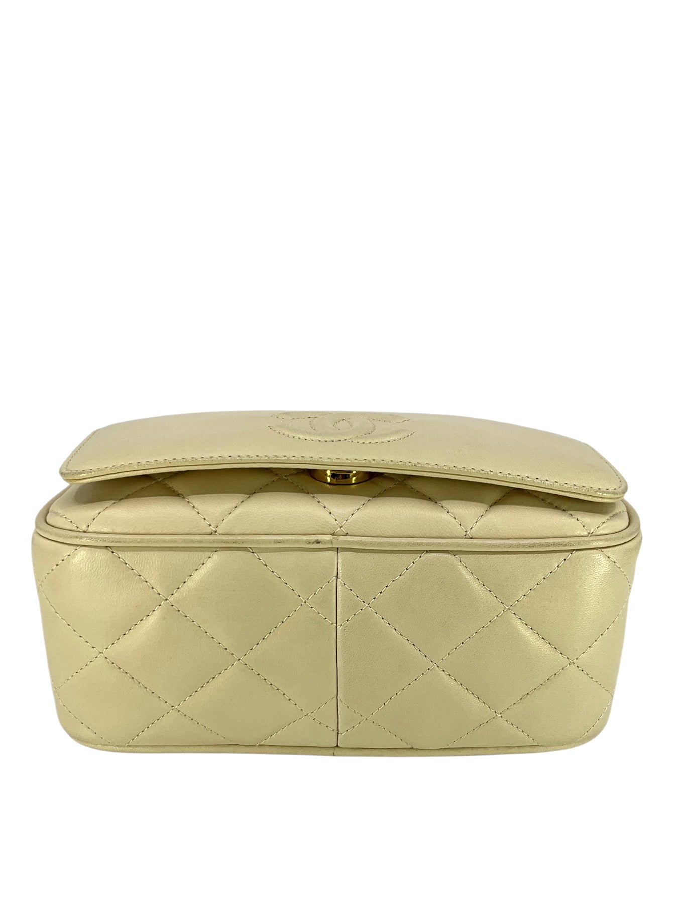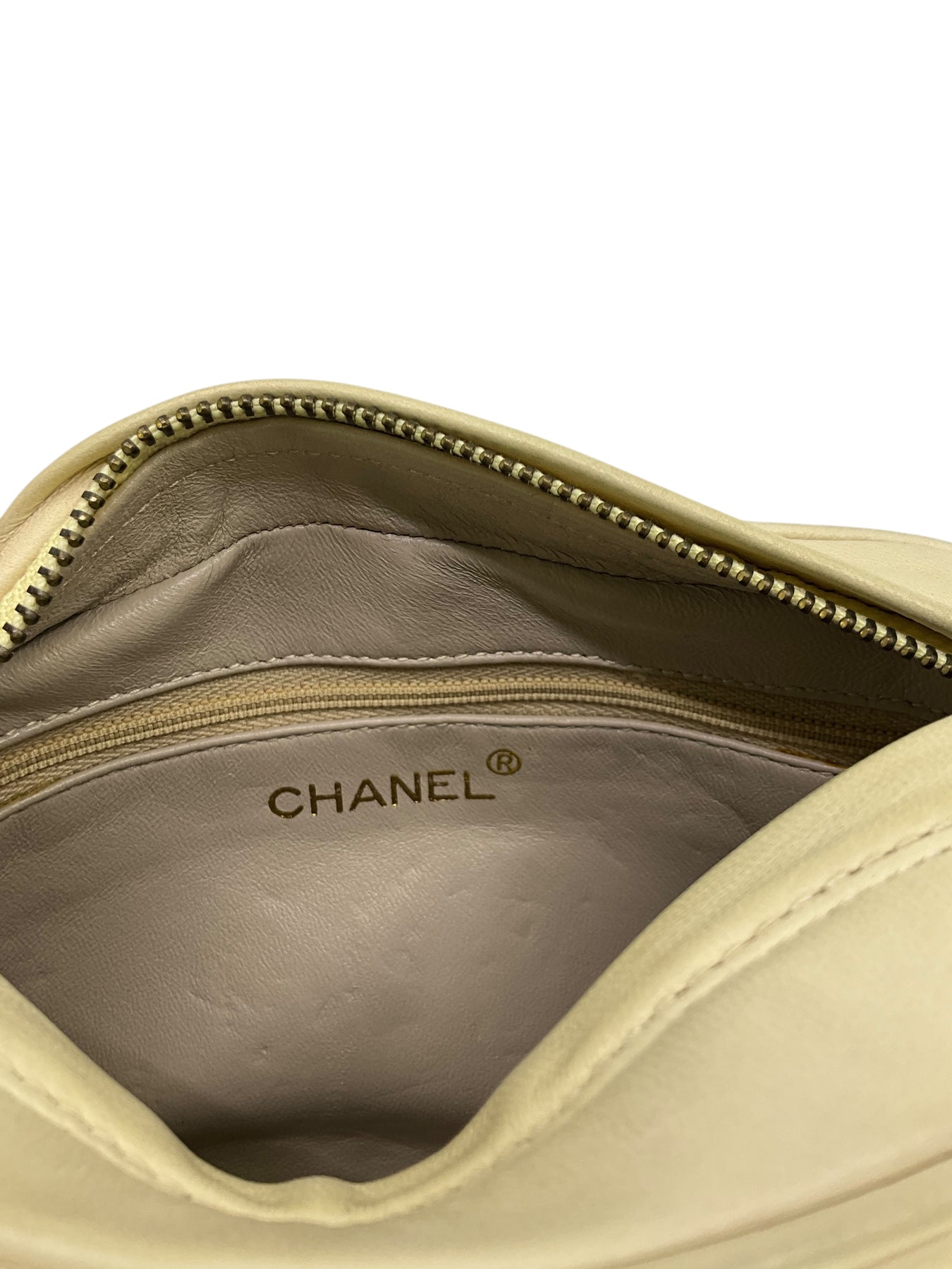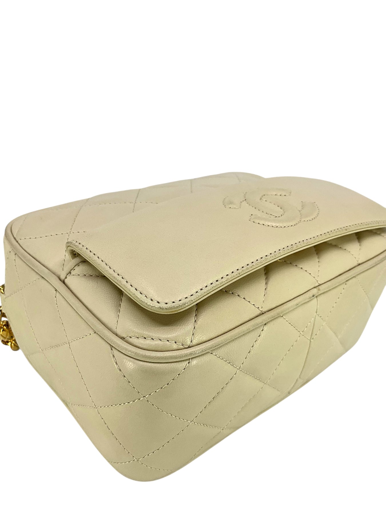 Add to your collection this authentic Chanel Vintage Lambskin Tassel Camera Bag crafted from buttery-soft diamond quilted cream leather and gold-tone hardware. Featuring a bijoux chain link shoulder strap, a signature 'CC' logo engraved tassel zip closure and a functional front magnetic snap compartment.