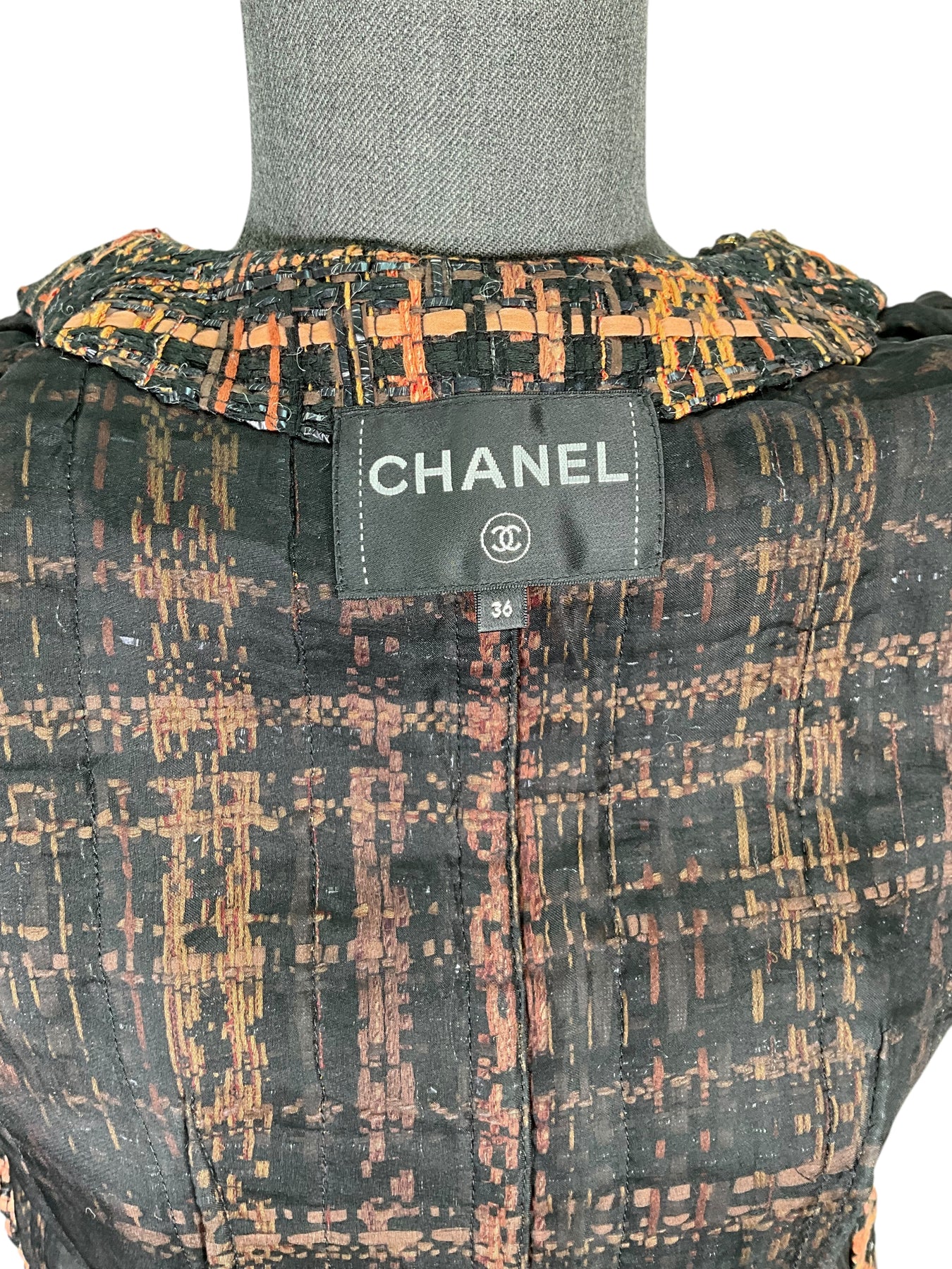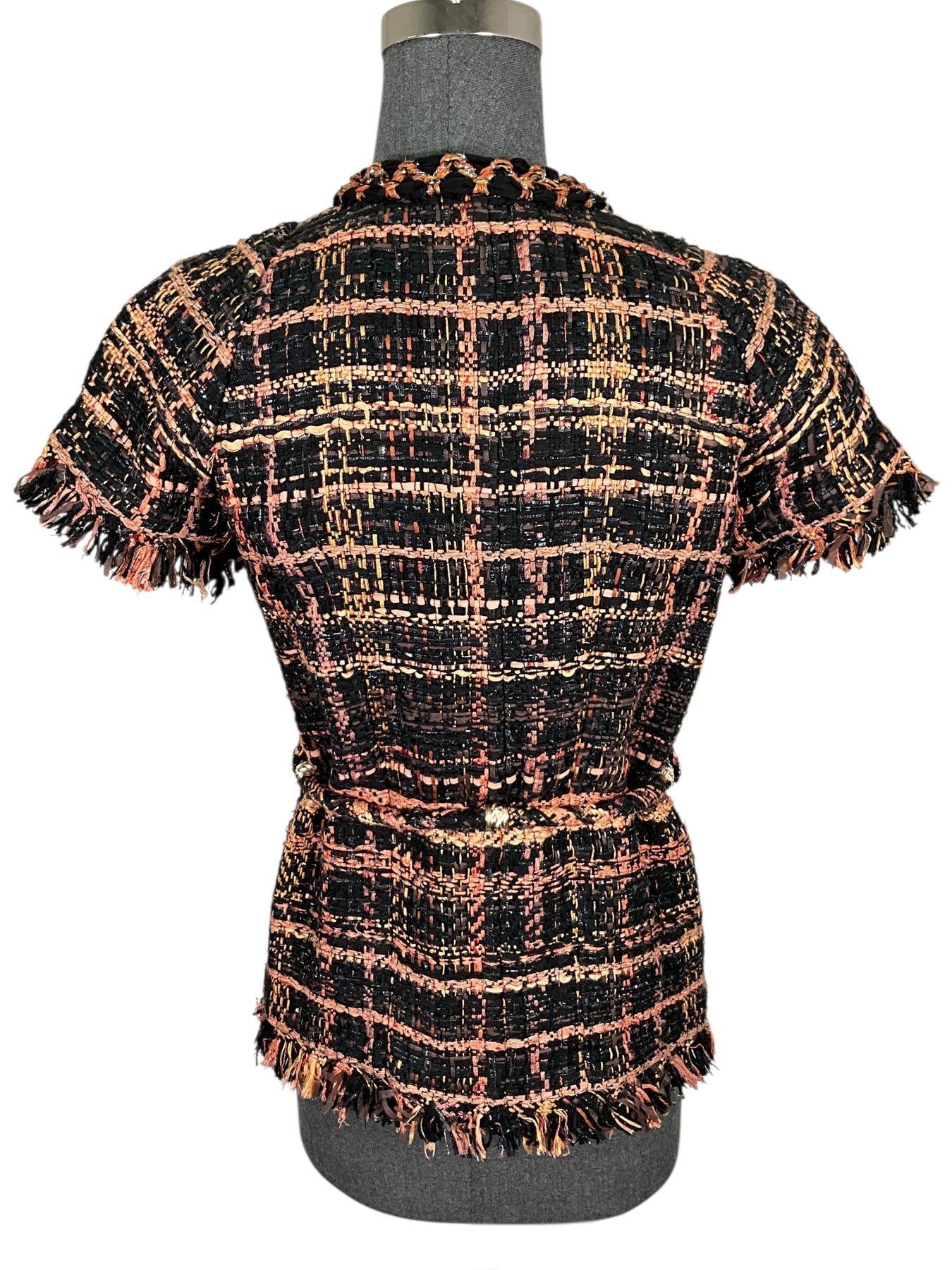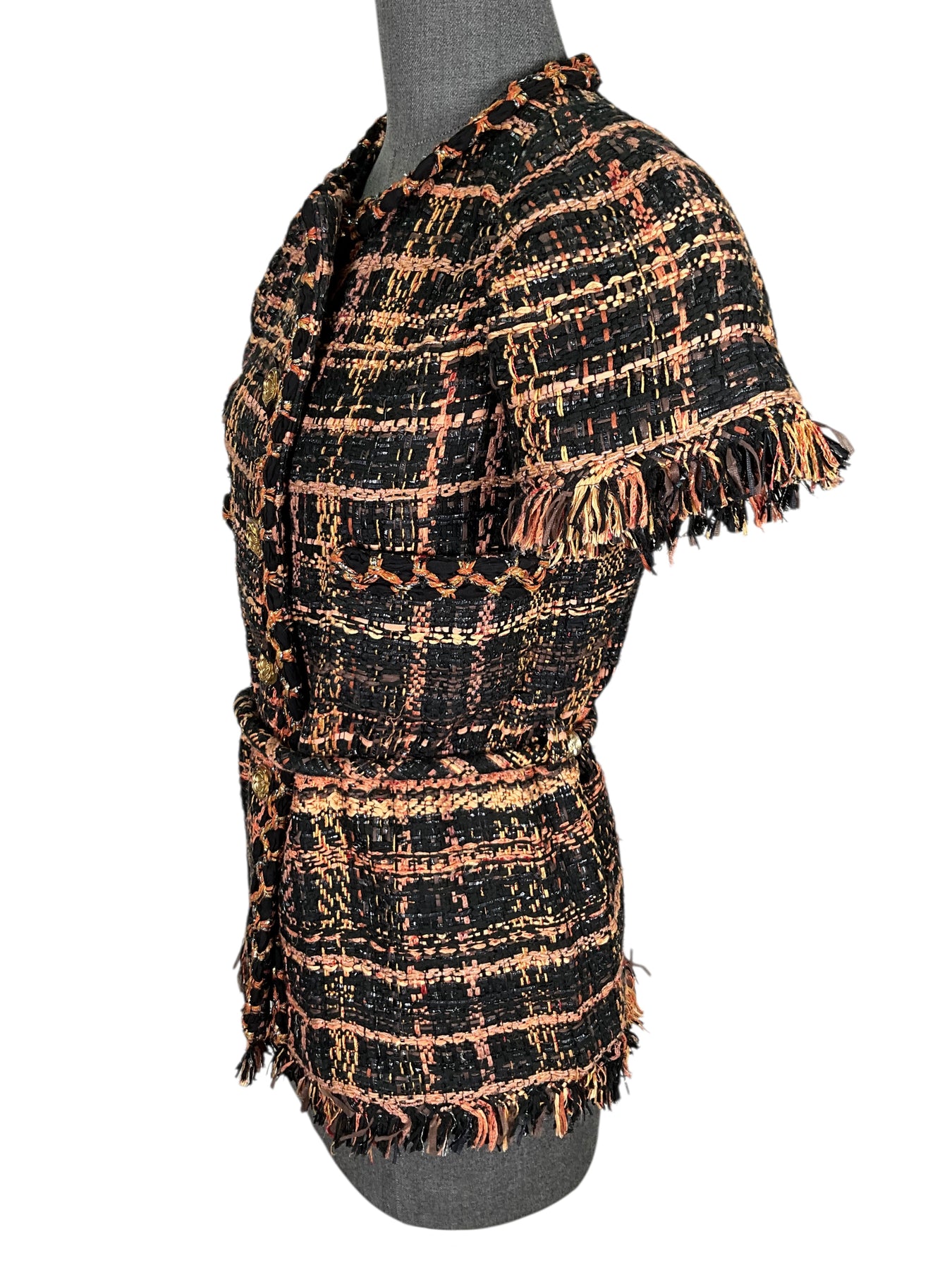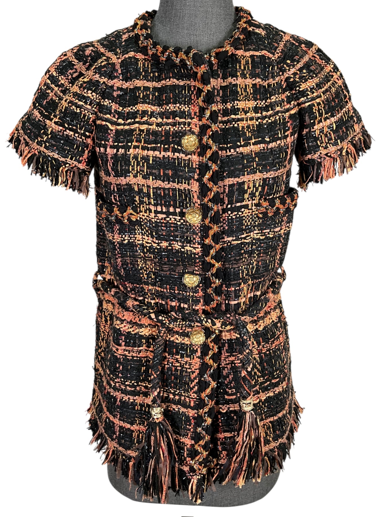 We guarantee the authenticity of this Chanel Cotton Tweed Short Sleeve Skirt Suit Size M crafted from a stunning orange, brown and black colorway with tweed boucle. Featuring fringe detail, a matching tweed cord belt and signature Camellia CC buttons. Includes matching pencil skirt.