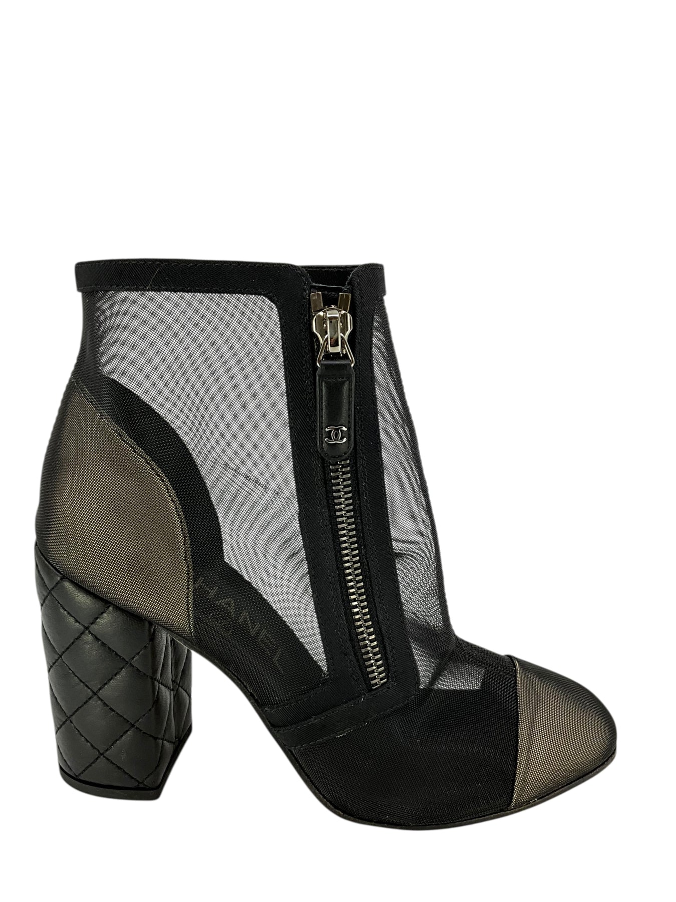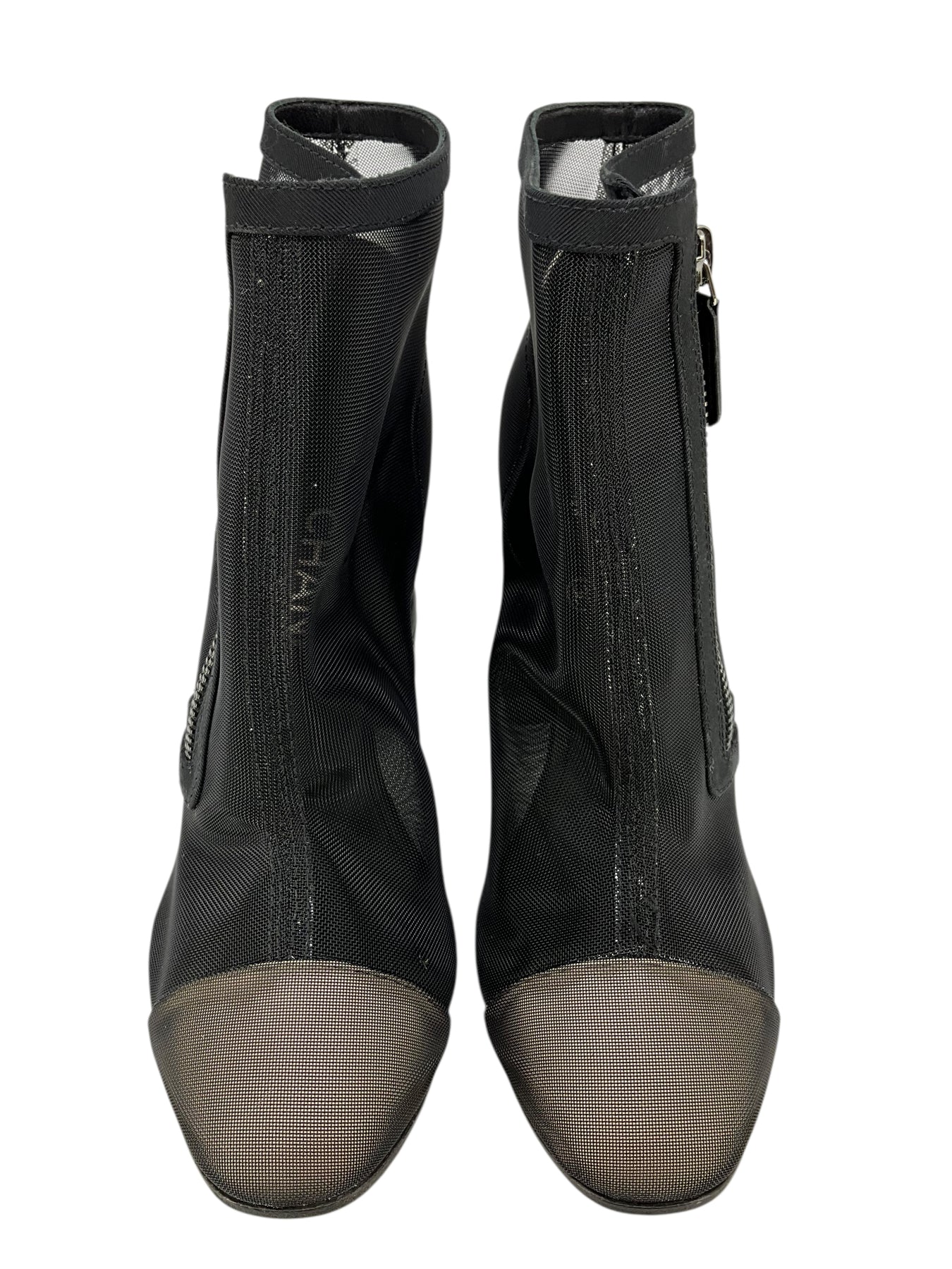 We guarantee the authenticity of these Chanel Mesh CC Logo Booties Size 7.5 crafted from black mesh uppers with a quilted leather logo accented heel and side zip CC logo closures.