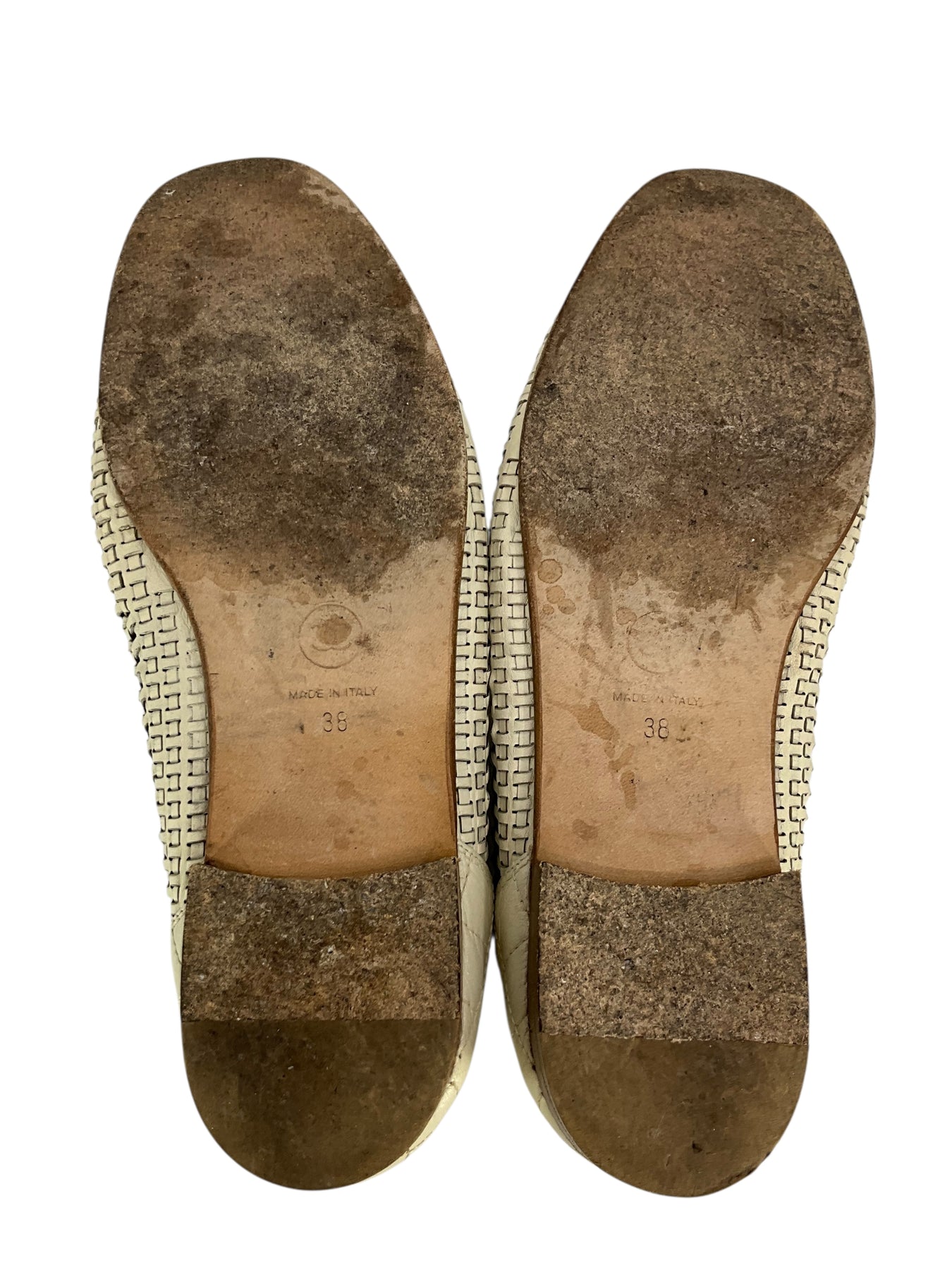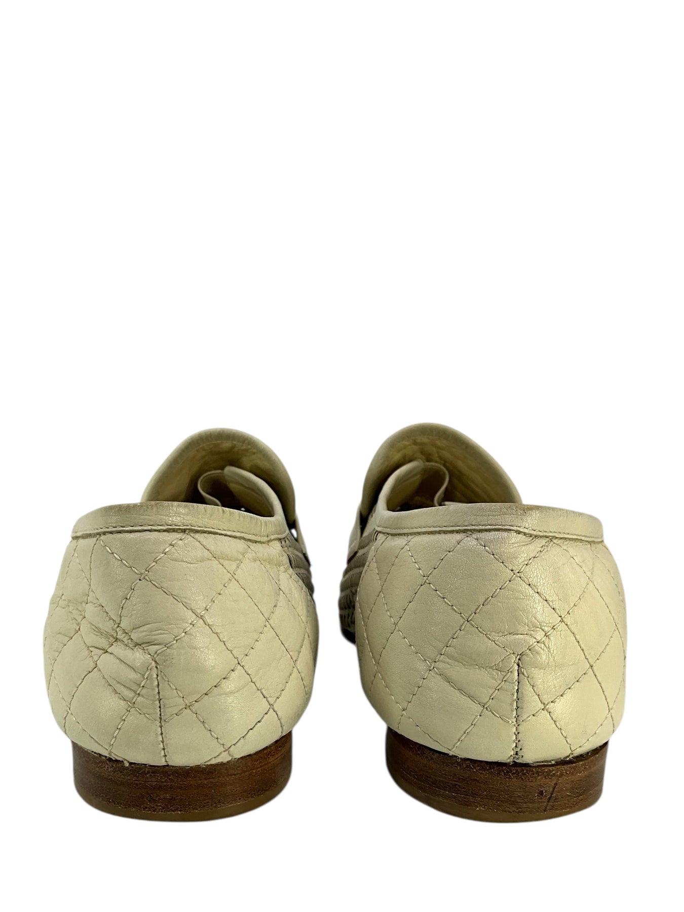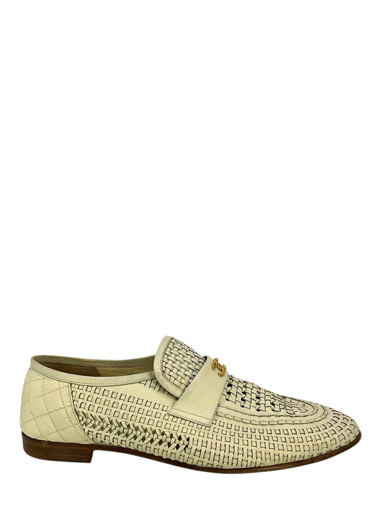 Add to your collection this authentic pair of Chanel Woven Leather CC Logo Loafers Size 8 crafted from supple cream leather uppers with a well-rounded toe. Featuring a signature gold-tone CC logo accent on the vamp and a low stacked heel.