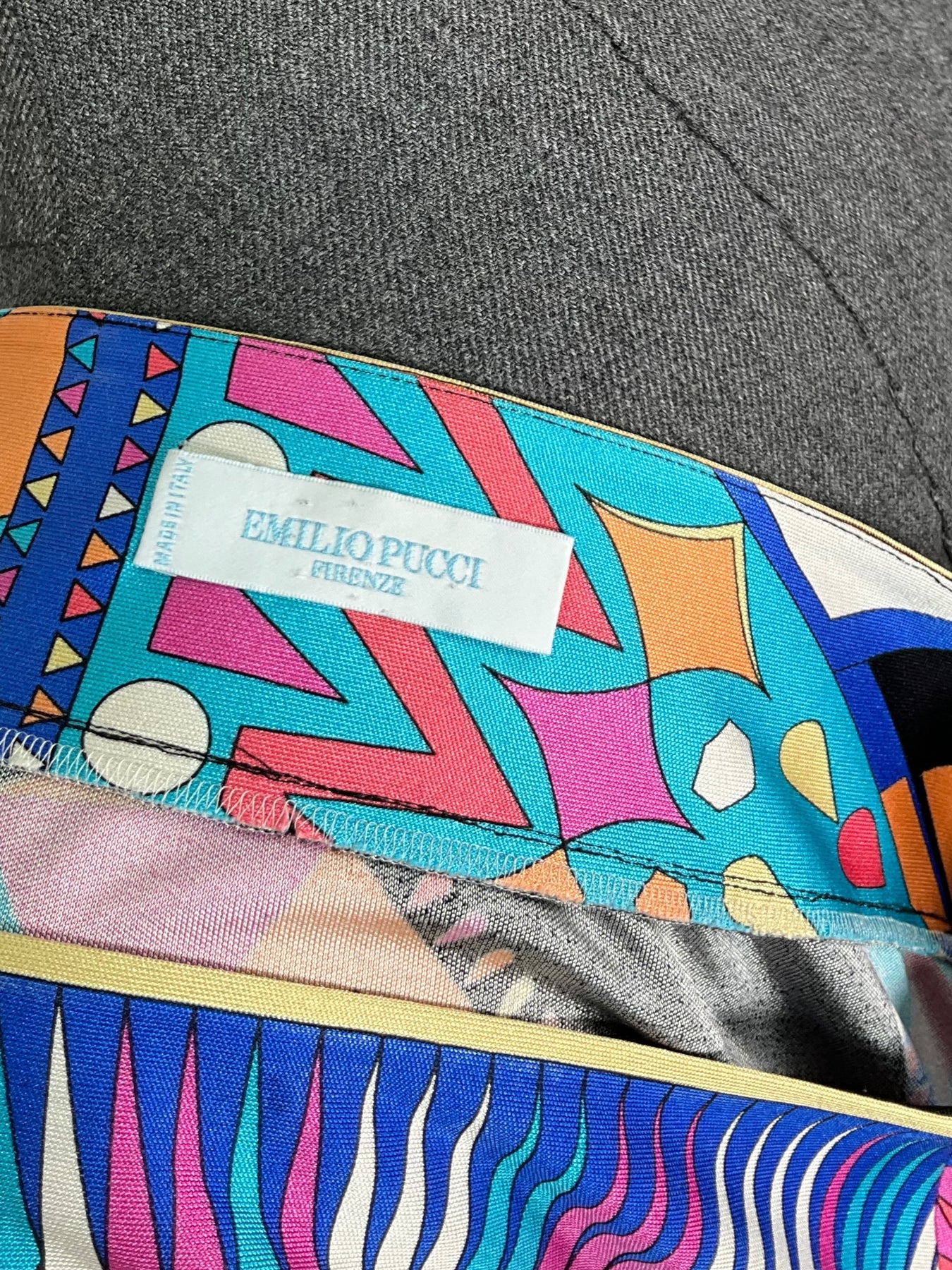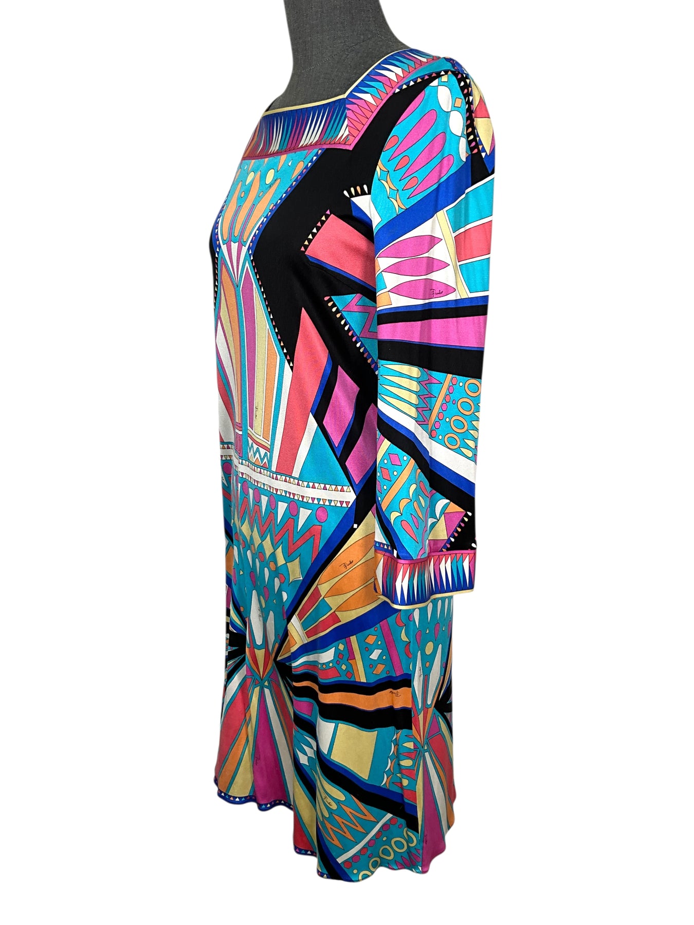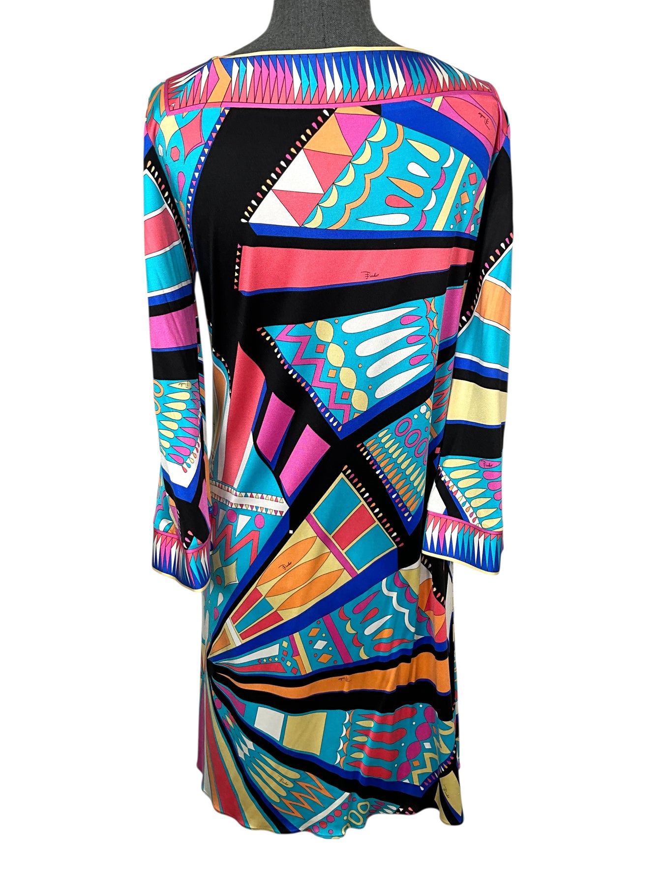 We guarantee the authenticity of this never before used Emilio Pucci Abstract Printed Jersey Dress Size L (10) featuring a beautiful multicolored abstract print with a square neckline and long sleeves.