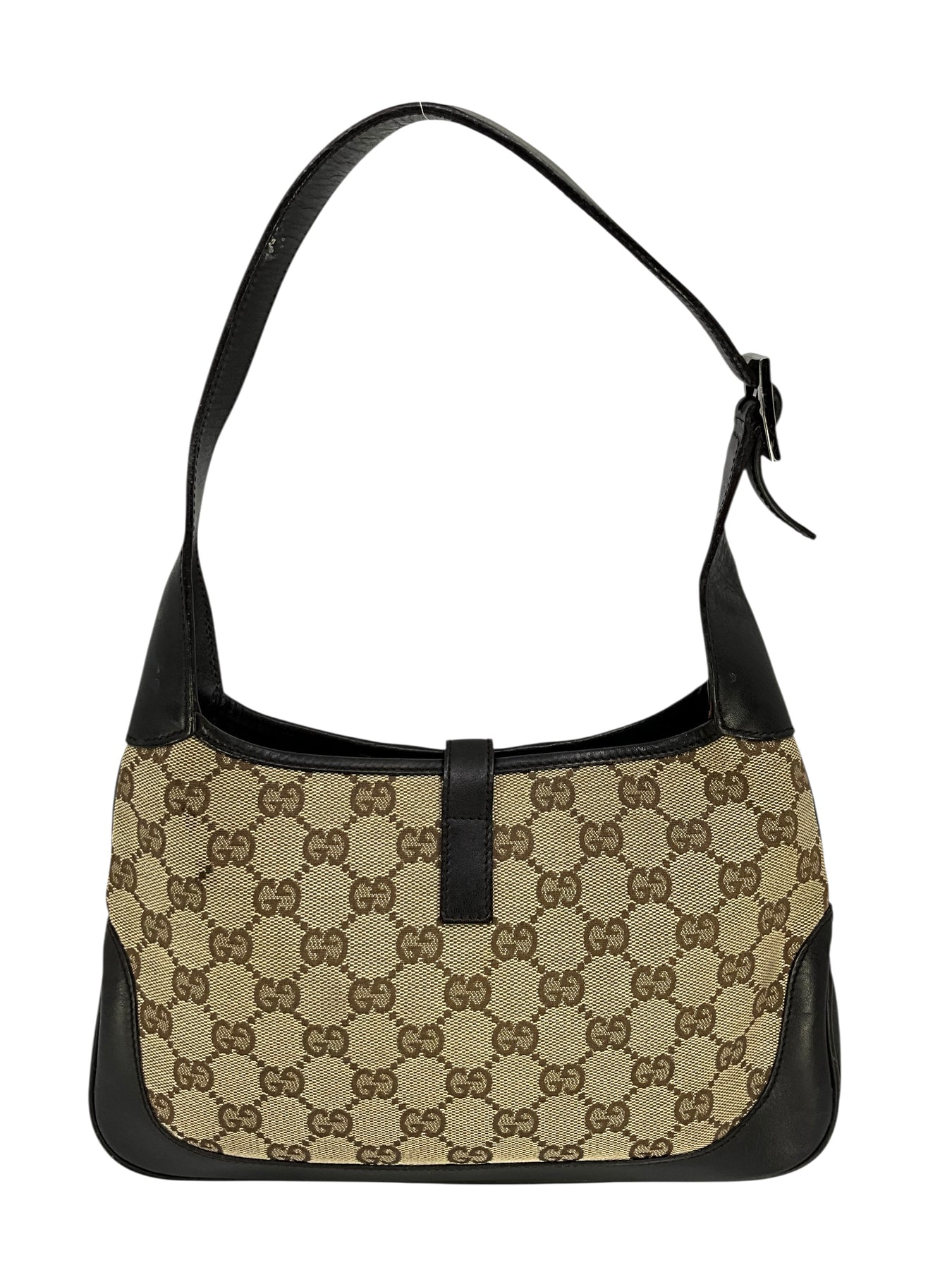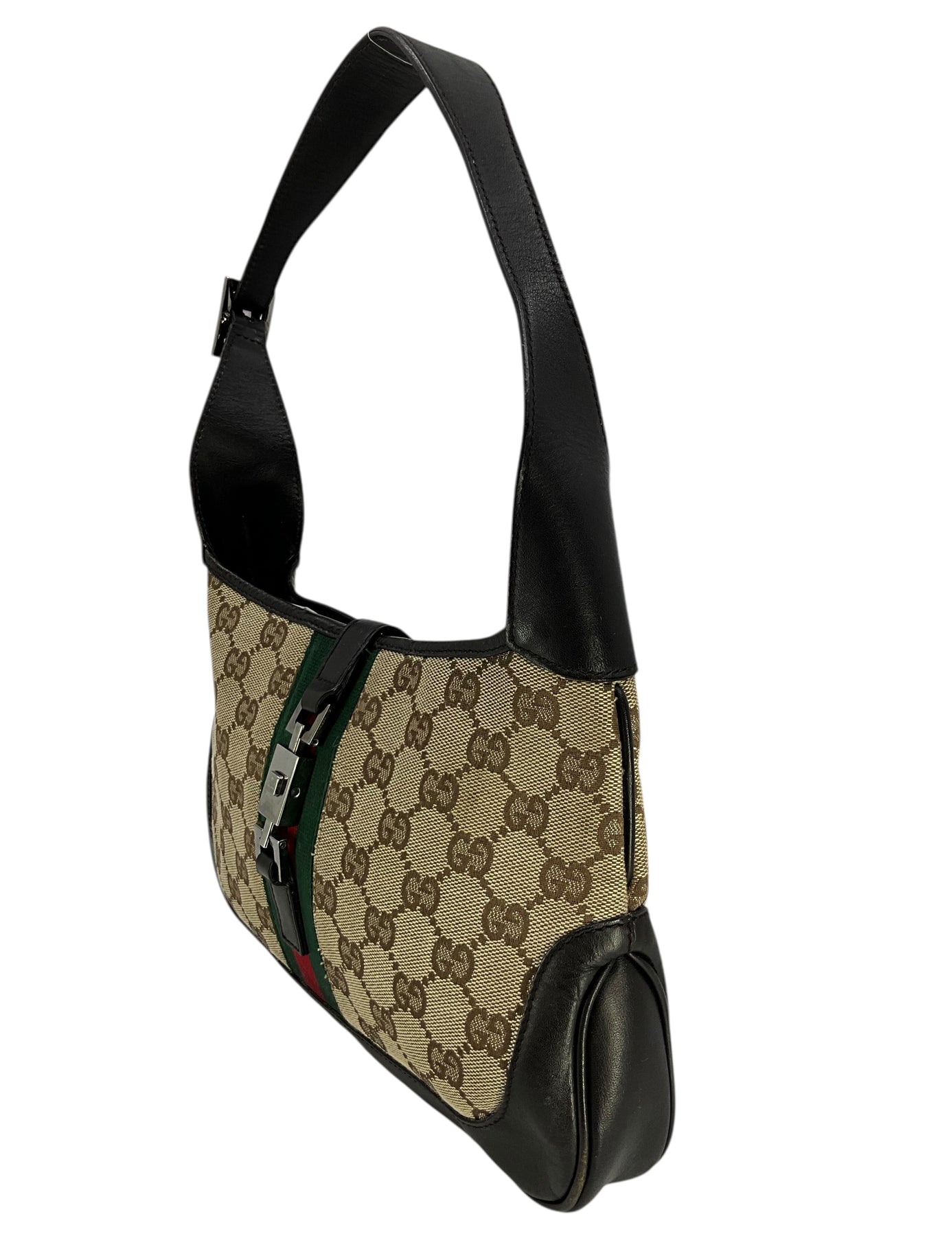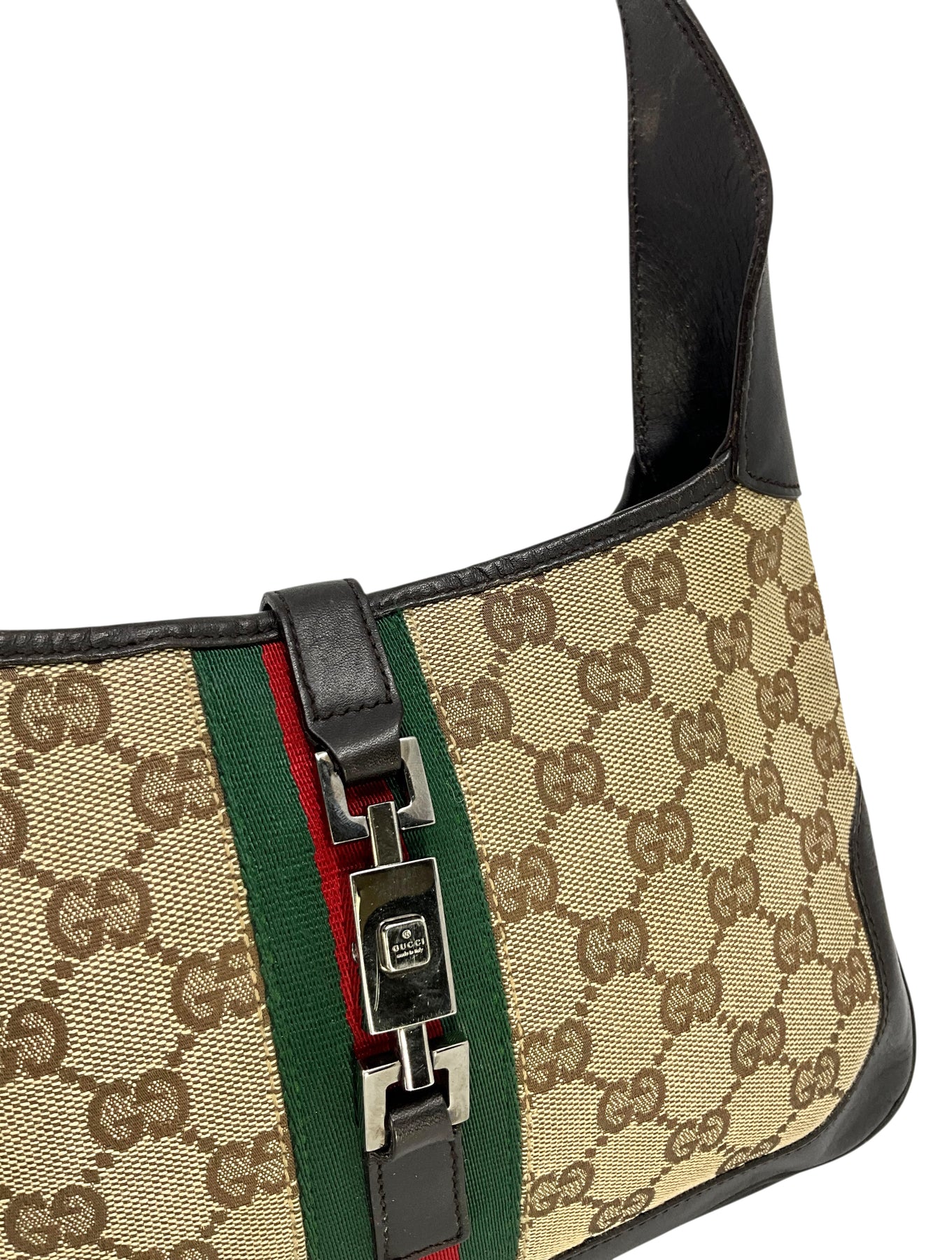 Guaranteed authentic Gucci Monogram Canvas Jackie O Hobo Bag crafted in brown monogram canvas with a luxurious brown leather trim. This classic bag features a flat leather shoulder strap and is accented with a signature logo-engraved piston-lock closure.