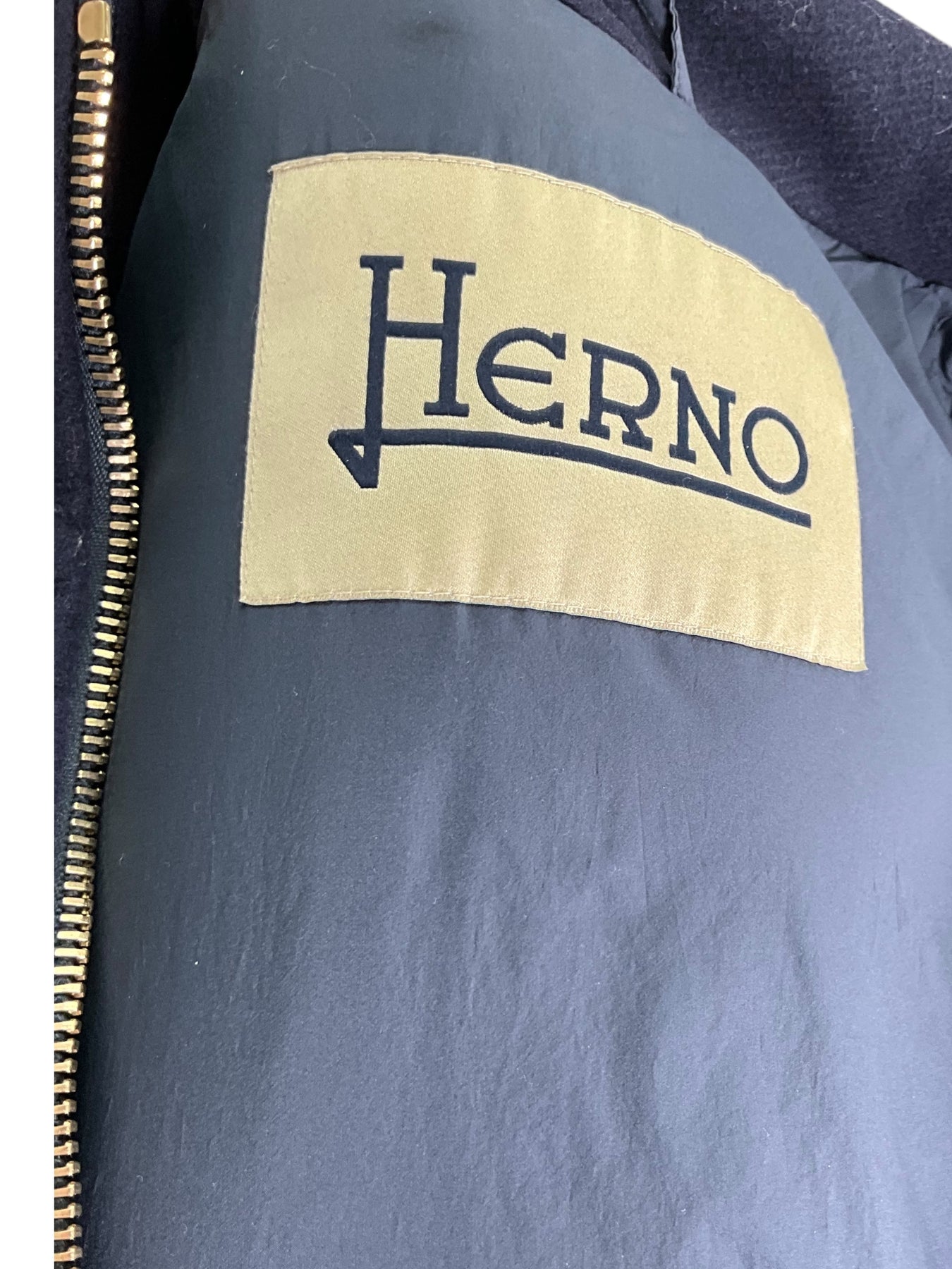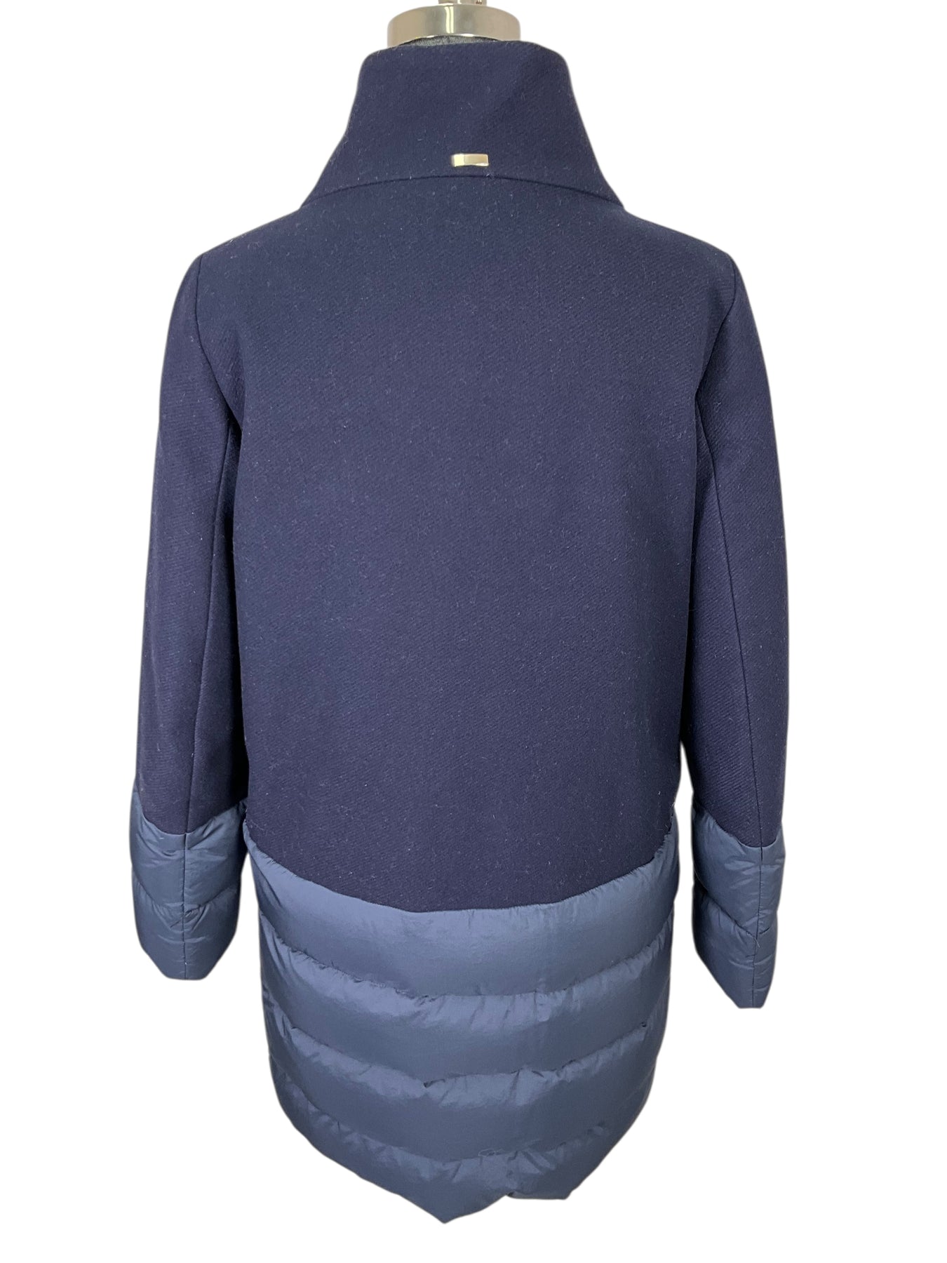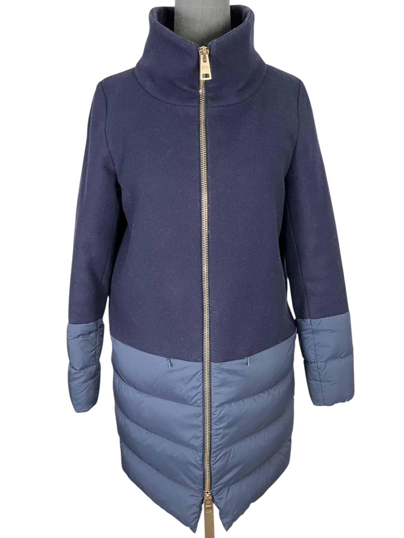 Guaranteed Authentic! Herno Nuage Mixed Media Coat Size M (IT 42) crafted in beautiful navy blue wool with a puffy quilted lightweight nylon trim. Featuring two zip pockets and front zip closures.