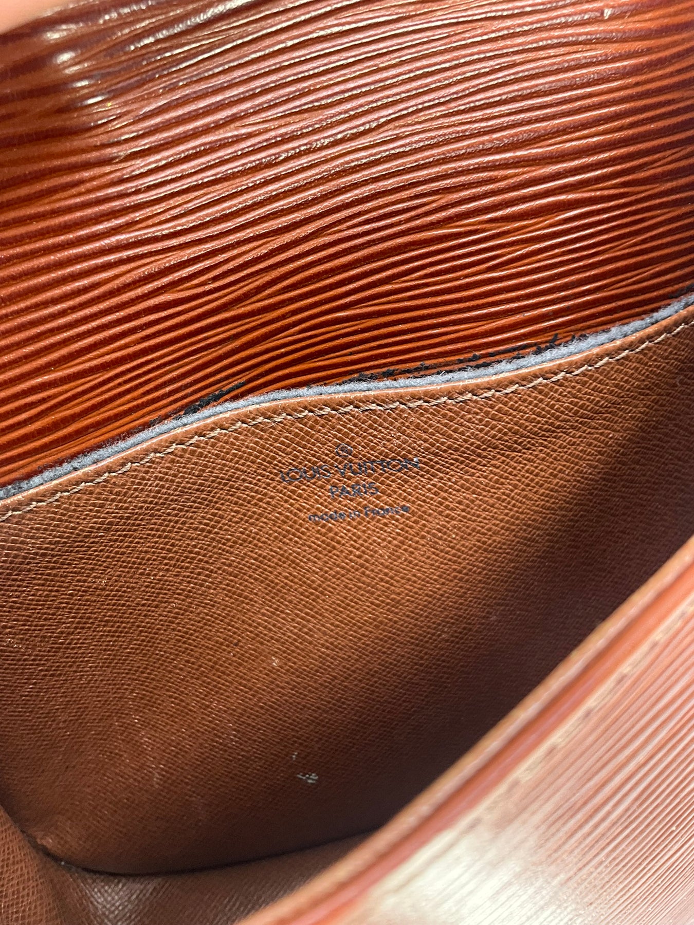 Condition: Good. The exterior has surface scratches, particularly on the rear of the bag. The bottom edge corners have mild scuffing. The interior cross-grain lining is clean overall. The inside of the exterior and interior pockets have peeling throughout.