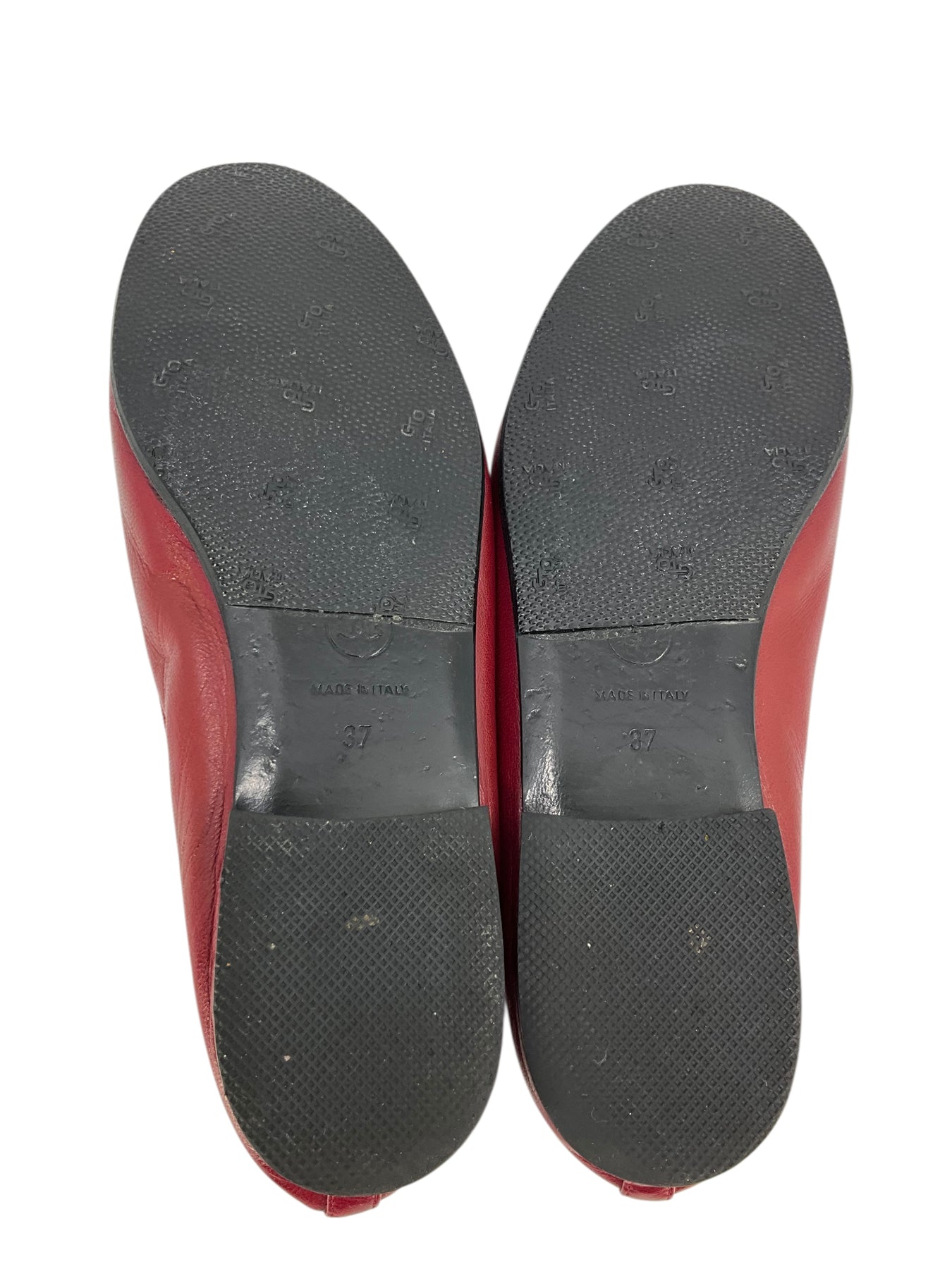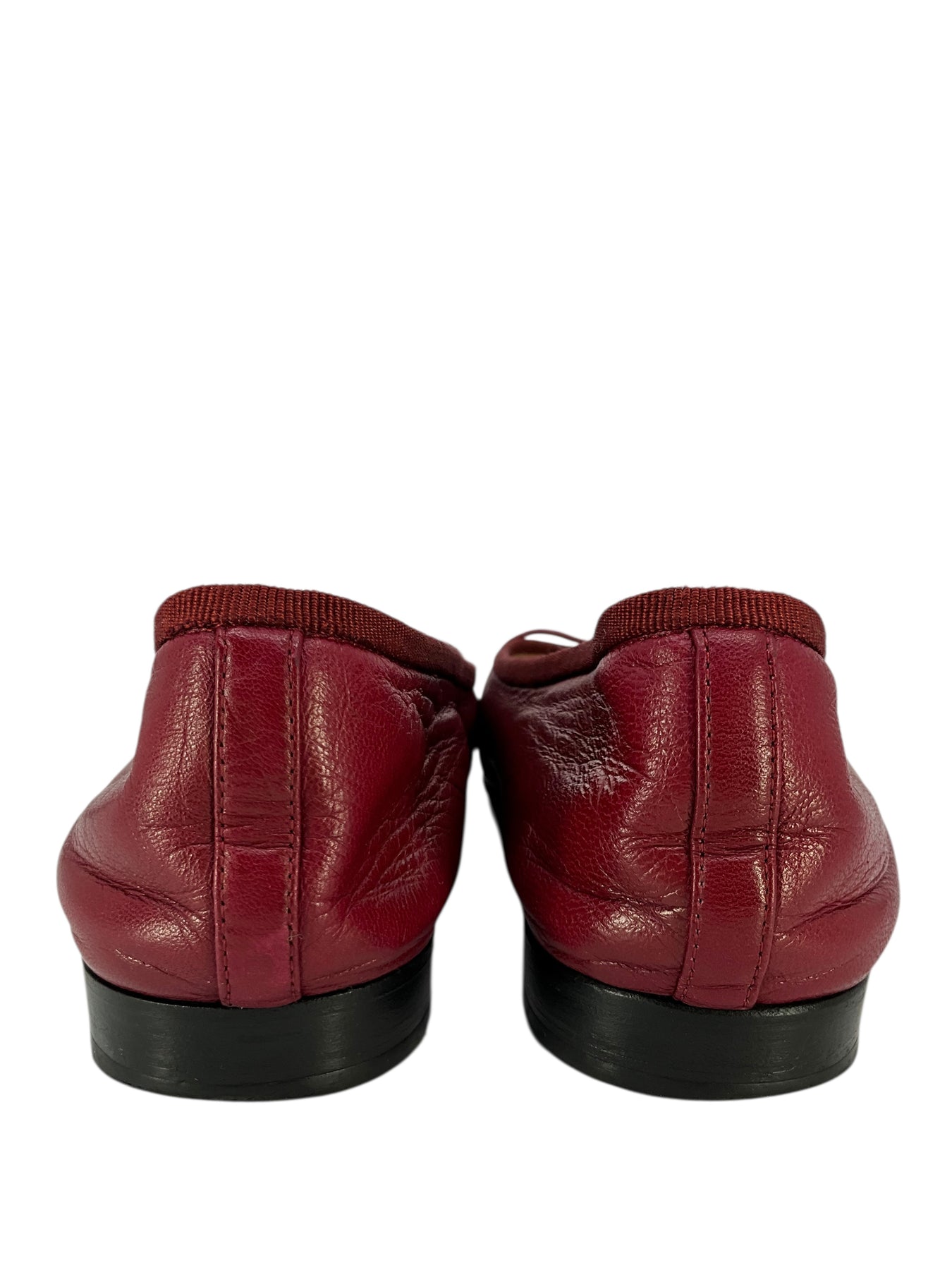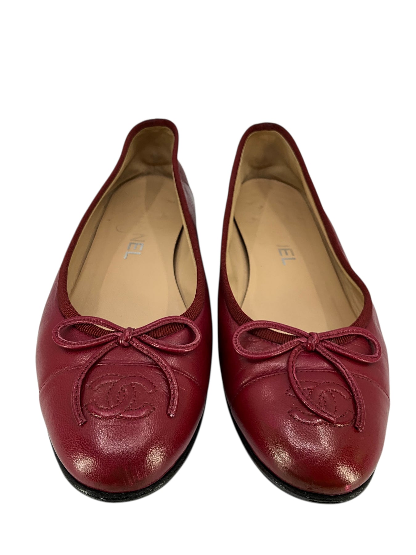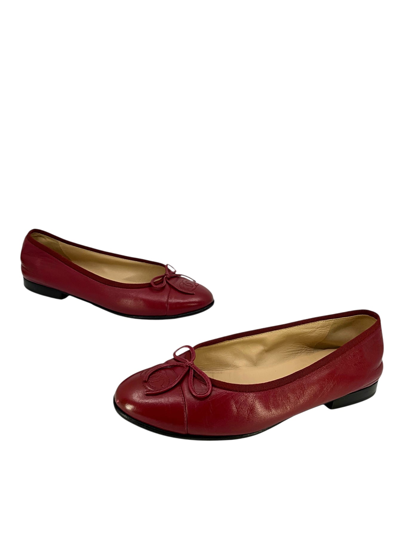 Step out in style with these classic Chanel CC Cap Toe Lambskin Leather Ballet Flats Size 7 crafted from supple burgundy lambskin. Featuring a matching tonal leather CC logo cap-toe with a bow tie accent on the vamp.