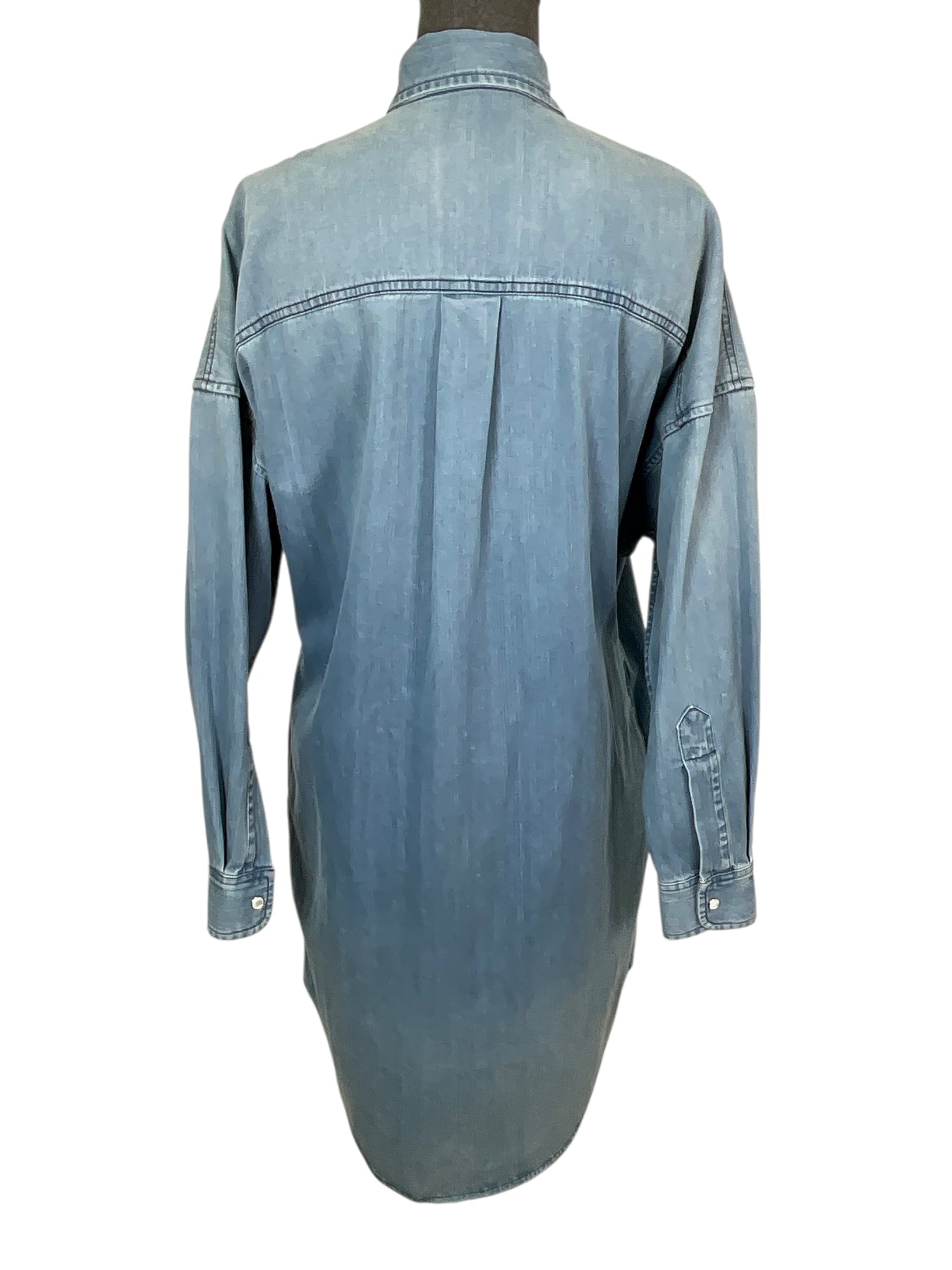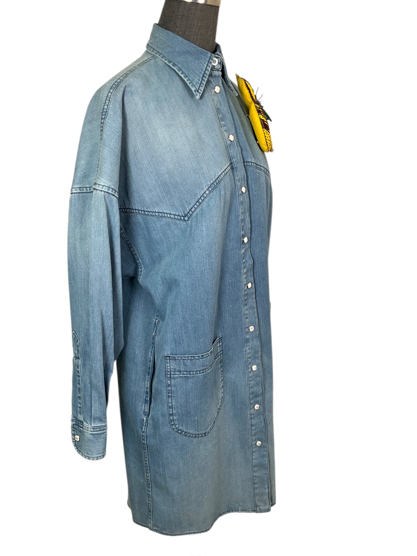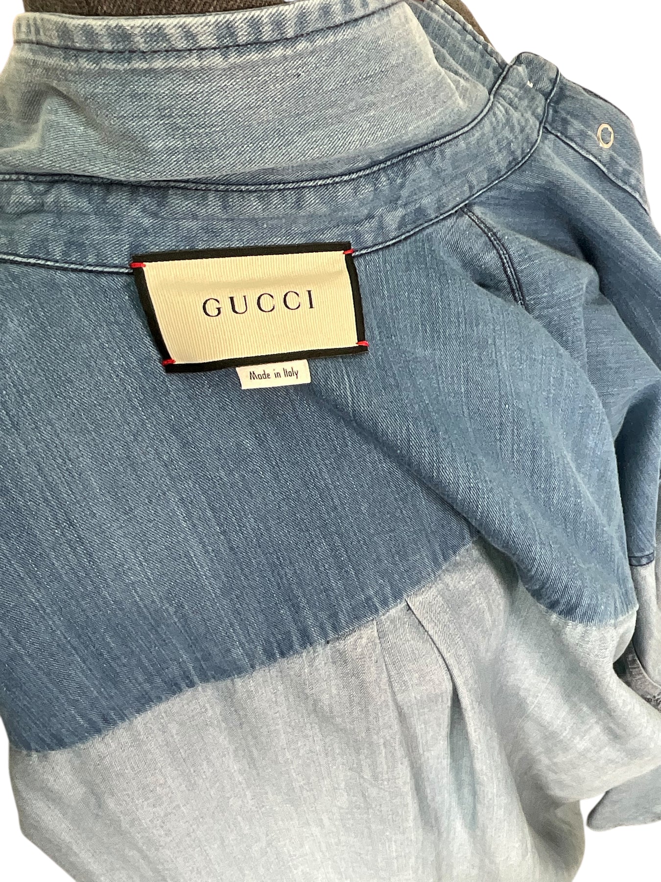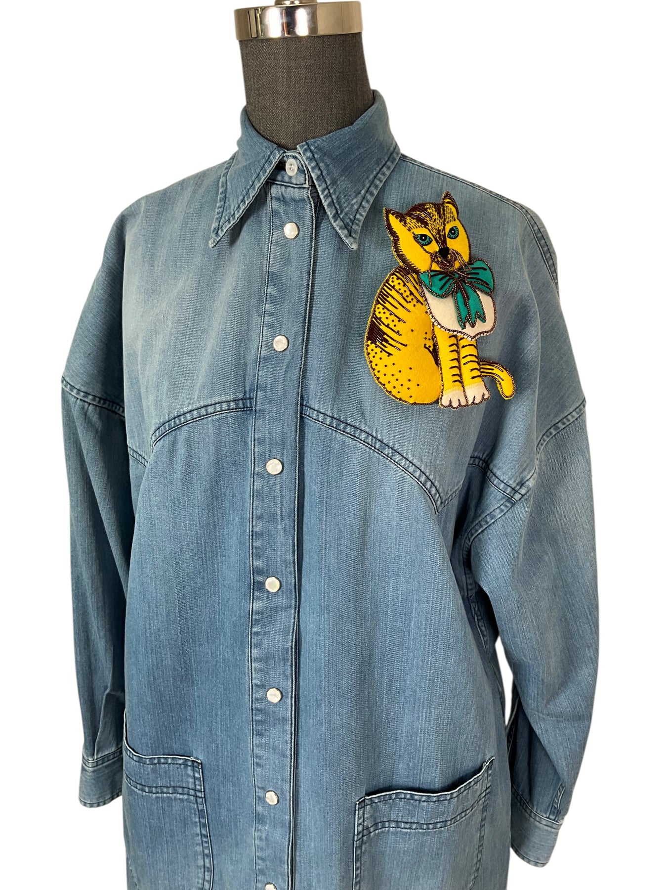 We guarantee the authenticity of this GUCCI Kitten Denim Oversized Shirt Dress Size XS (IT 36) crafted in soft medium washed denim with snap closures and a large yellow cat brooch accent.