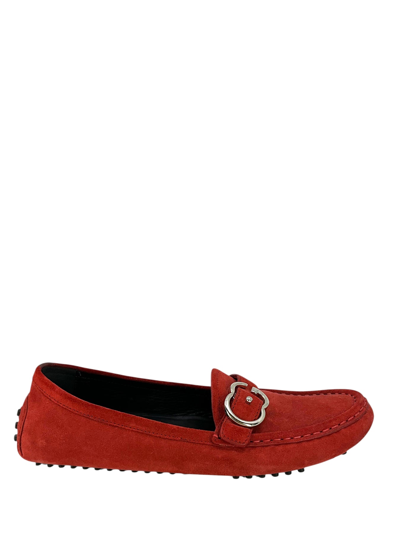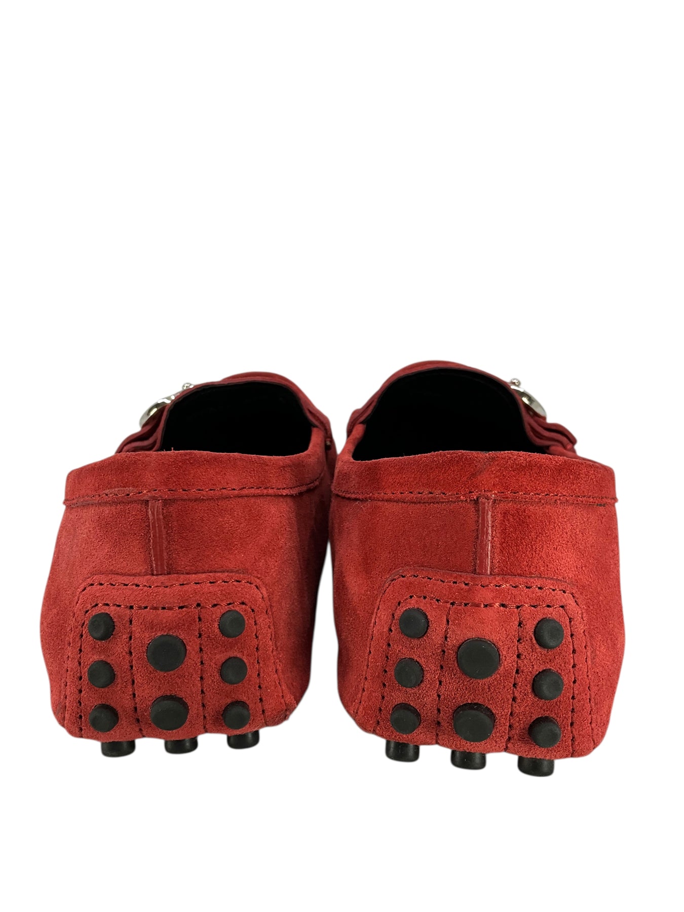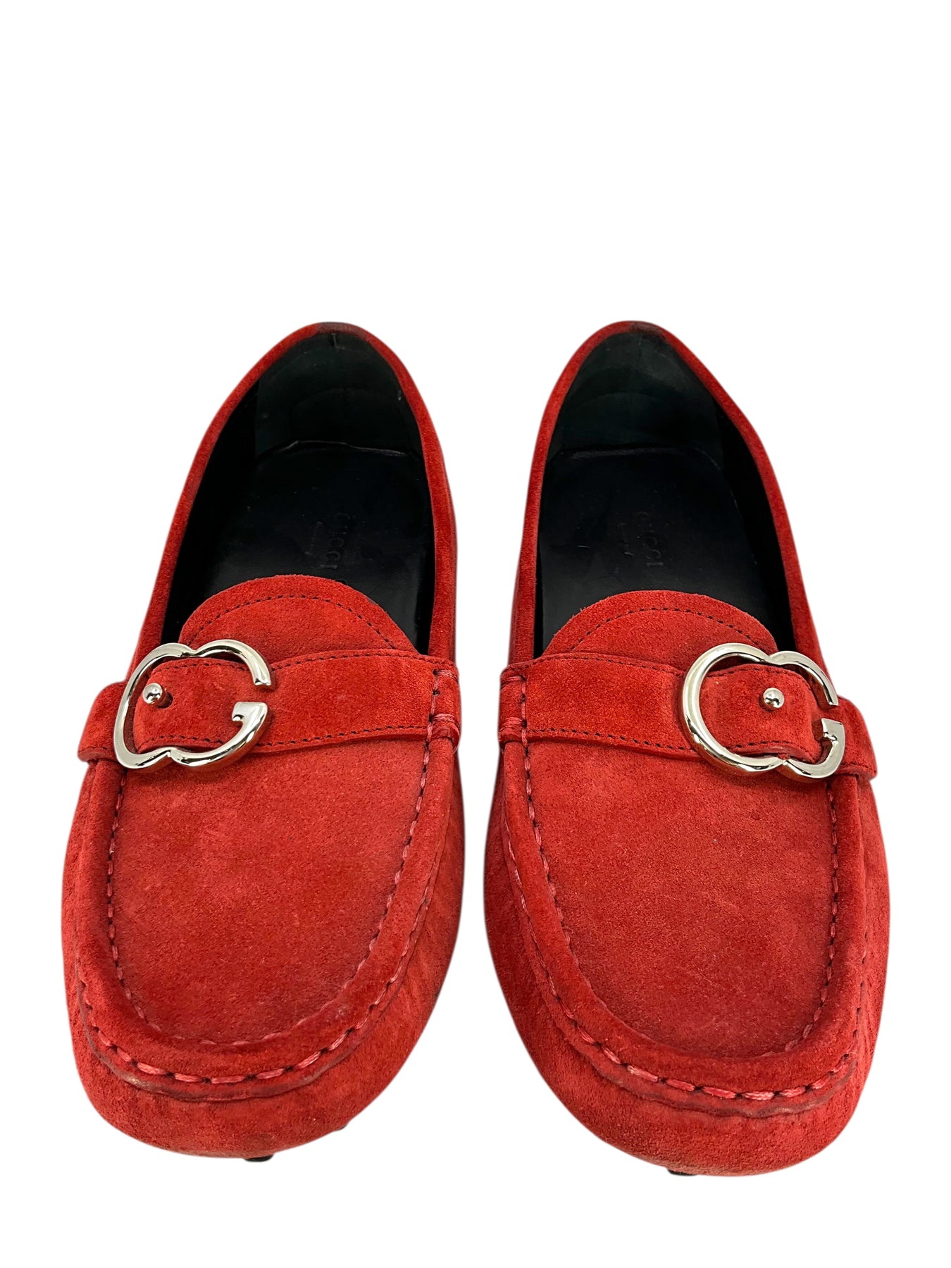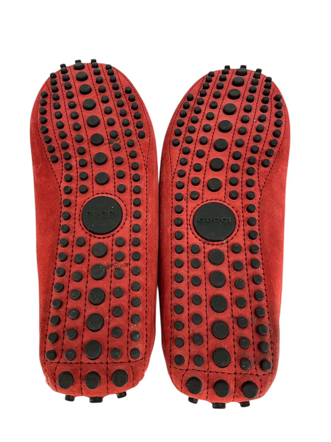 We guarantee the authenticity of these Gucci Suede GG Logo Driver Loafers Size 7.5 crafted from beautiful red suede with a rounded toe. Featuring silver-tone GG logo hardware and rubber driving soles.