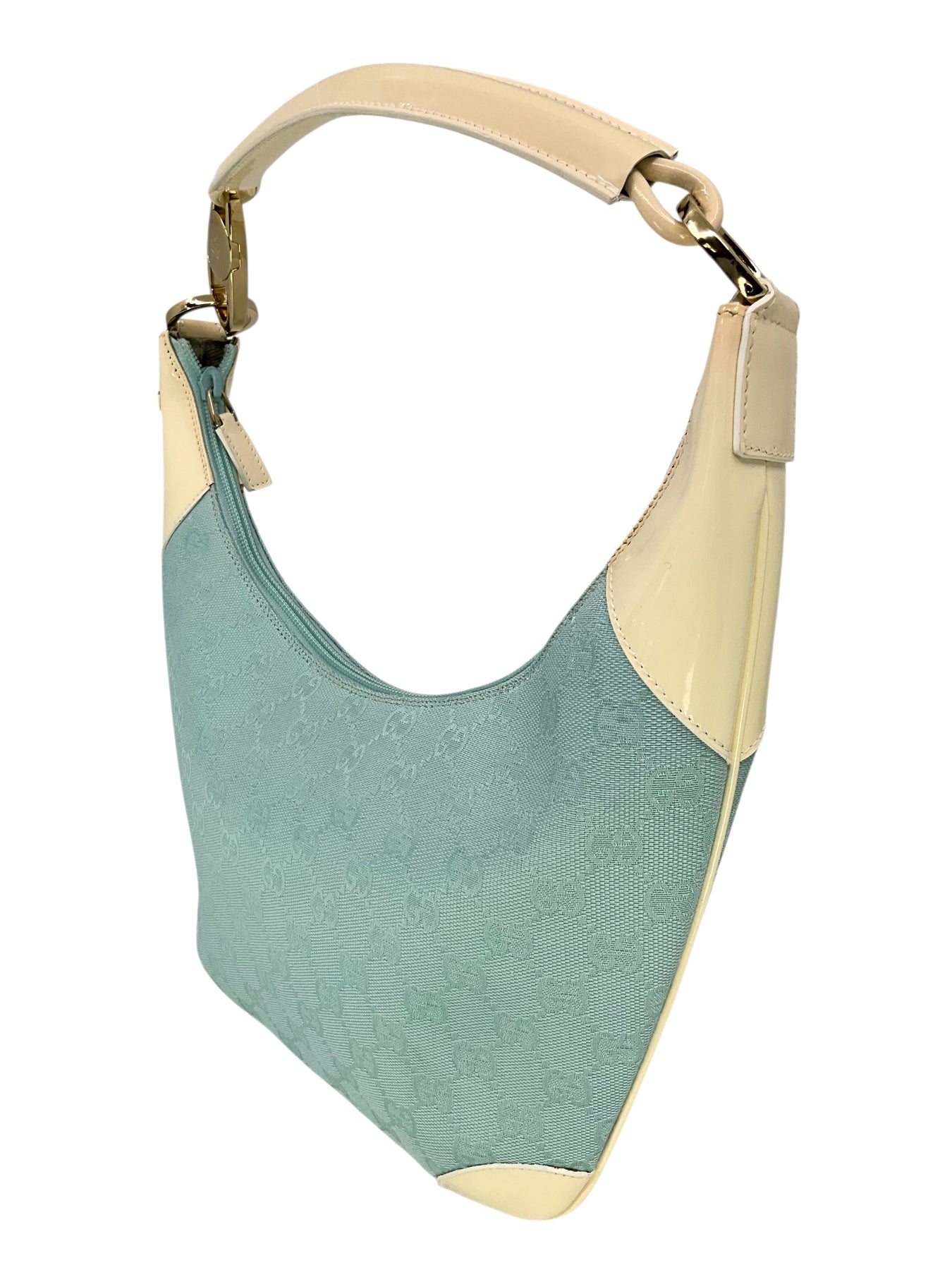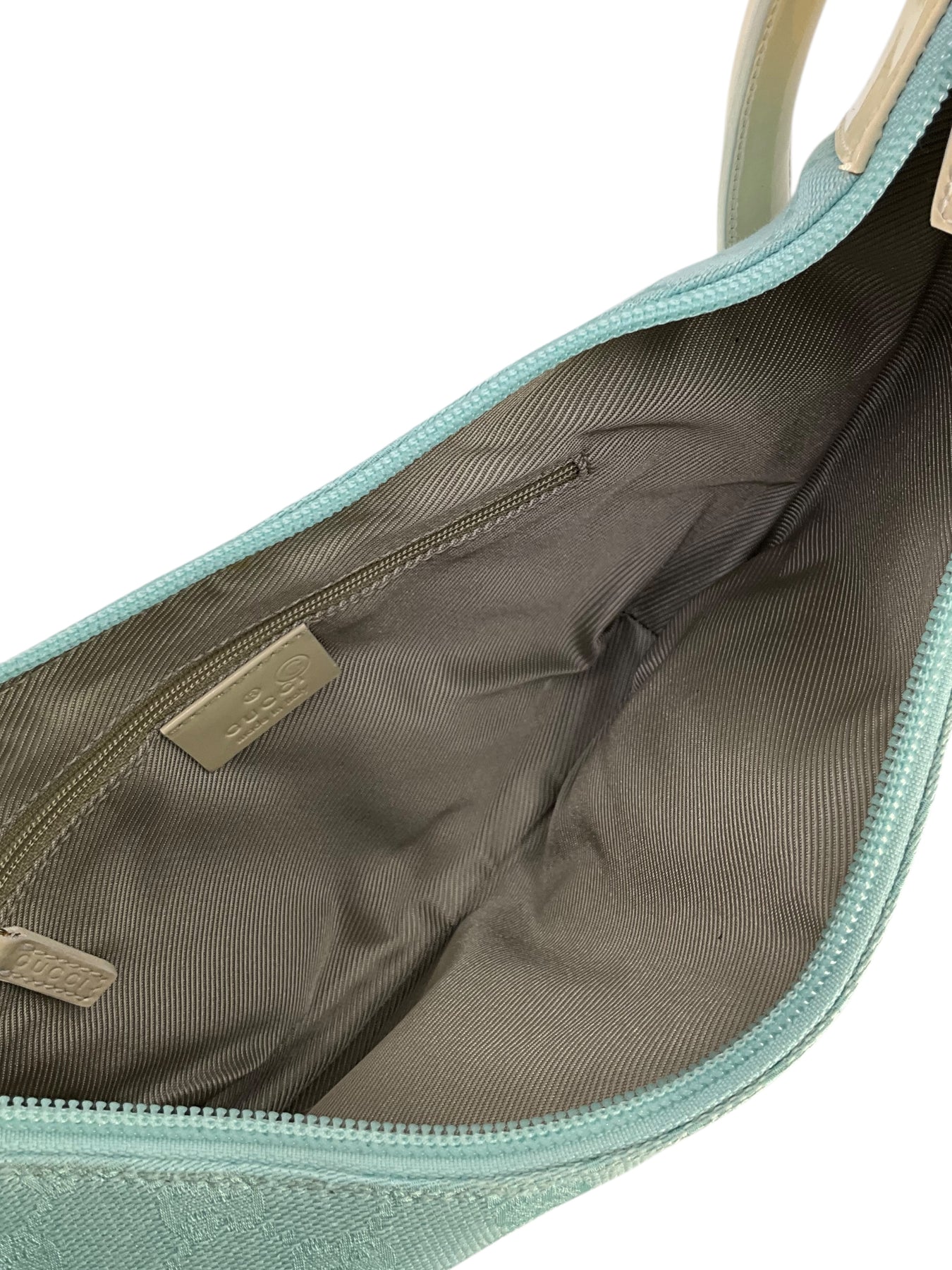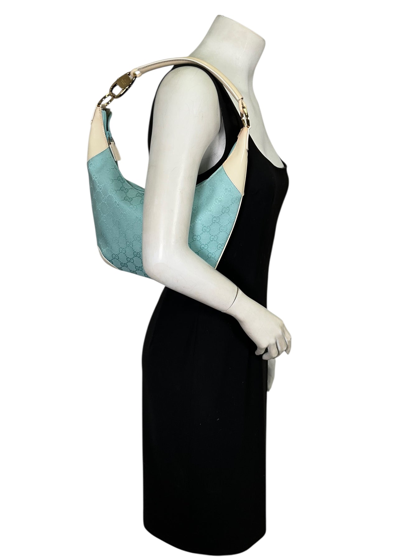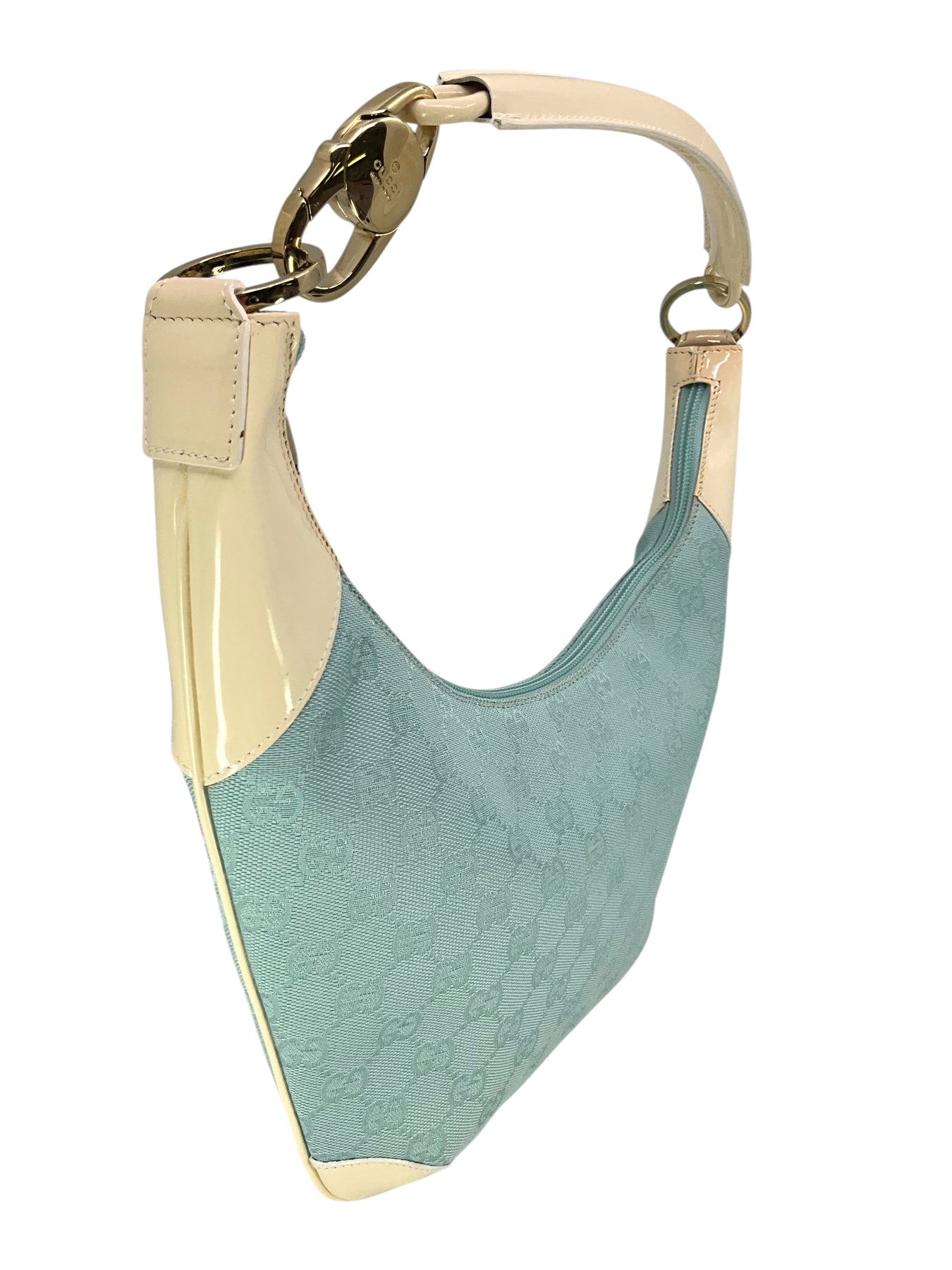We guarantee the authenticity of this classic Gucci Vintage GG Canvas Shoulder Bag crafted from in turquoise monogram canvas and gold-tone hardware. Featuring a white patent leather trim, including a tubular shoulder strap.