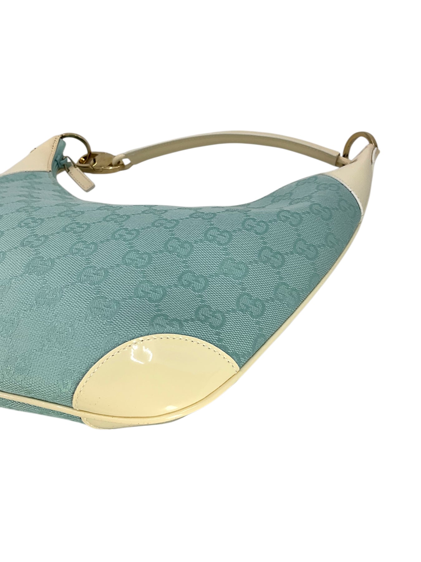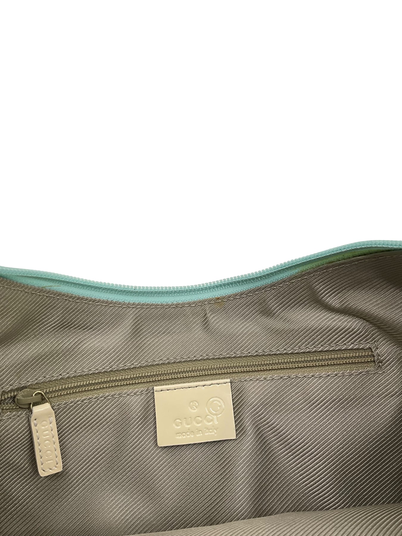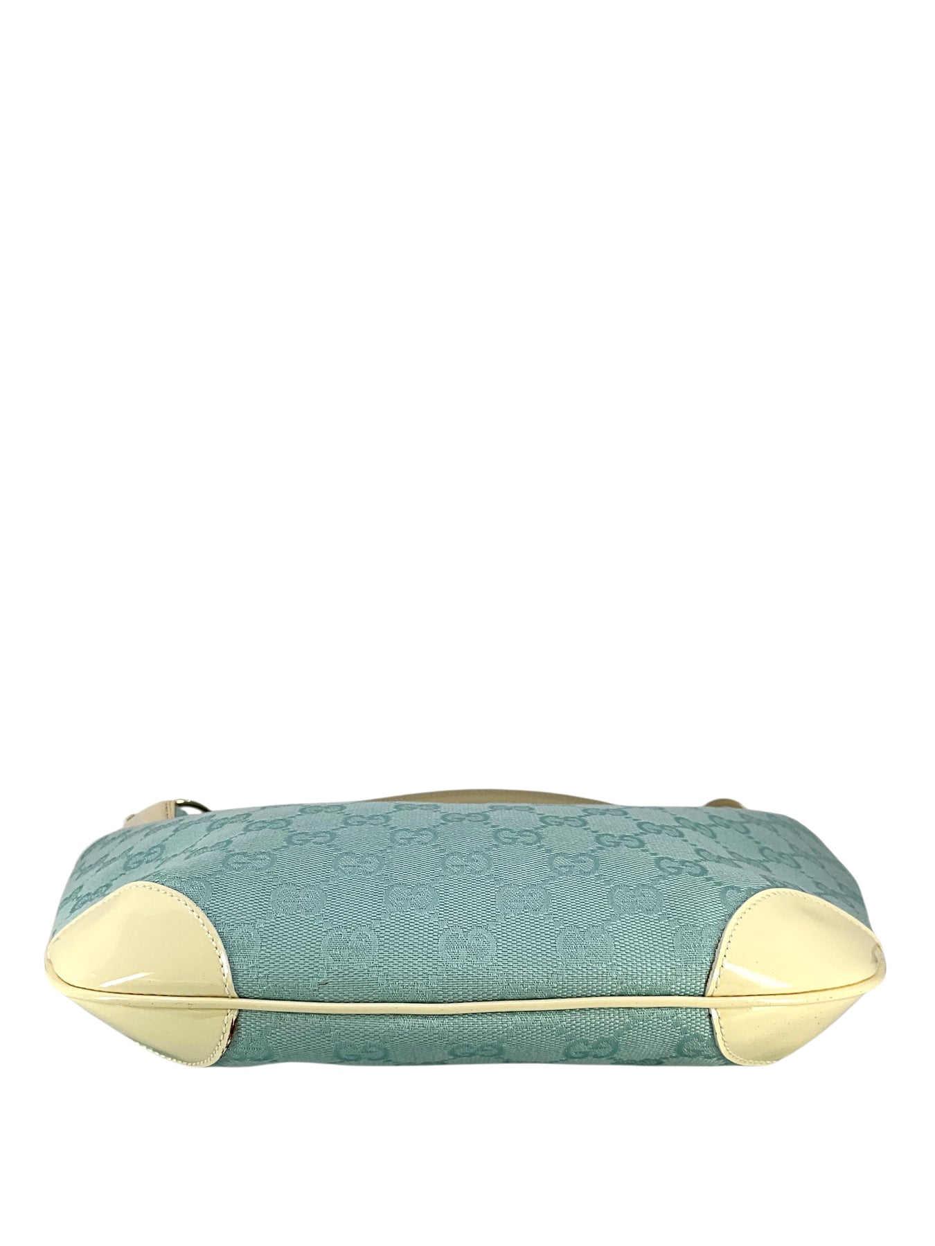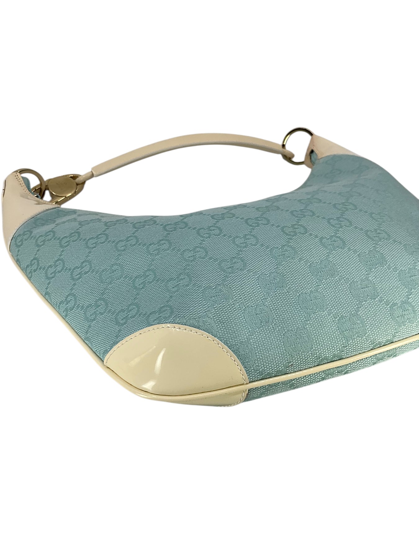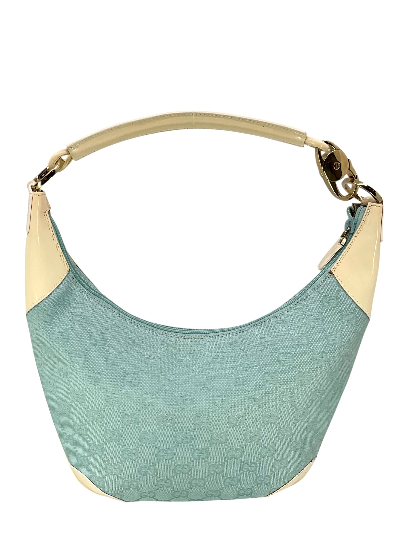 We guarantee the authenticity of this classic Gucci Vintage GG Canvas Shoulder Bag crafted from in turquoise monogram canvas and gold-tone hardware. Featuring a white patent leather trim, including a tubular shoulder strap.