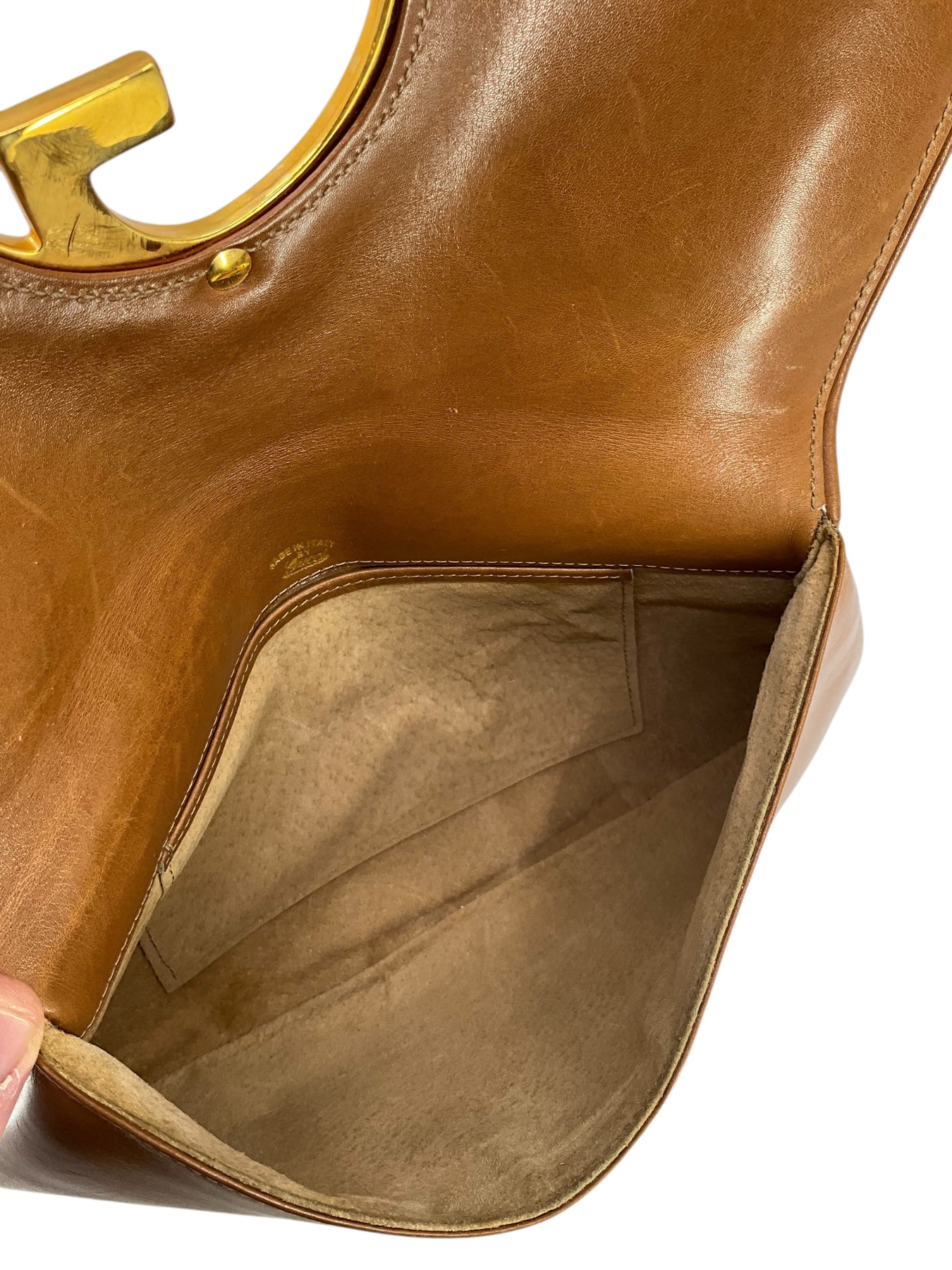 Condition: Good. Scratches throughout the exterior. The gold-tone hardware has surface scratches. The interior suede lining is perfect.