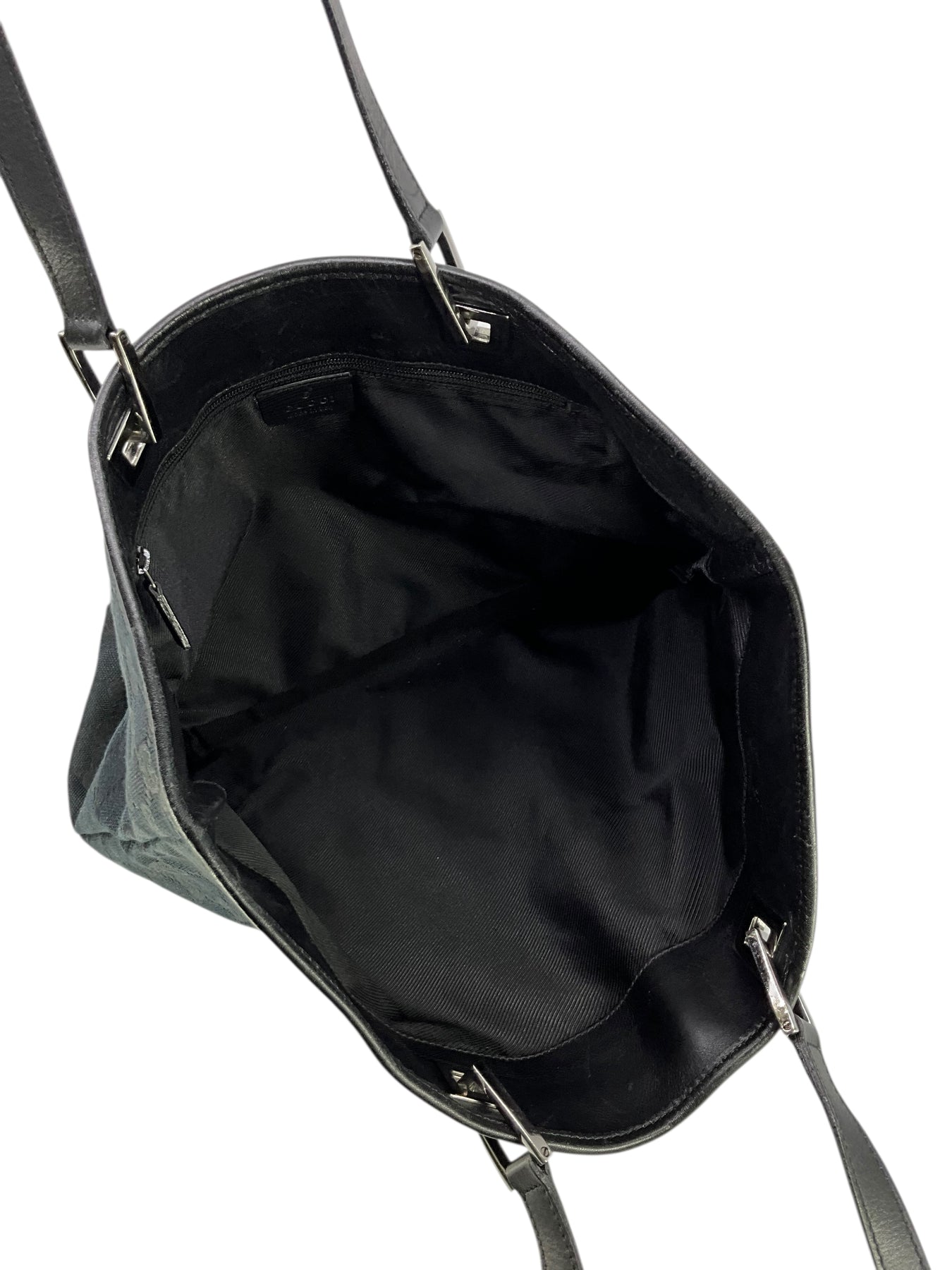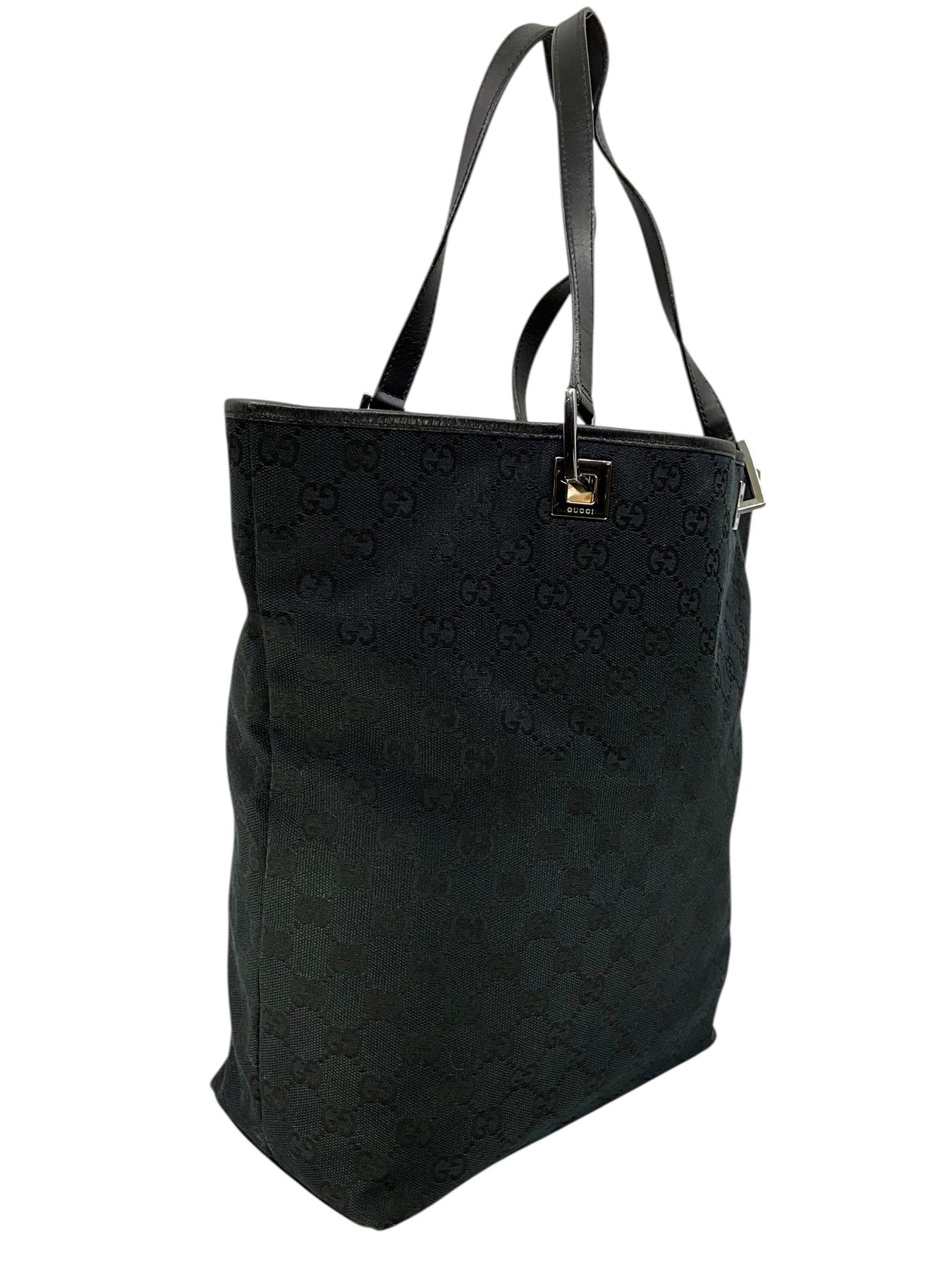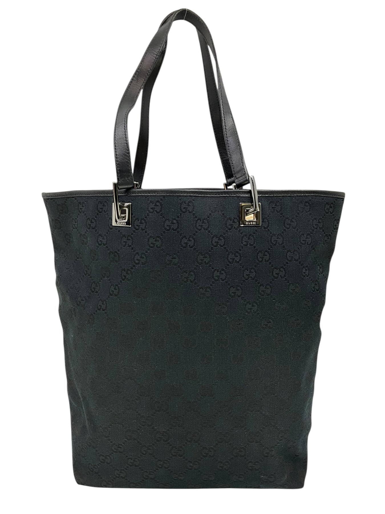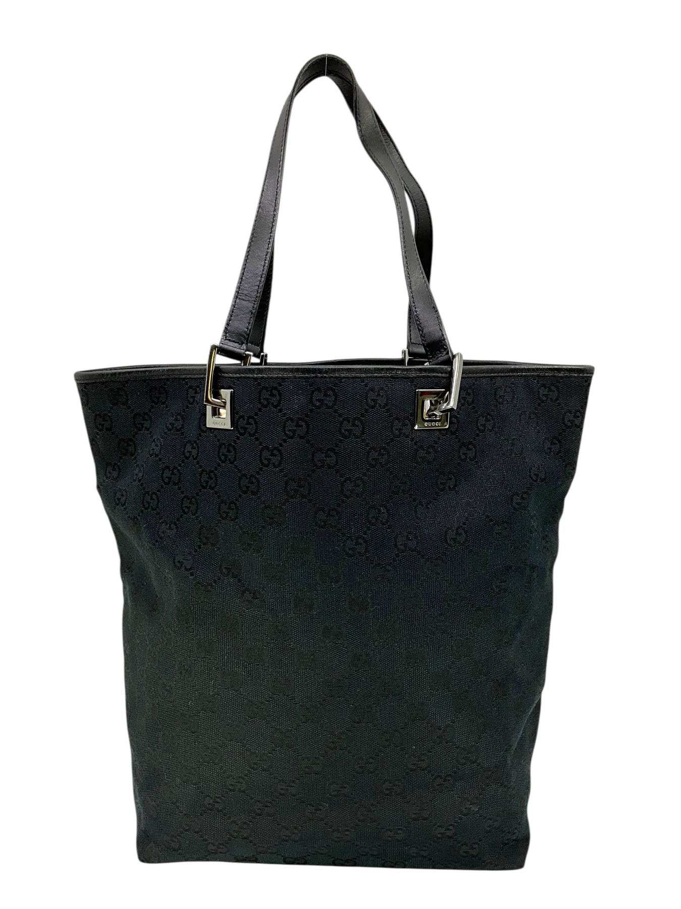 We guarantee the authenticity of this classic Gucci Vintage Monogram Canvas Tote Bag featuring black monogram canvas with a black leather trim and silver-tone hardware. This signature tote has dual flat leather shoulder straps and logo-engraved detailing on the hardware.