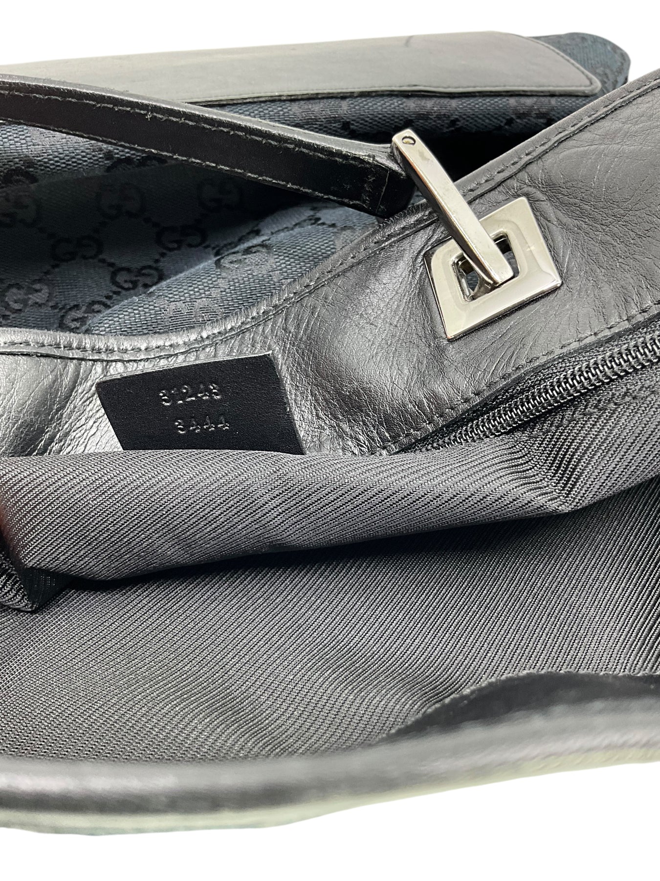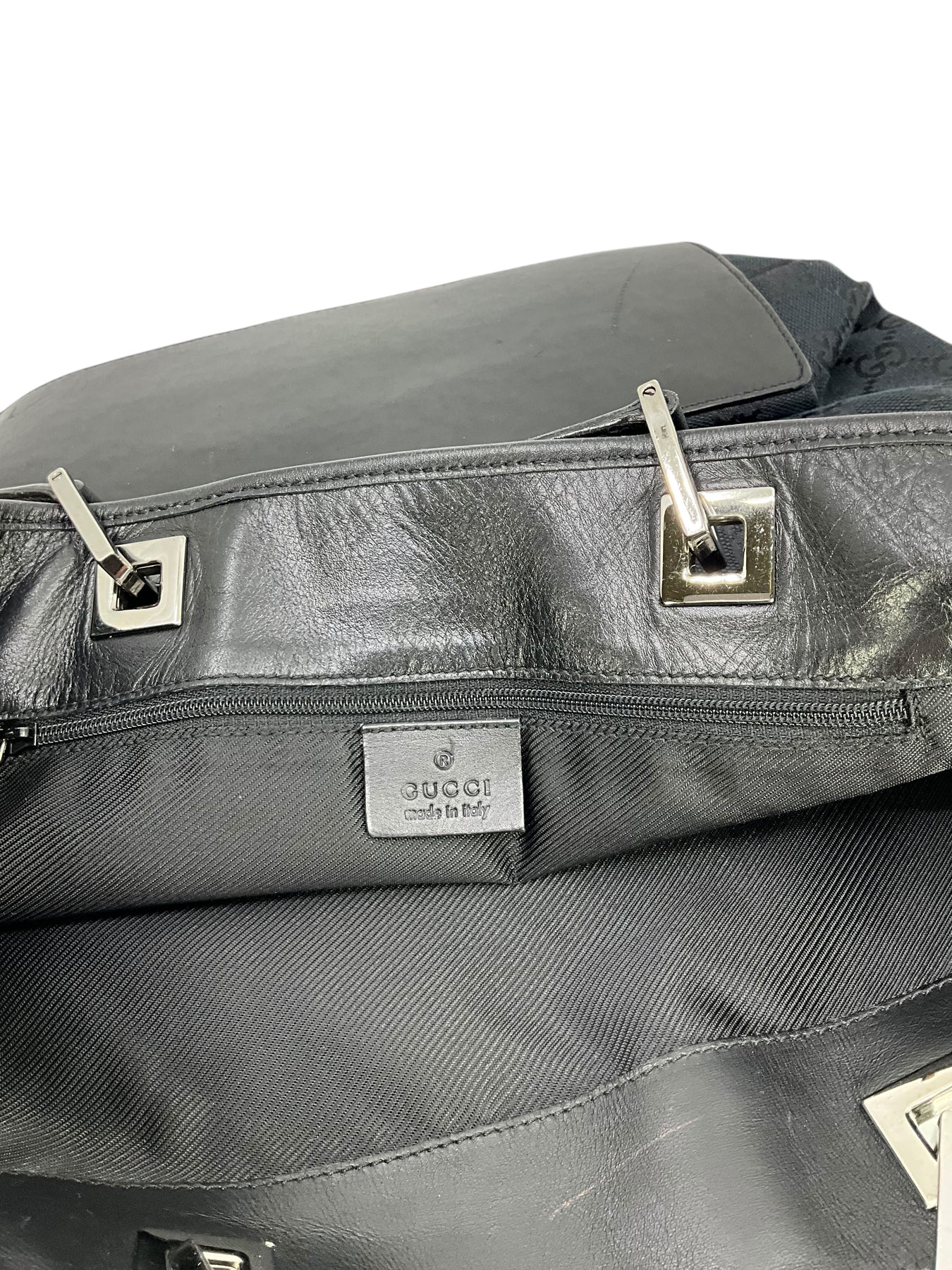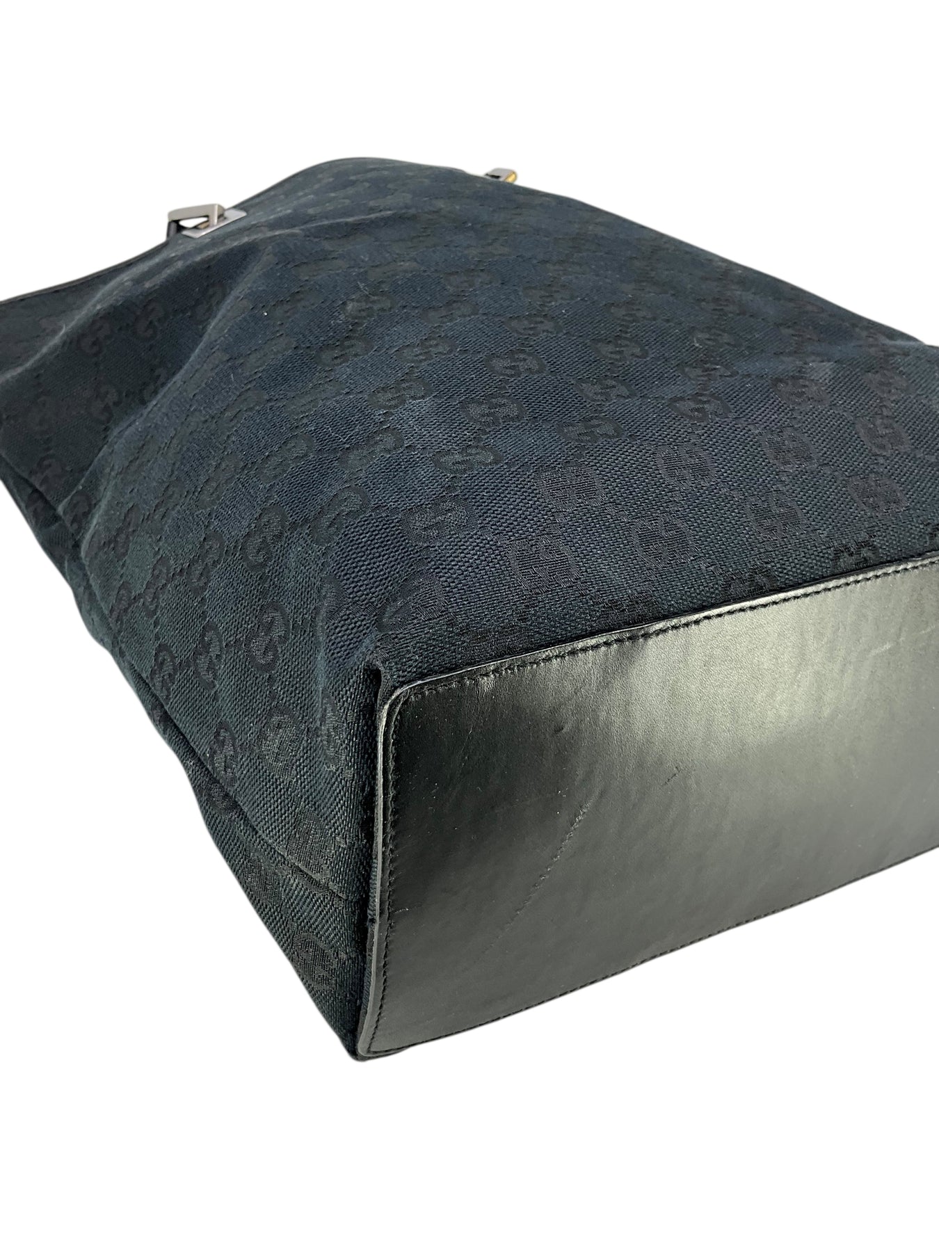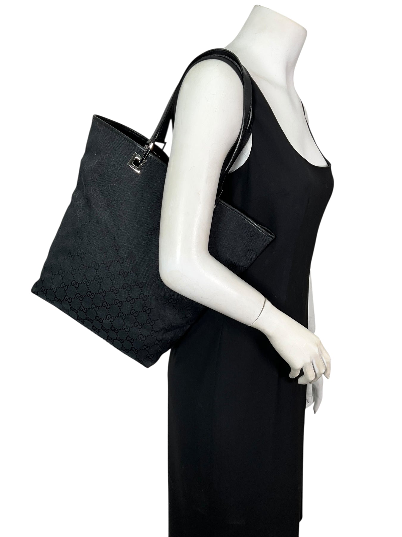 We guarantee the authenticity of this classic Gucci Vintage Monogram Canvas Tote Bag featuring black monogram canvas with a black leather trim and silver-tone hardware. This signature tote has dual flat leather shoulder straps and logo-engraved detailing on the hardware.