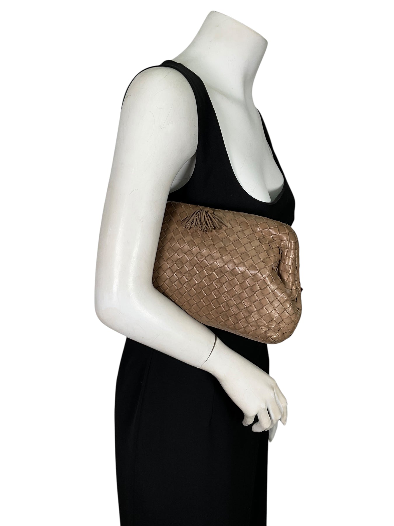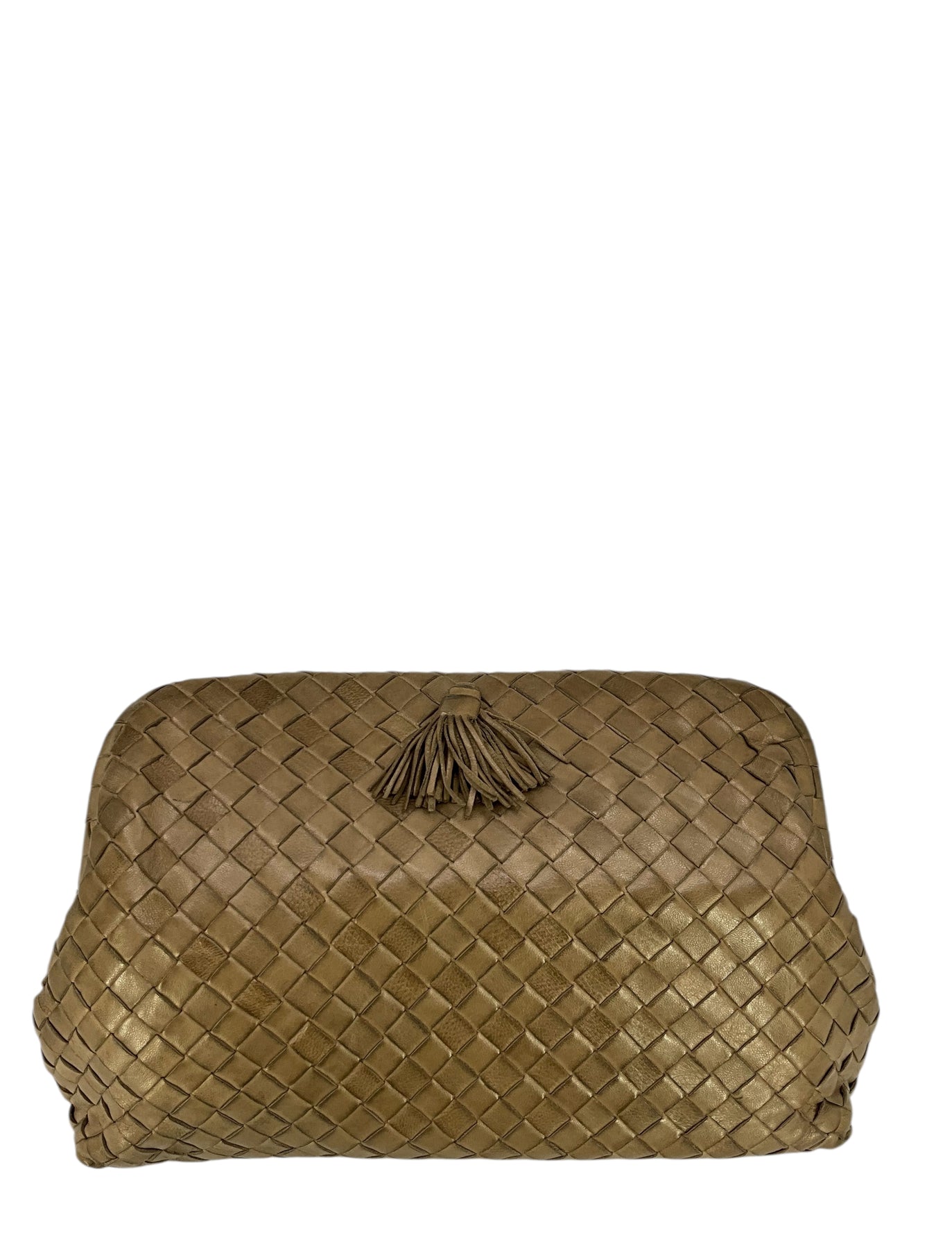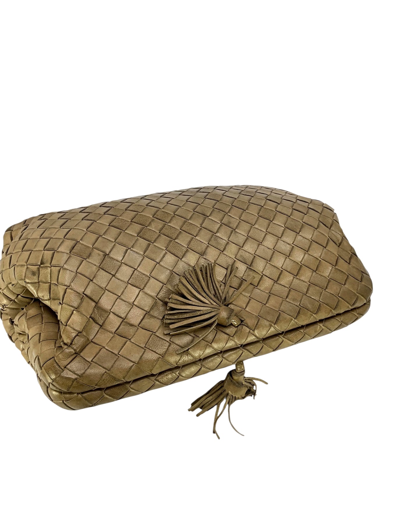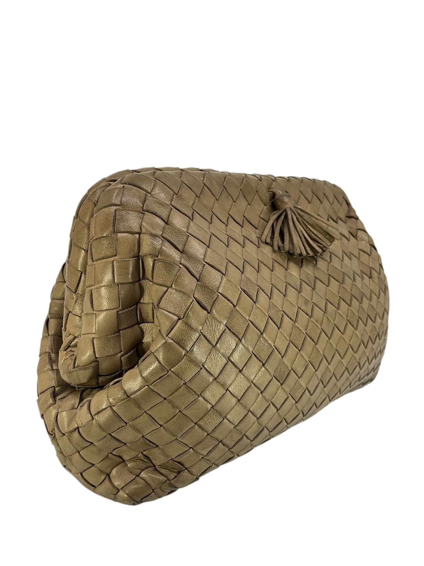 This authentic Bottega Veneta Vintage Intrecciato Framed Clutch Bag is crafted from iconic taupe tightly woven leather. It features a tassel accent and a secure magnetic closure that opens to a smooth dark brown leather lining with a zipper pocket.