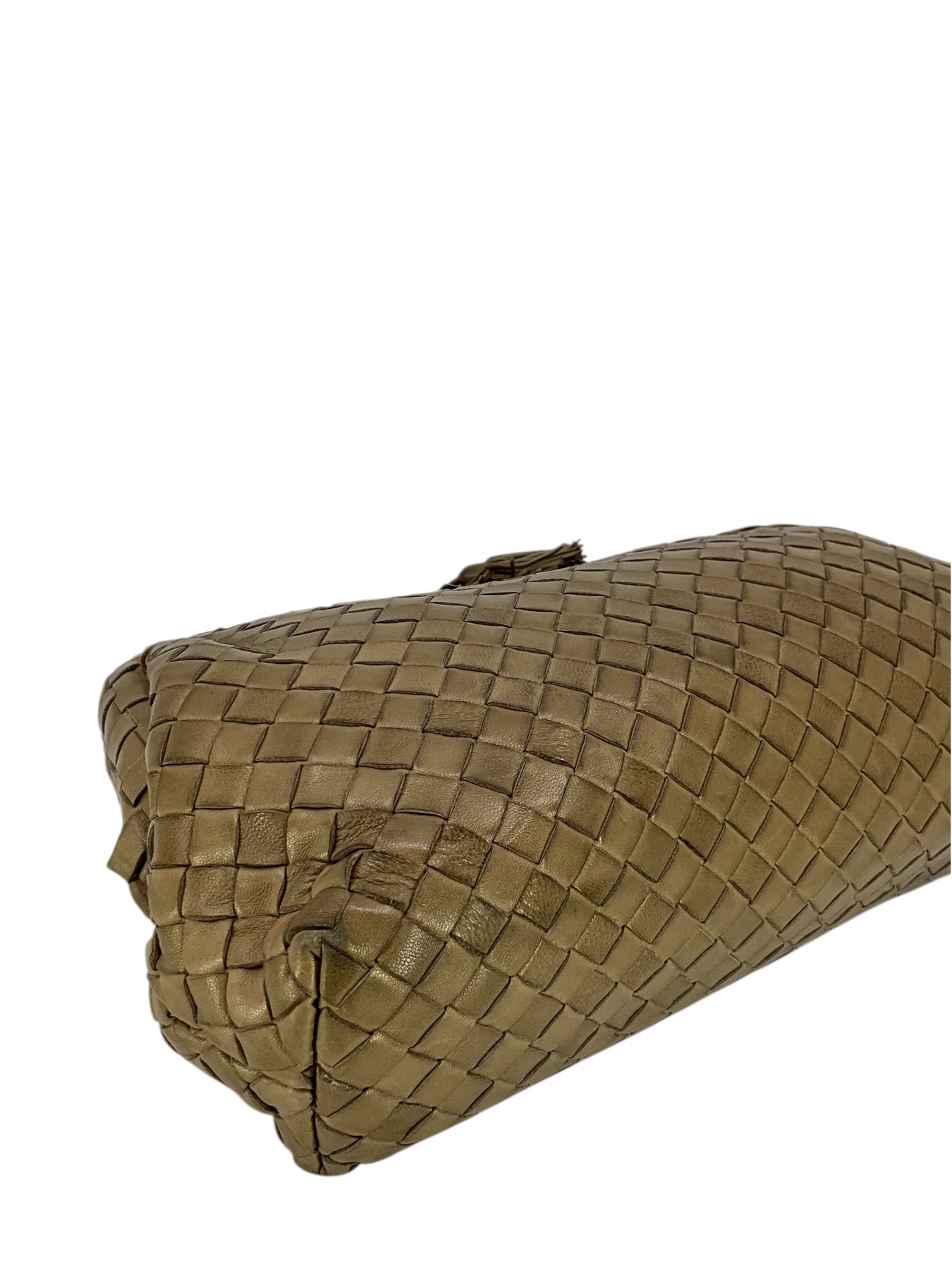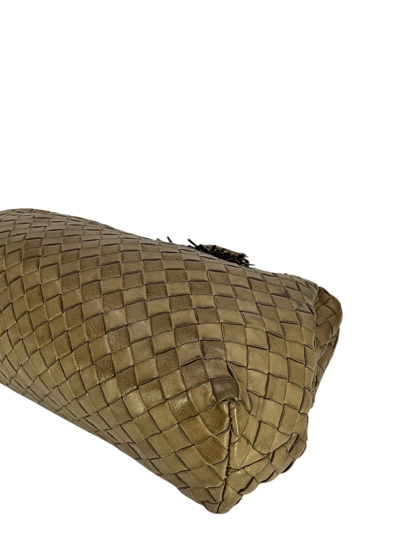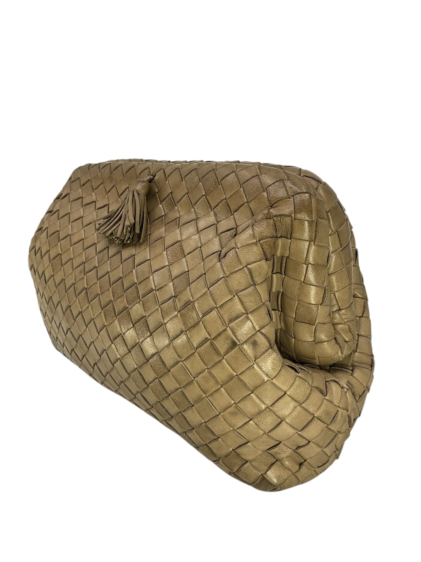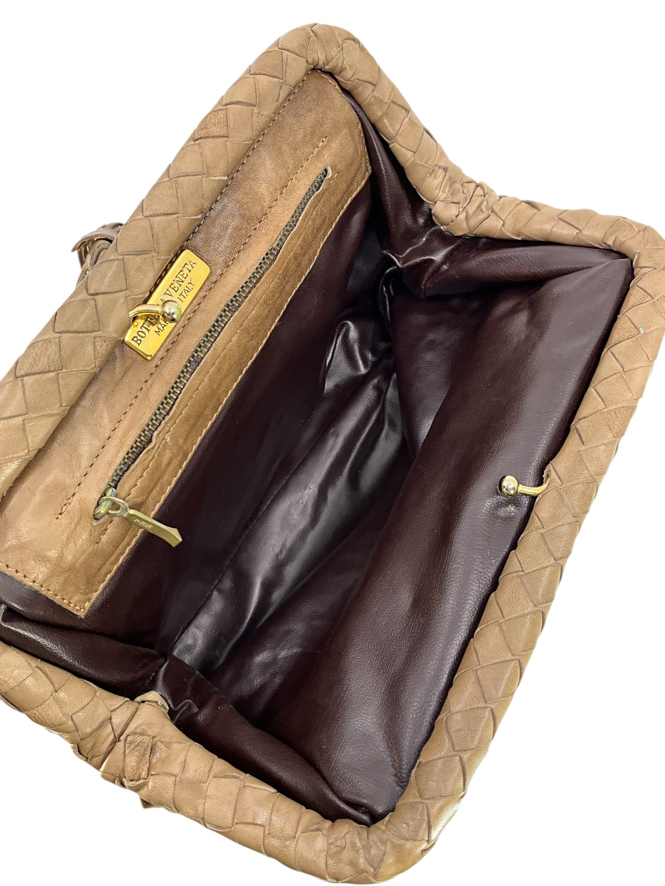 This authentic Bottega Veneta Vintage Intrecciato Framed Clutch Bag is crafted from iconic taupe tightly woven leather. It features a tassel accent and a secure magnetic closure that opens to a smooth dark brown leather lining with a zipper pocket.