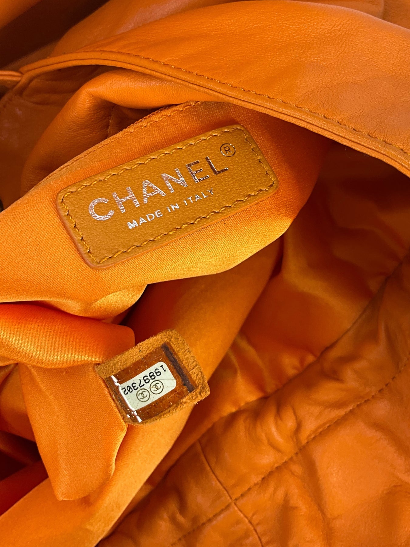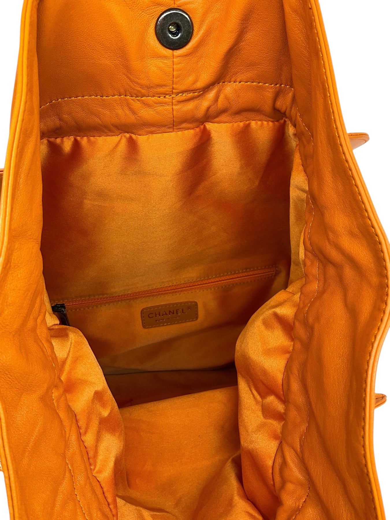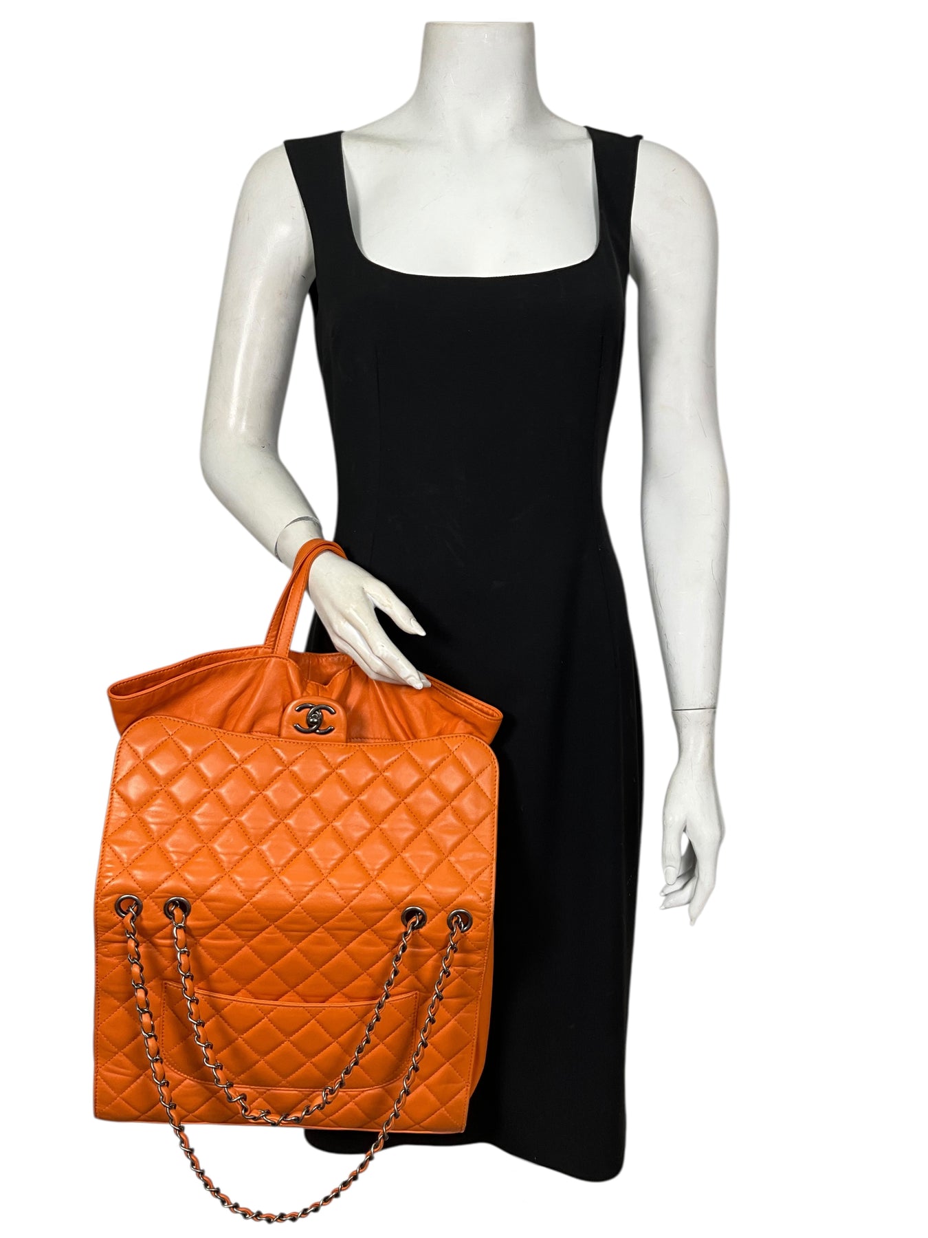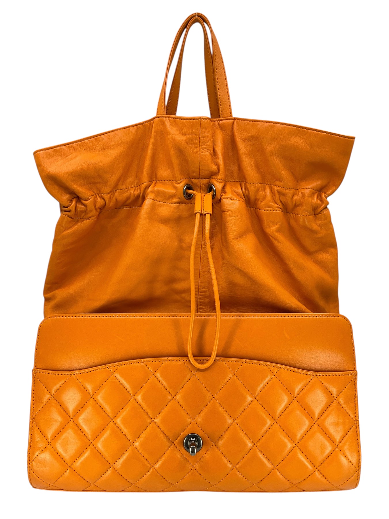 We guarantee the authenticity of this 2-in-1 Chanel Grocery by Chanel Drawstring Flap Bag from the 2014 Fall Runway show crafted in supple orange diamond quilted lambskin leather and gunmetal hardware. This iconic bag features a chain link and leather shoulder strap that can be worn long or doubled, an exterior rear pocket and a single front flap with signature CC turn lock closure that can expand into a unique drawstring shopping tote.