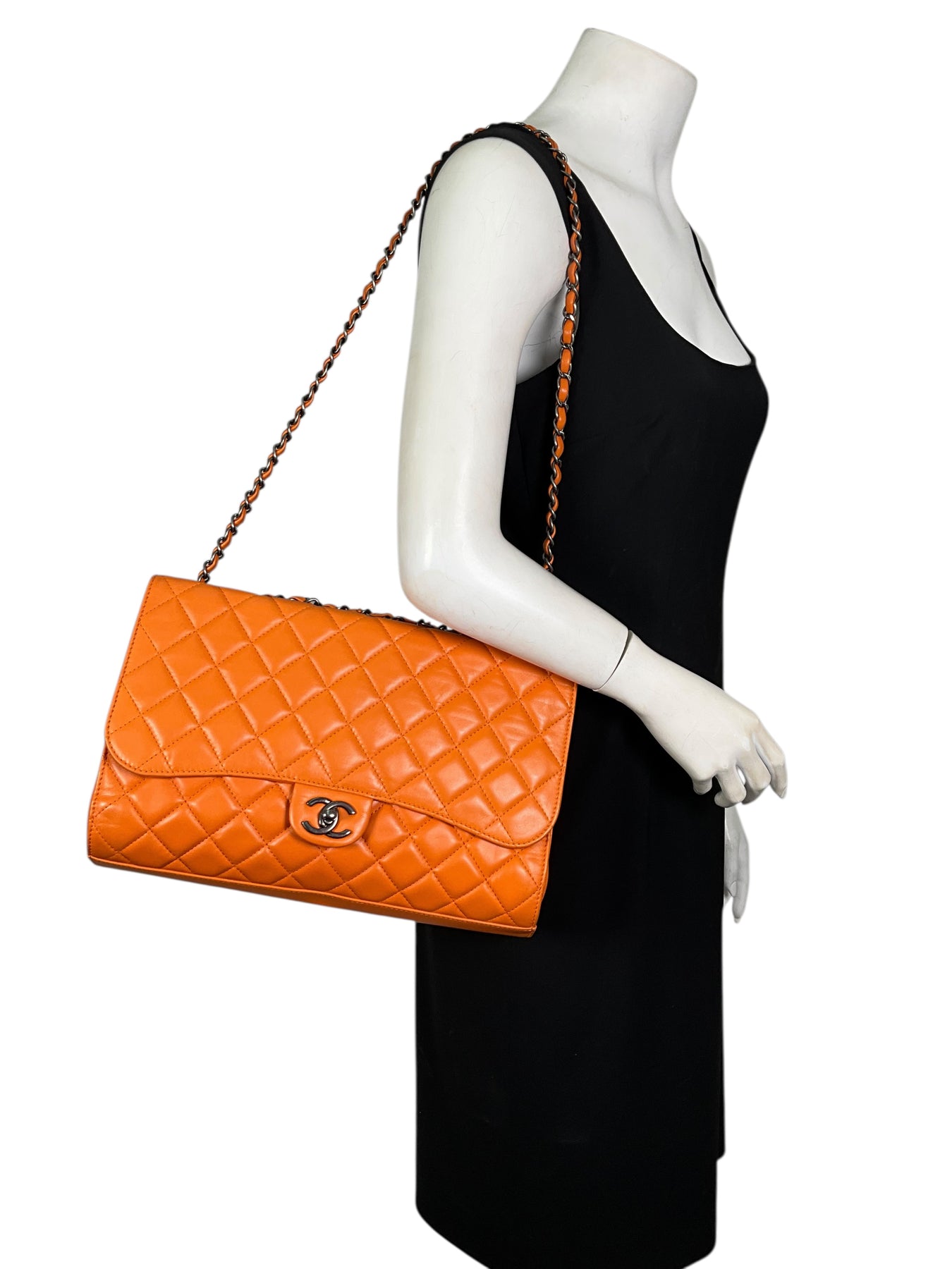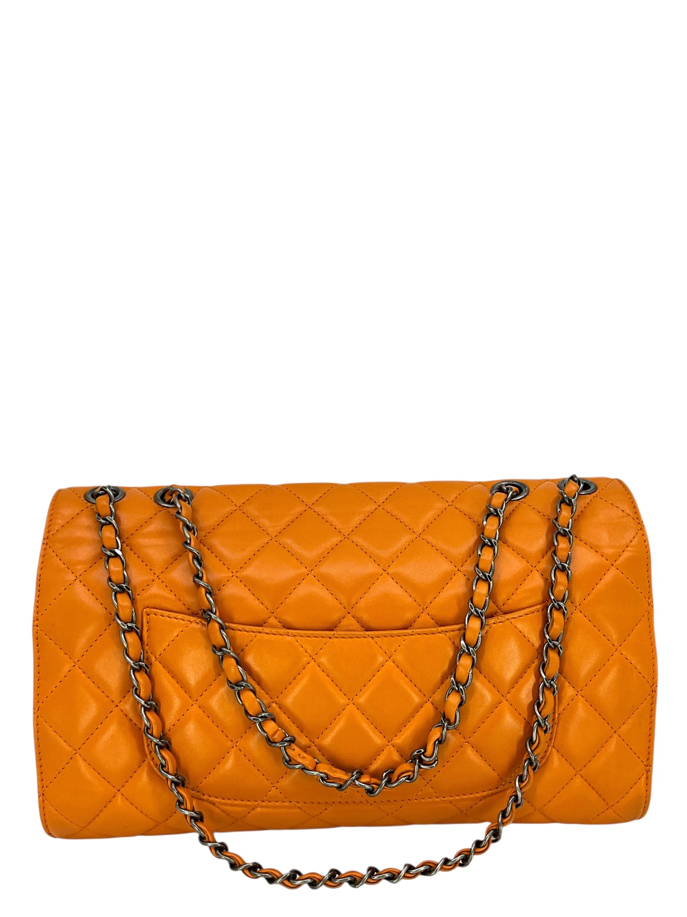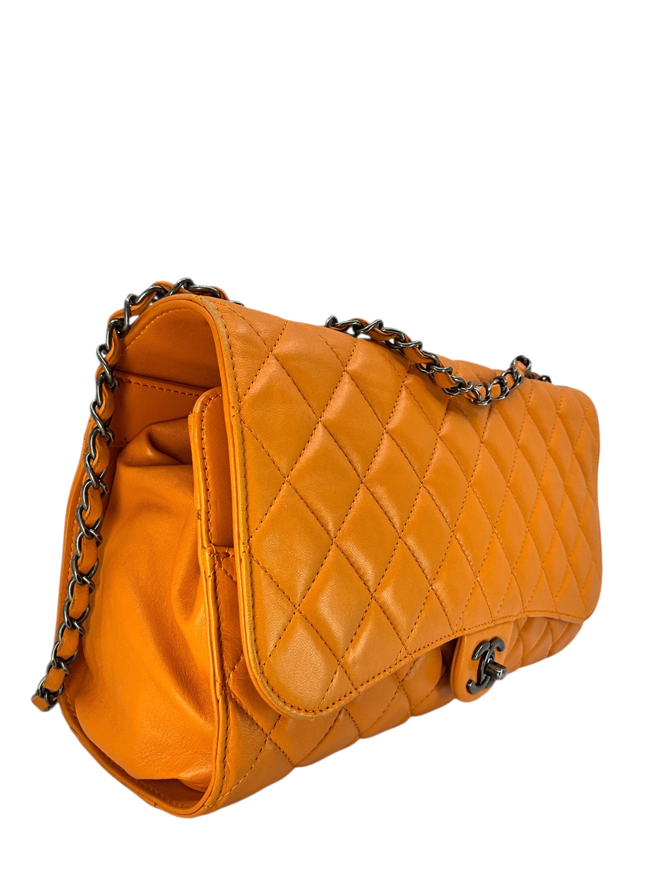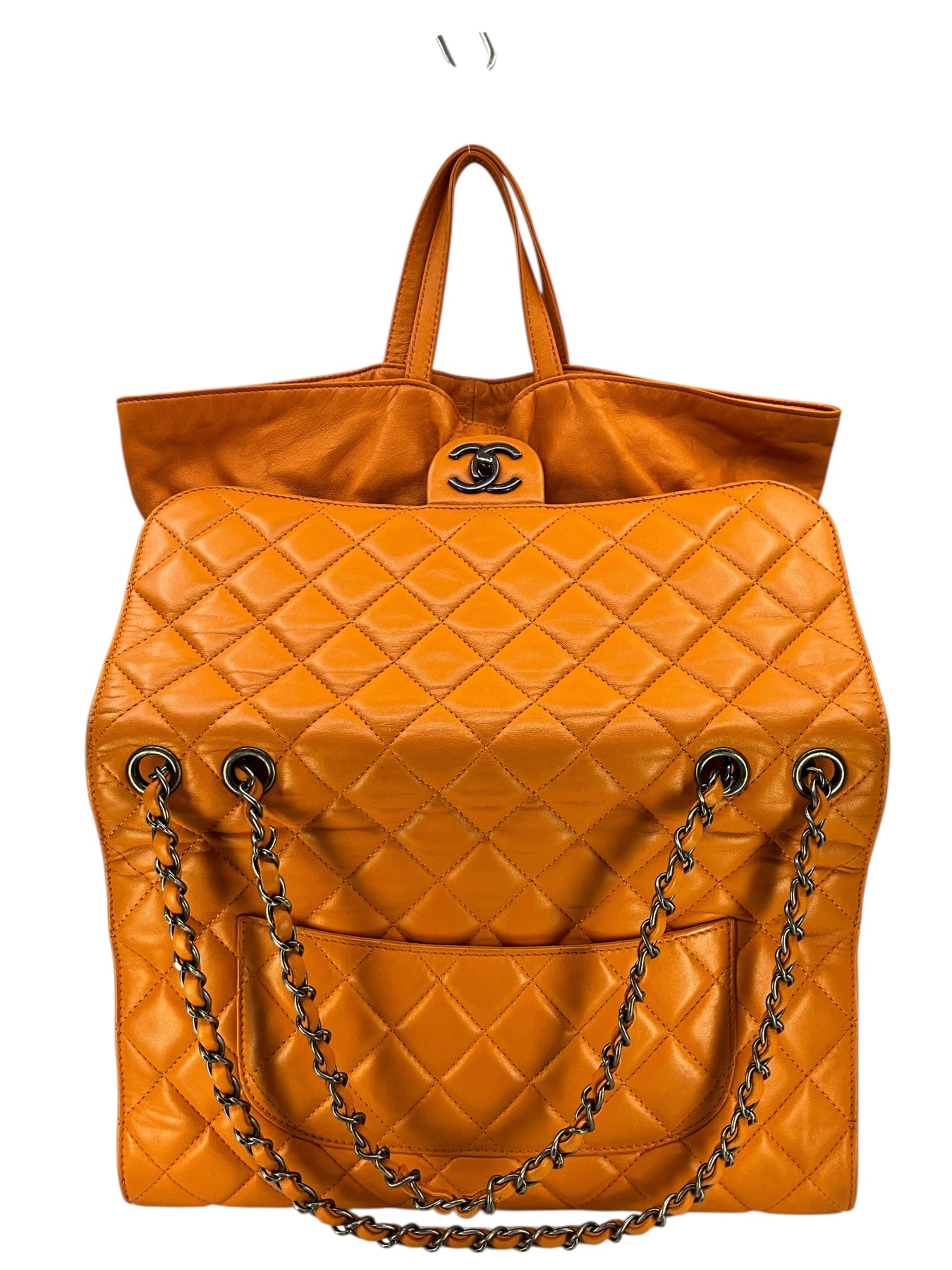 We guarantee the authenticity of this 2-in-1 Chanel Grocery by Chanel Drawstring Flap Bag from the 2014 Fall Runway show crafted in supple orange diamond quilted lambskin leather and gunmetal hardware. This iconic bag features a chain link and leather shoulder strap that can be worn long or doubled, an exterior rear pocket and a single front flap with signature CC turn lock closure that can expand into a unique drawstring shopping tote.