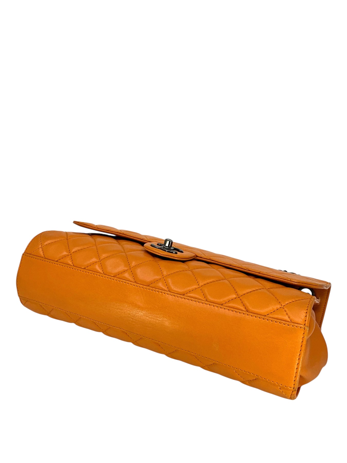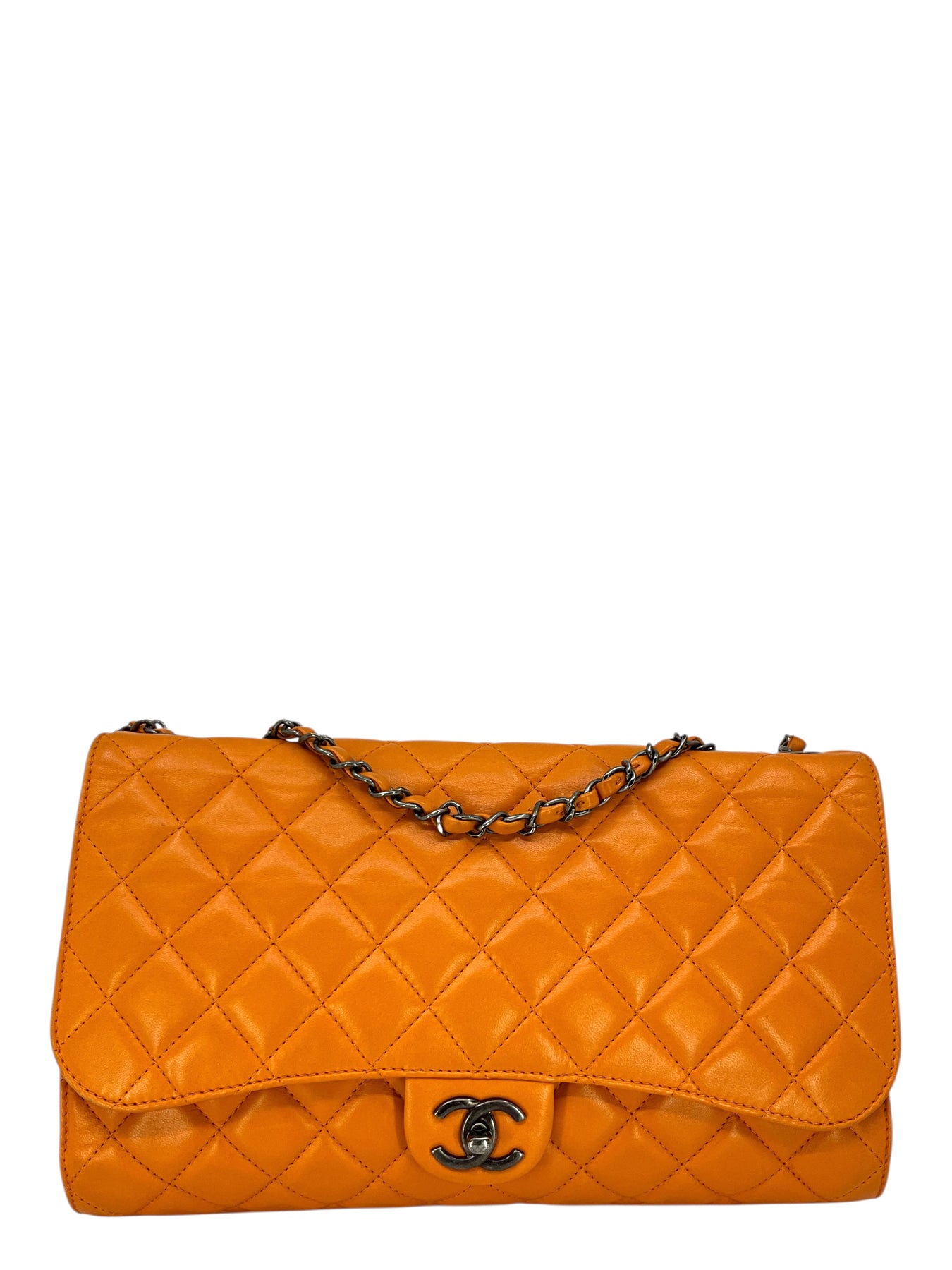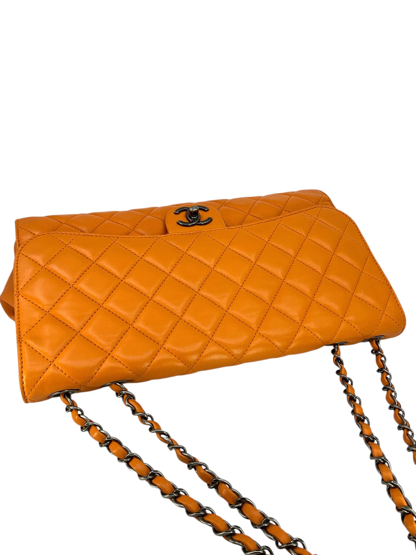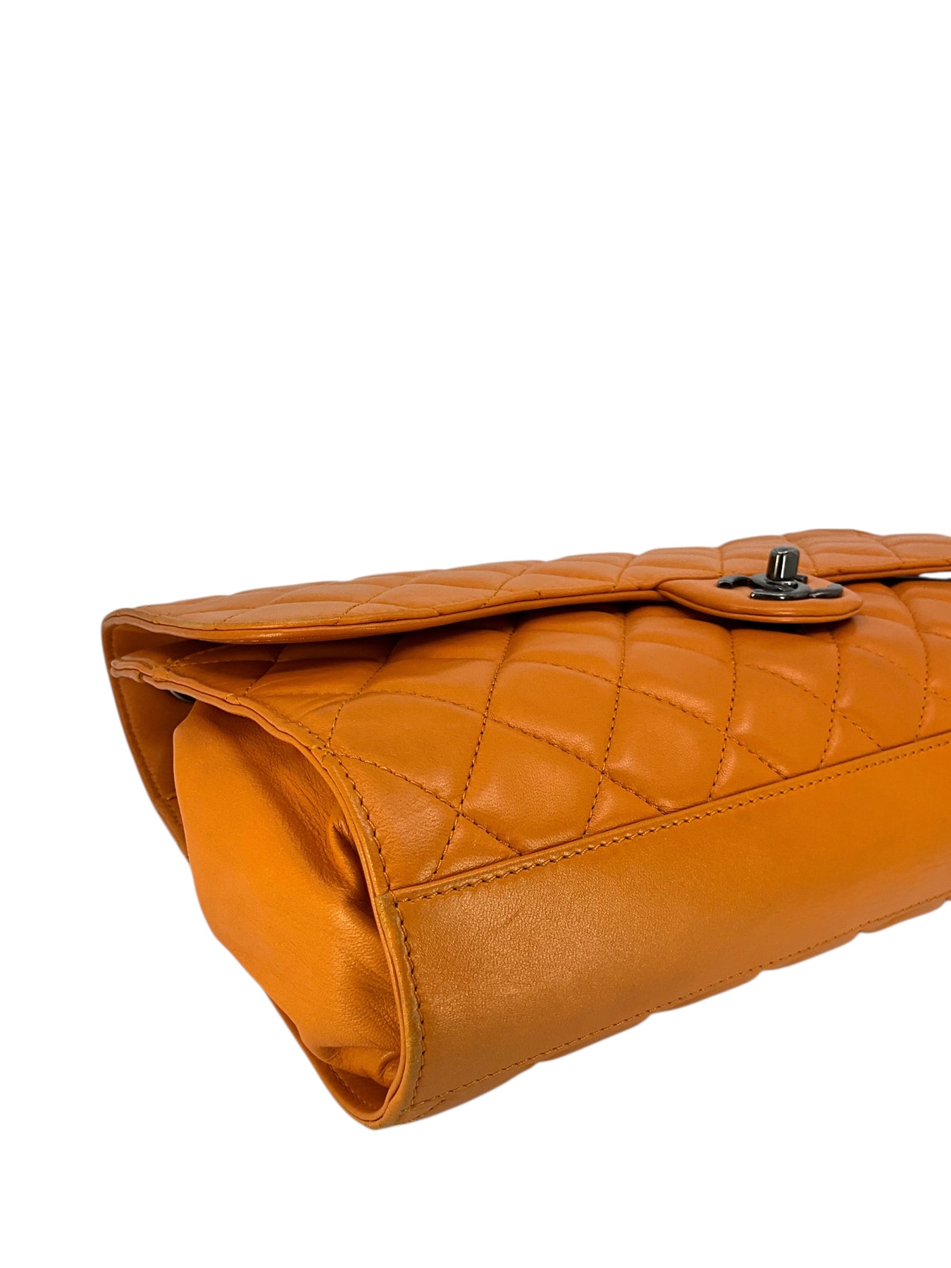 We guarantee the authenticity of this 2-in-1 Chanel Grocery by Chanel Drawstring Flap Bag from the 2014 Fall Runway show crafted in supple orange diamond quilted lambskin leather and gunmetal hardware. This iconic bag features a chain link and leather shoulder strap that can be worn long or doubled, an exterior rear pocket and a single front flap with signature CC turn lock closure that can expand into a unique drawstring shopping tote.