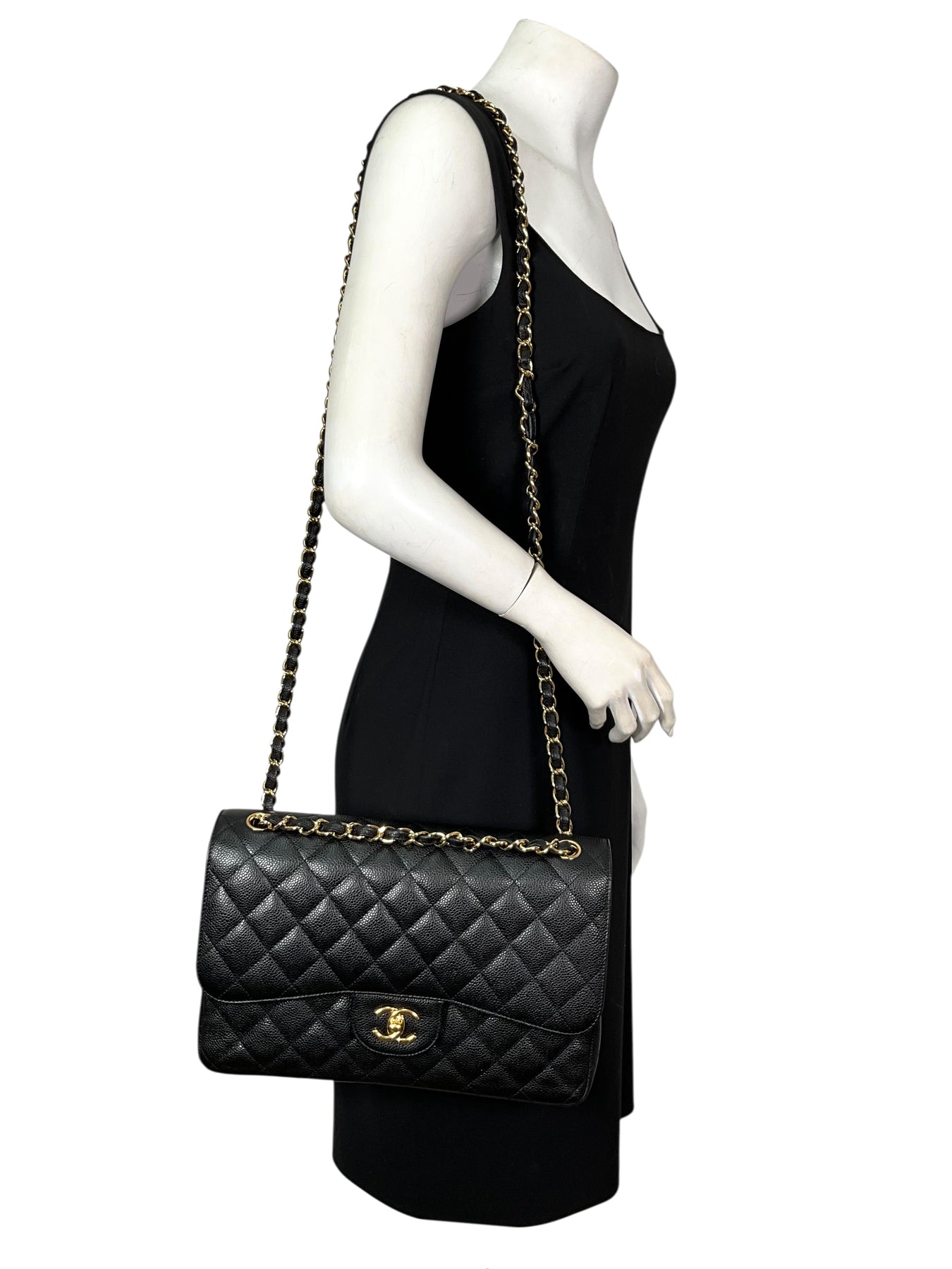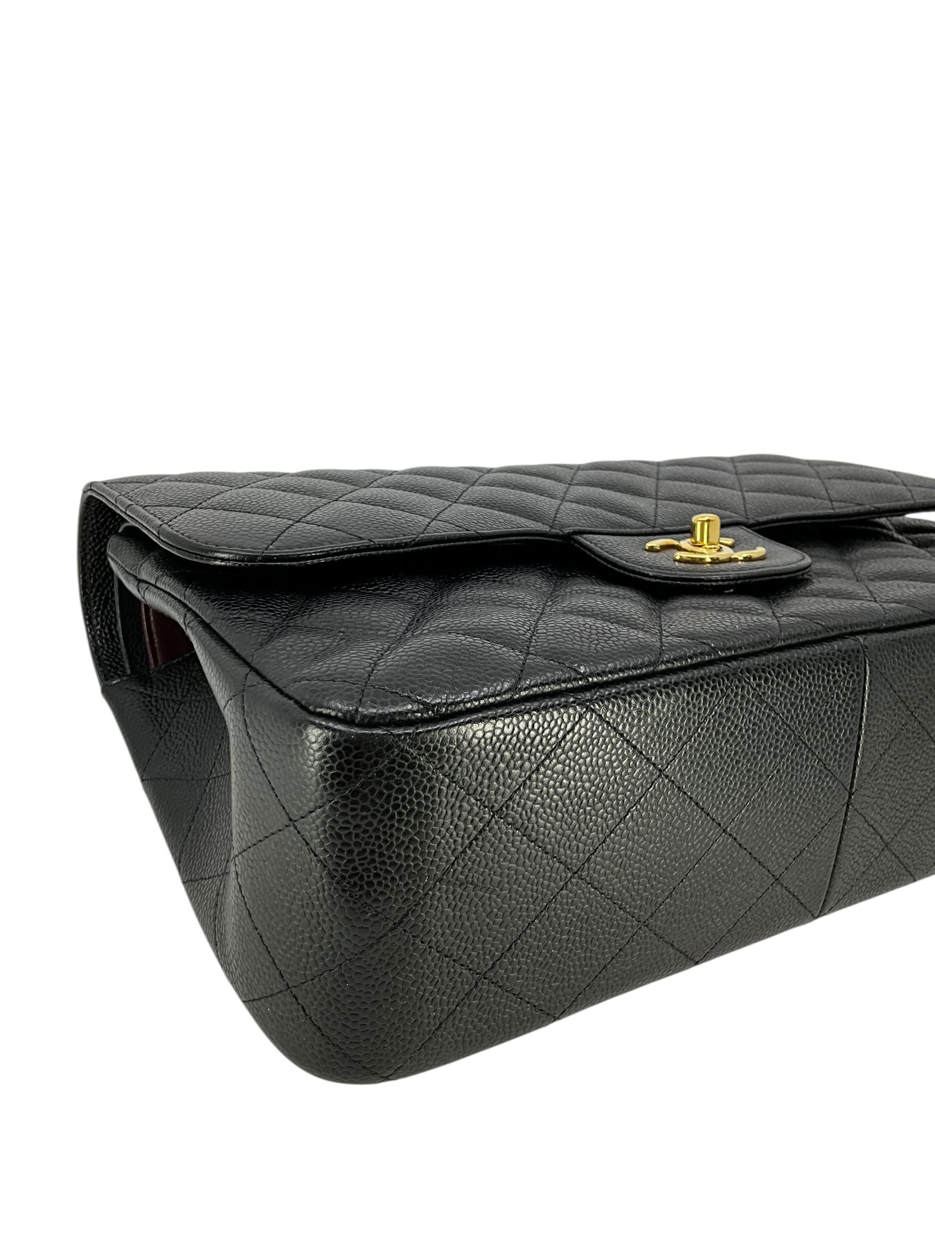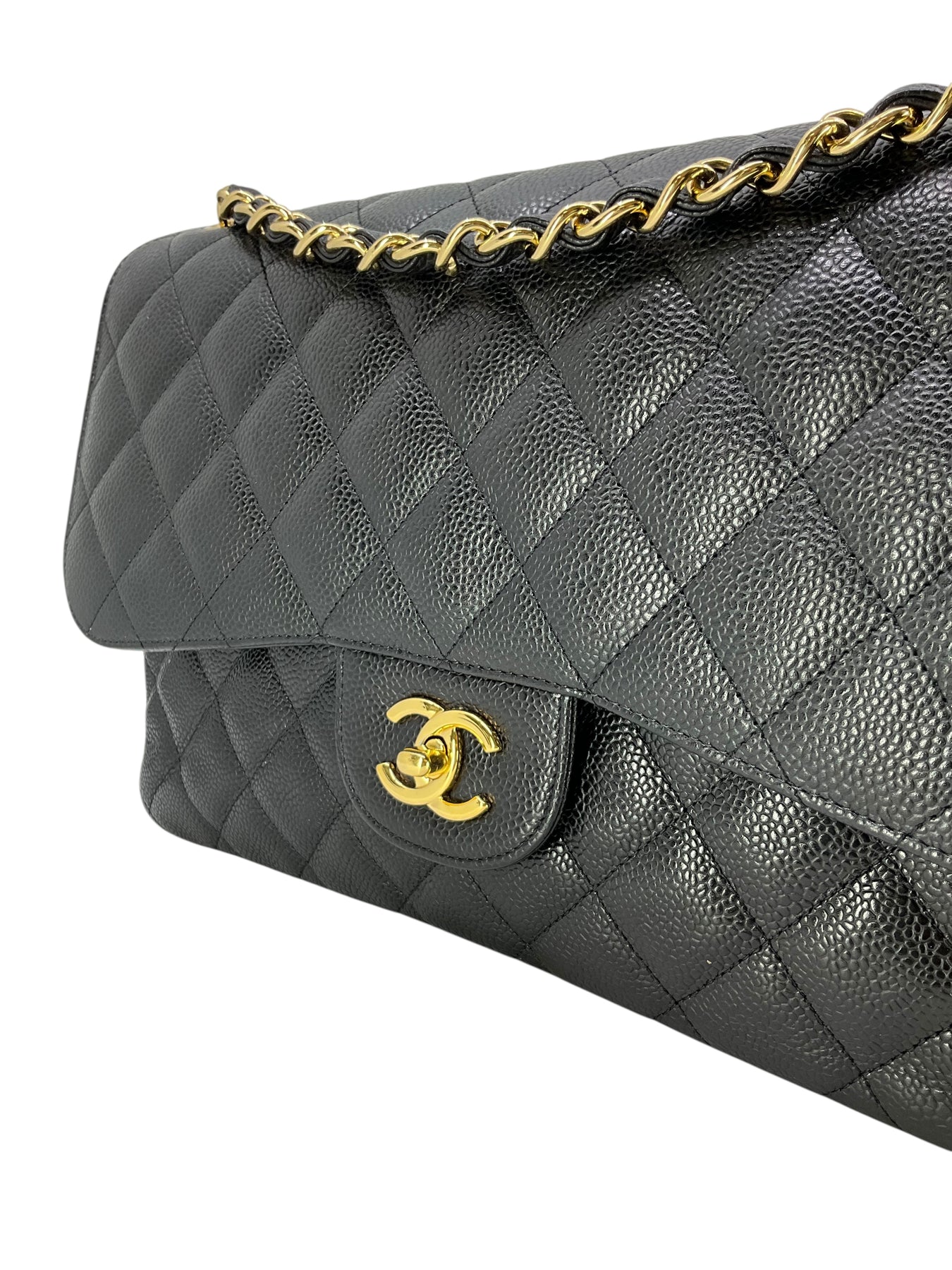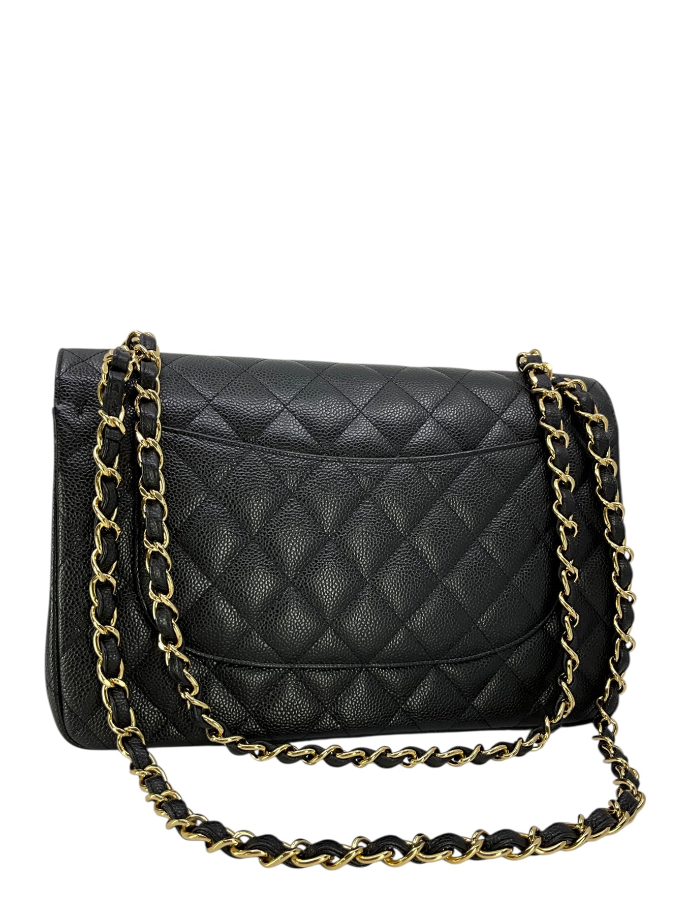 We guarantee the authenticity of this Chanel Quilted Caviar Jumbo Classic Double Flap Bag crafted in black diamond quilted caviar leather and gold-tone hardware. This iconic bag features a chain link and leather shoulder strap that can be worn long or doubled, an exterior rear pocket and a double front flap with signature CC turn lock closure.