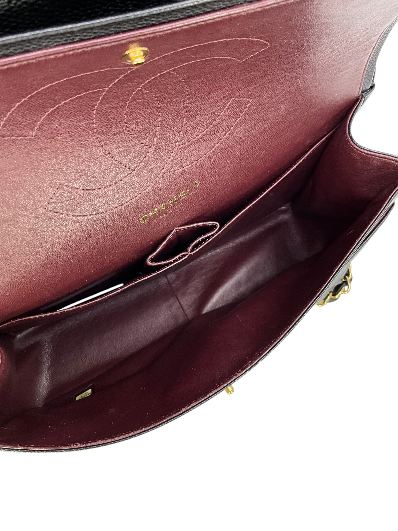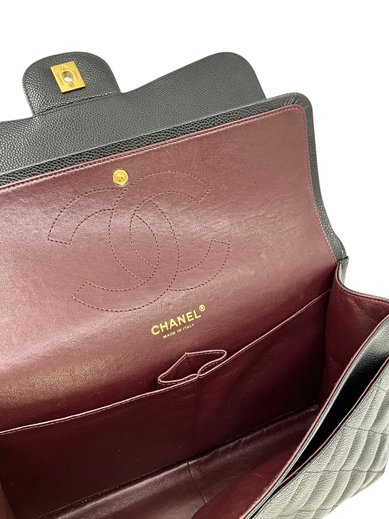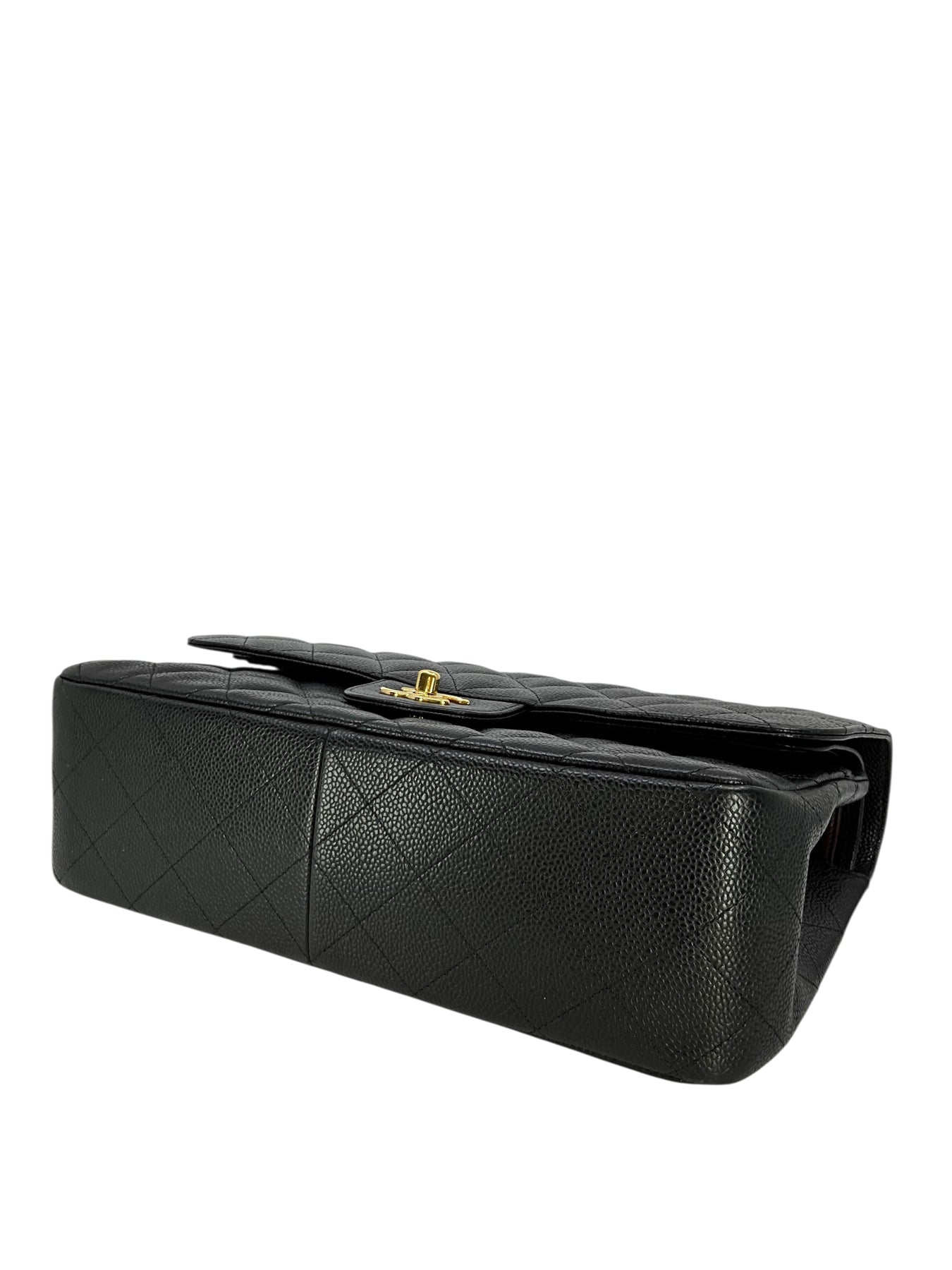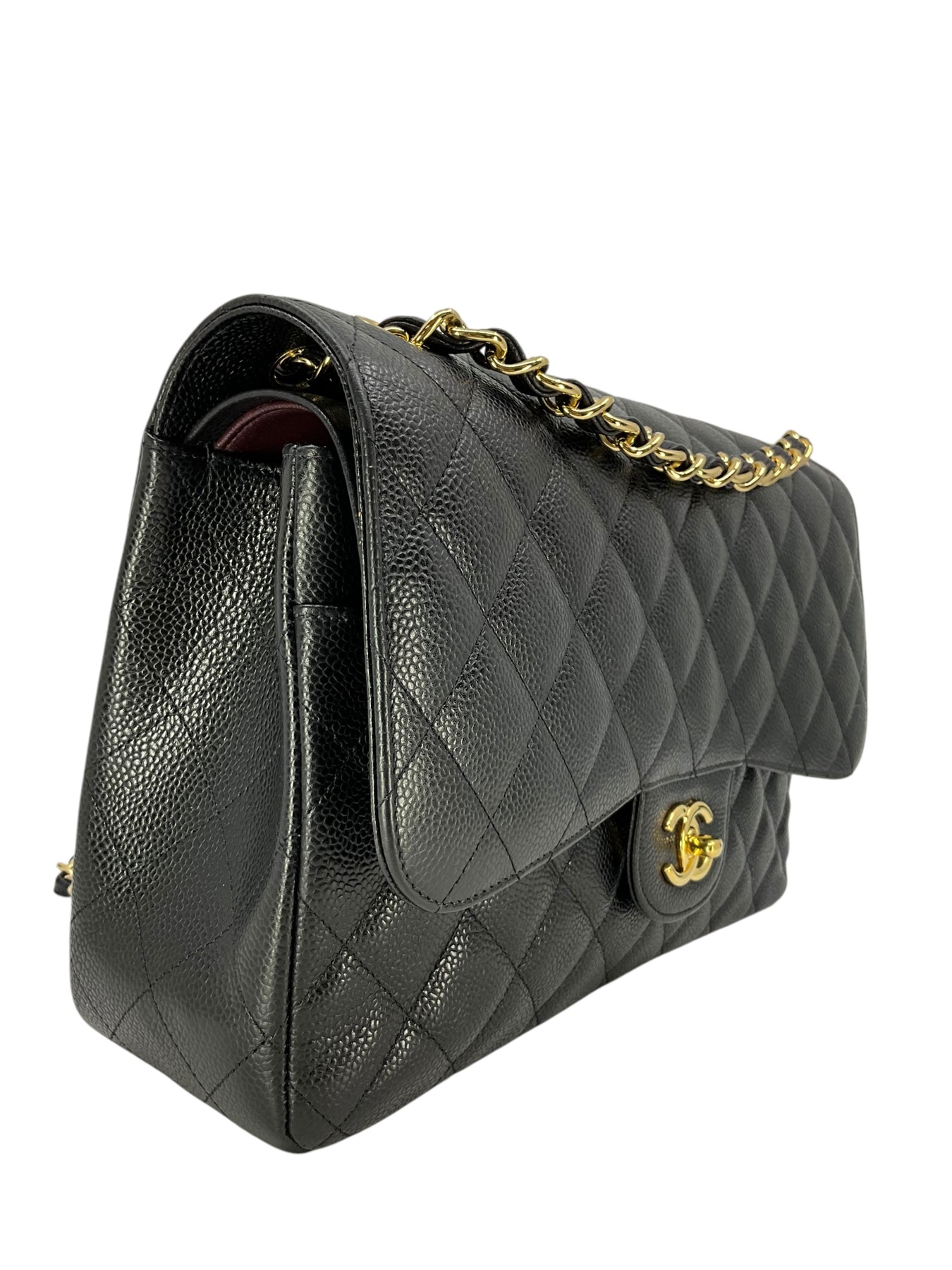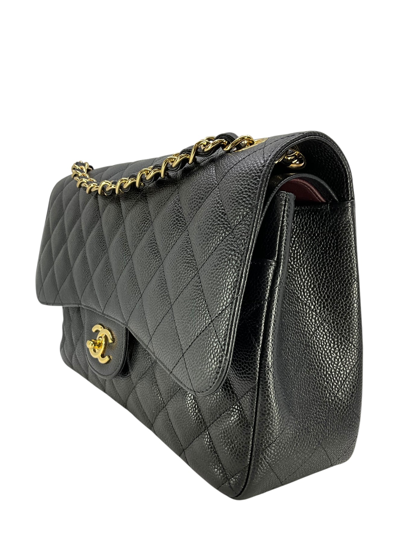 We guarantee the authenticity of this Chanel Quilted Caviar Jumbo Classic Double Flap Bag crafted in black diamond quilted caviar leather and gold-tone hardware. This iconic bag features a chain link and leather shoulder strap that can be worn long or doubled, an exterior rear pocket and a double front flap with signature CC turn lock closure.