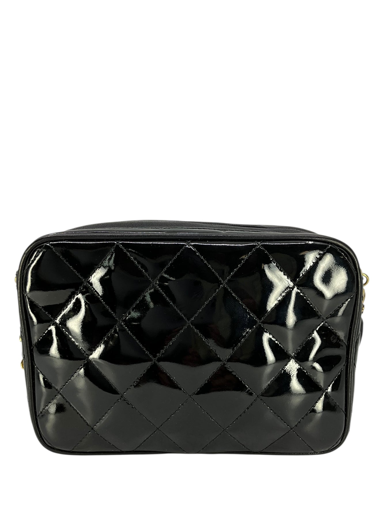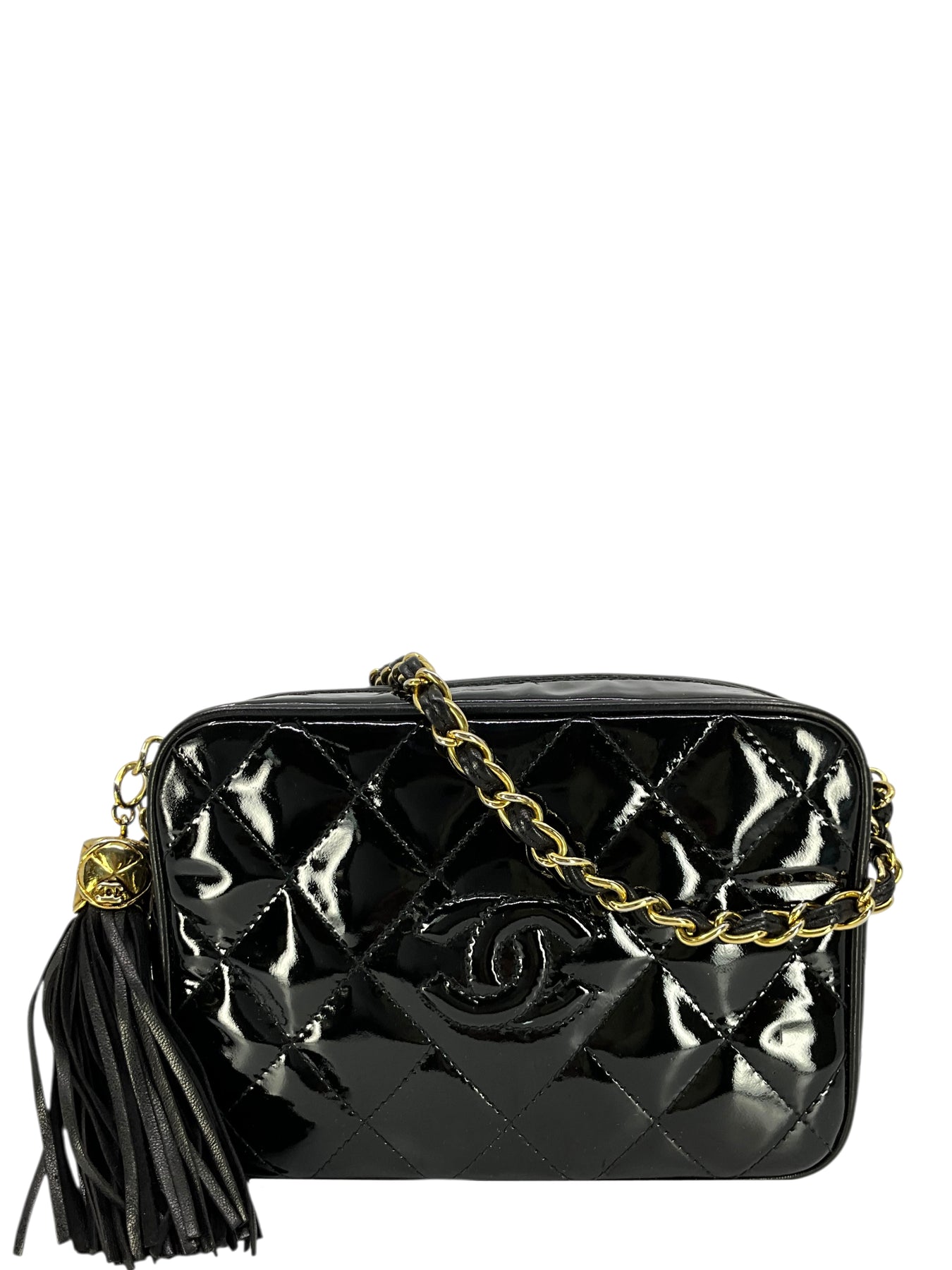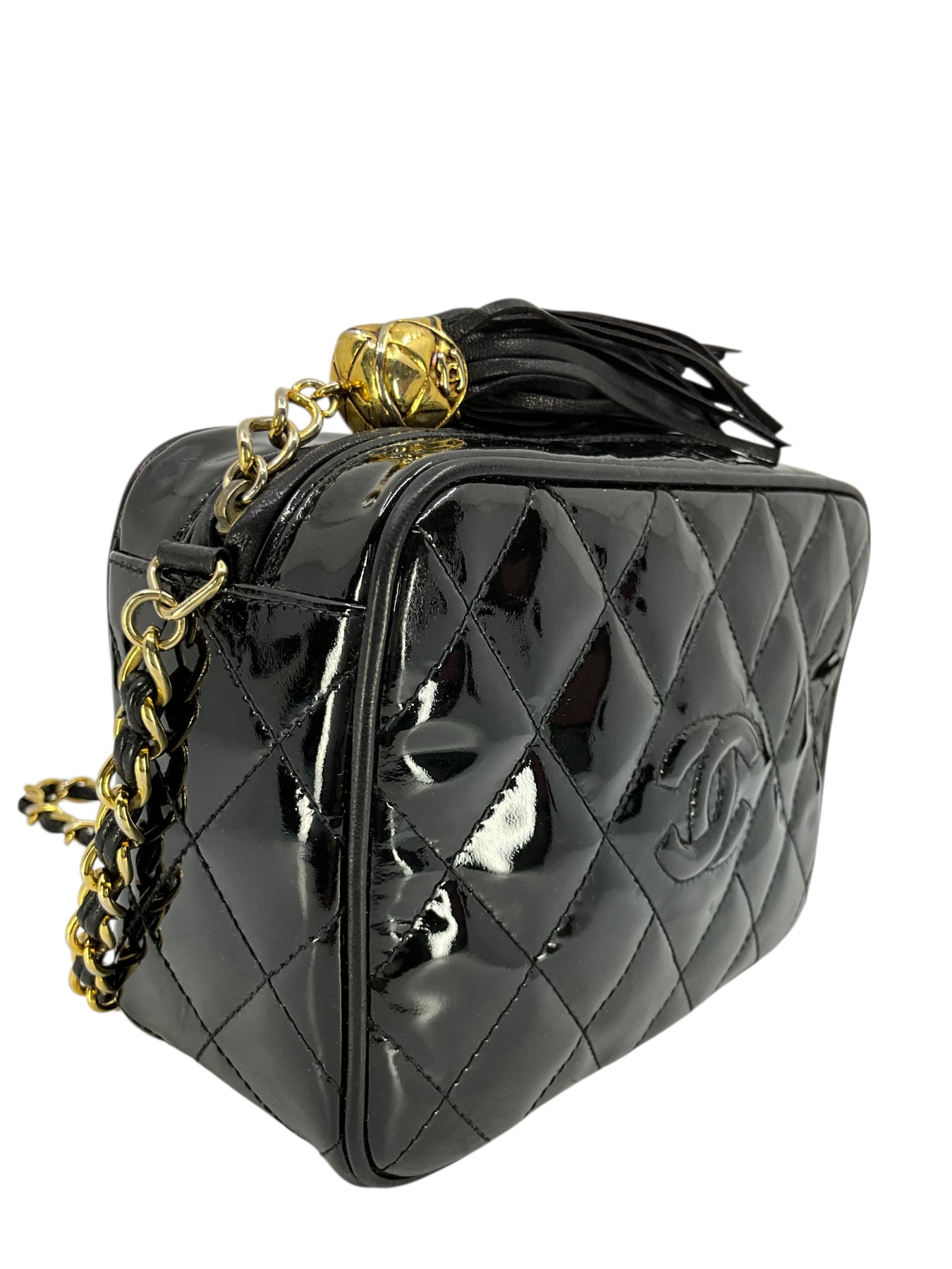 Add to your collection this authentic Chanel Vintage Quilted Patent Leather Tassel Camera Bag crafted from glossy black diamond quilted patent leather and gold-tone hardware. Featuring a chain link shoulder strap threaded with tonal black leather and a signature CC logo engraved tassel zip closure.