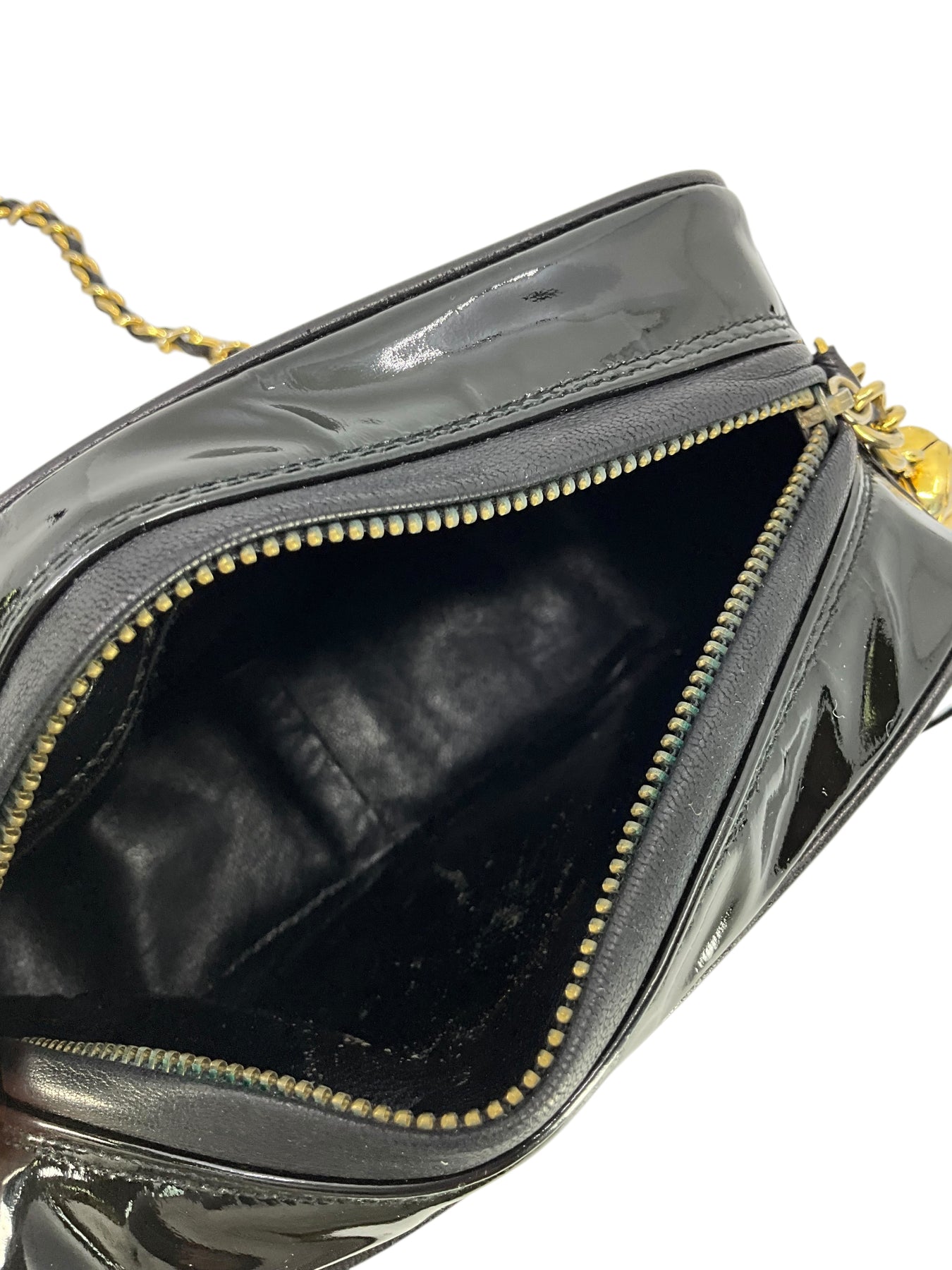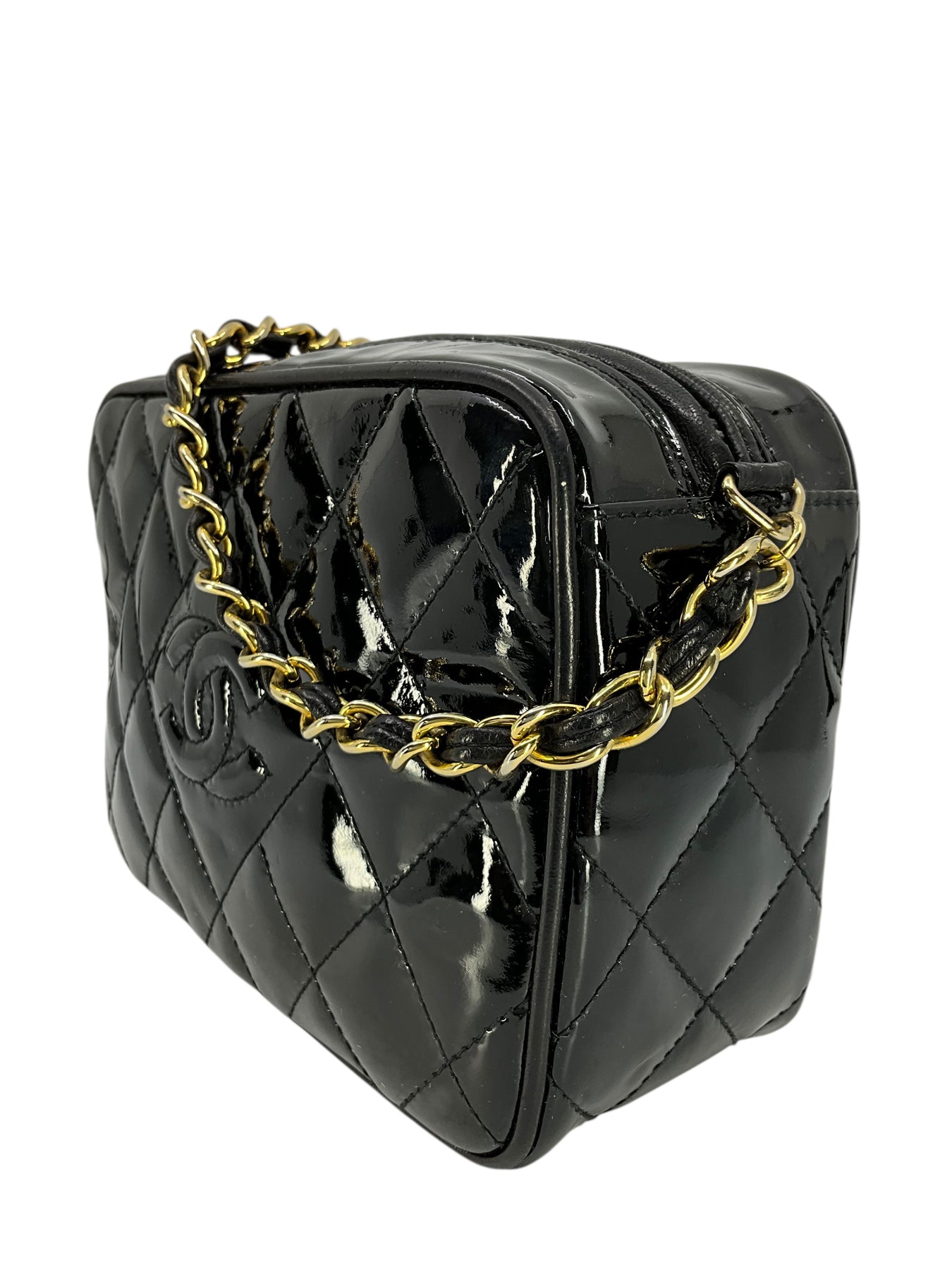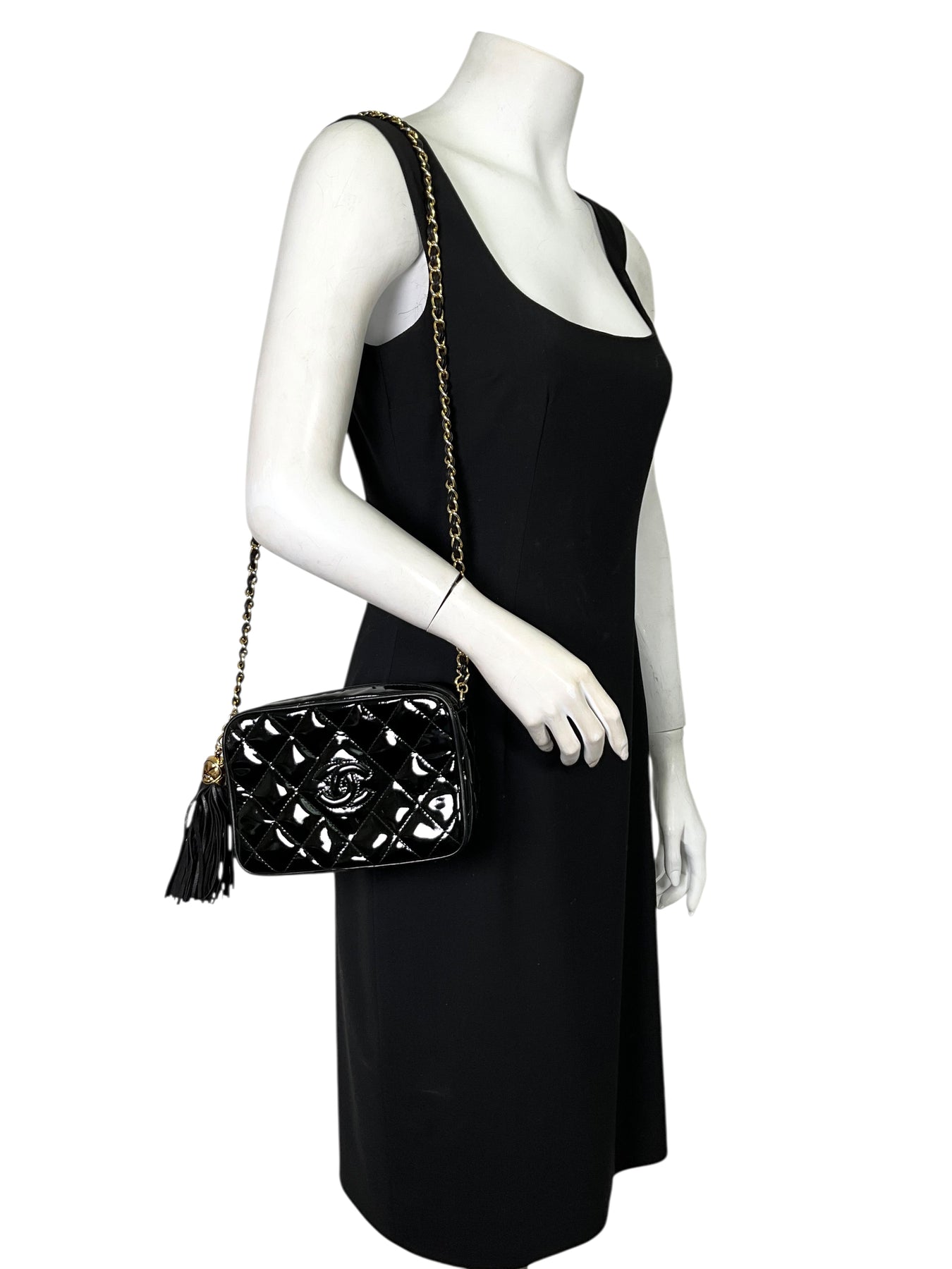 Add to your collection this authentic Chanel Vintage Quilted Patent Leather Tassel Camera Bag crafted from glossy black diamond quilted patent leather and gold-tone hardware. Featuring a chain link shoulder strap threaded with tonal black leather and a signature CC logo engraved tassel zip closure.